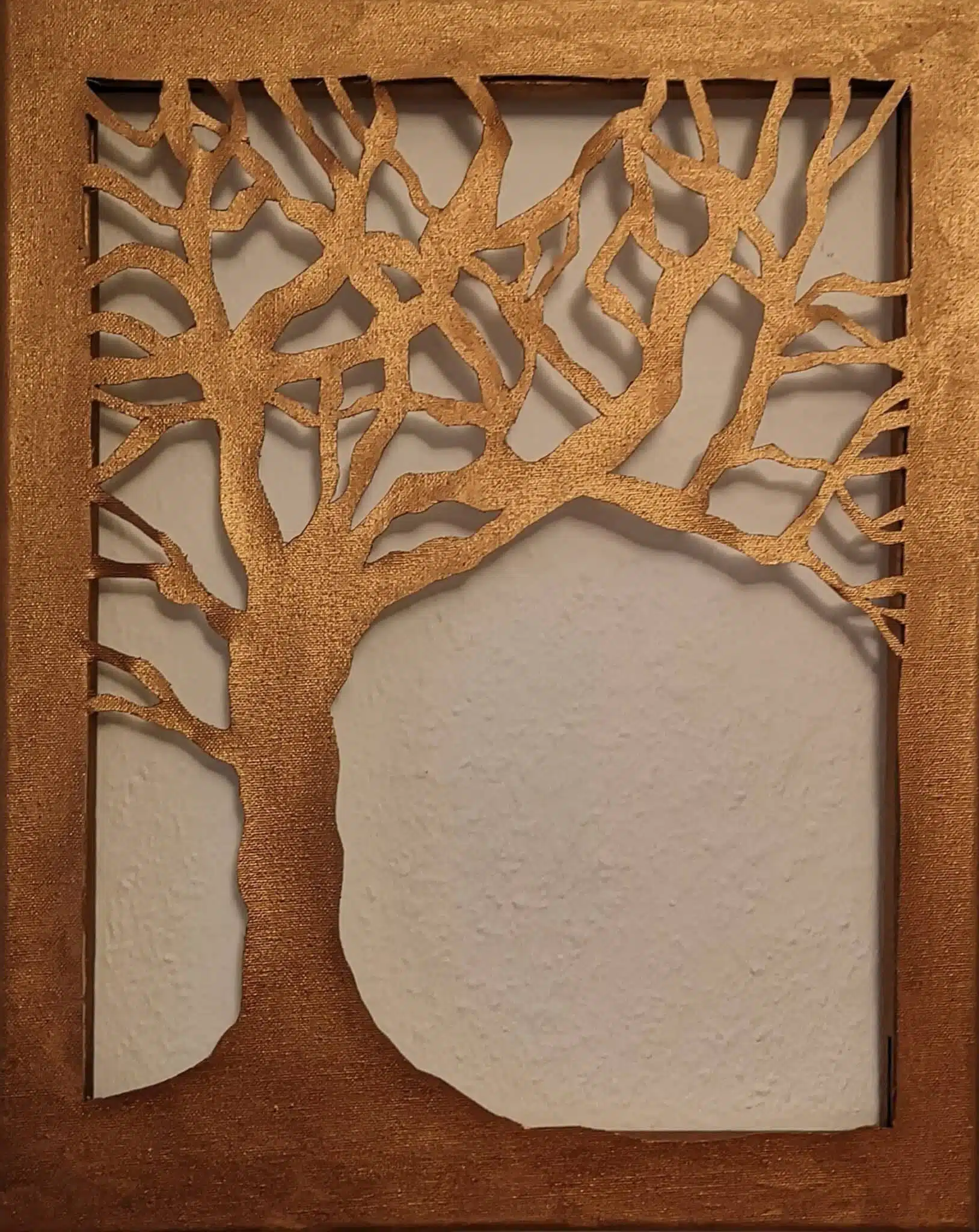 This is an acrylic painting of a bronze tree. The canvas is cut to the shape of the tree itself.