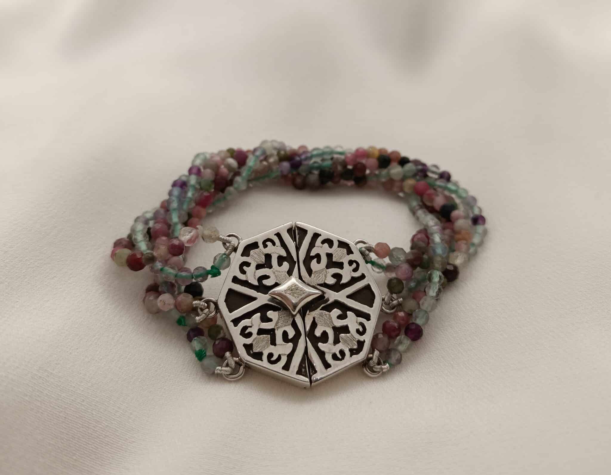 سوار مستلهم من وحدة زخرفة هندسية ونباتية من الفضة الخالصة واحجار التورمالين والفلورايت الطبيعي