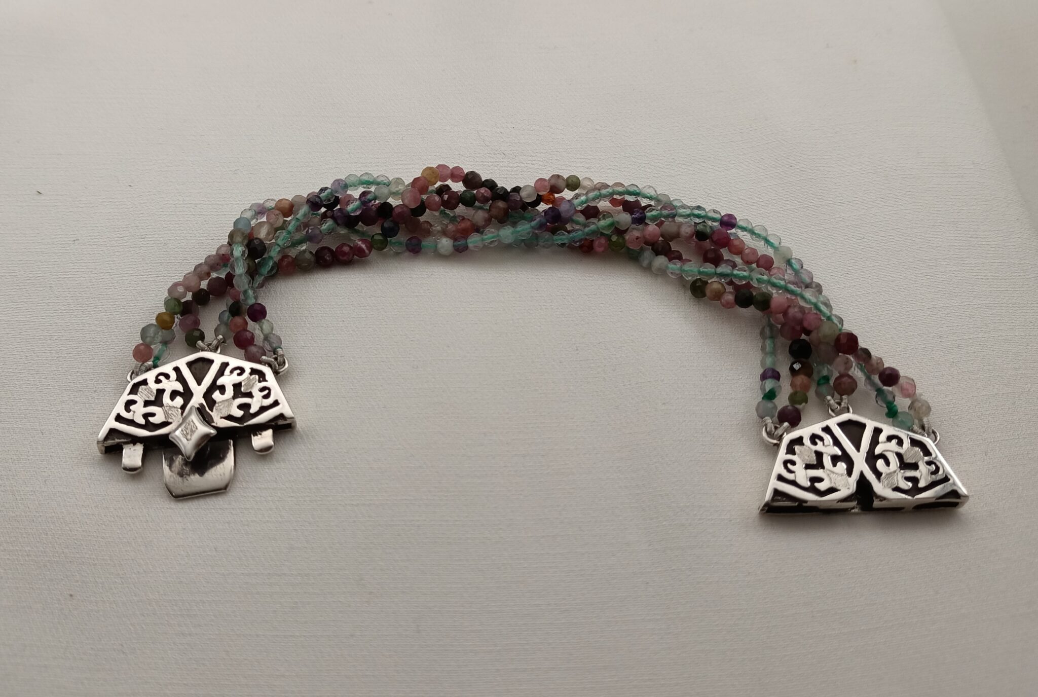 سوار مستلهم من وحدة زخرفة هندسية ونباتية من الفضة الخالصة واحجار التورمالين والفلورايت الطبيعي