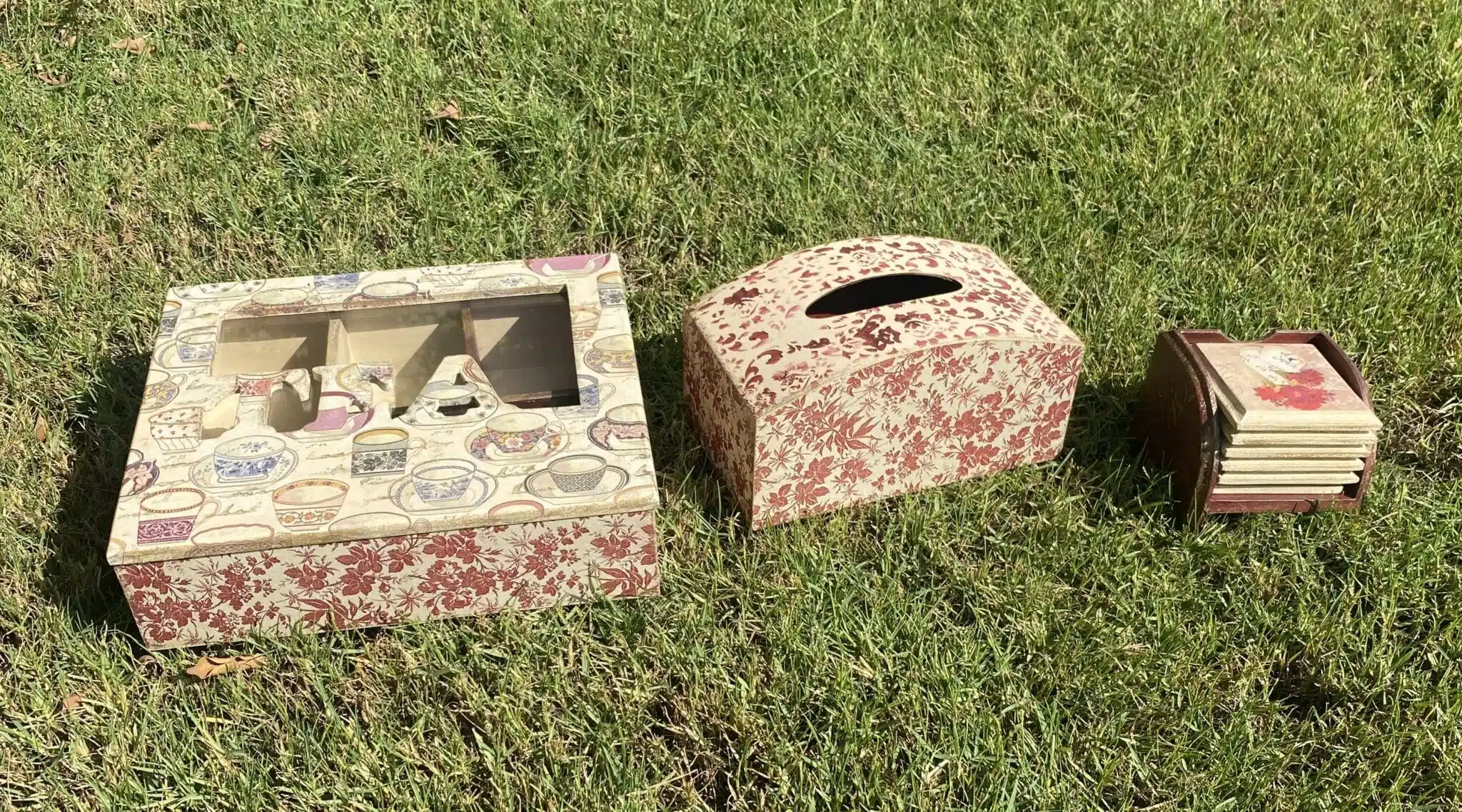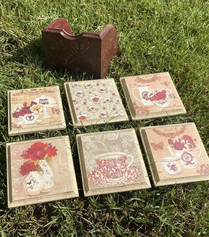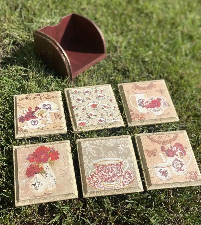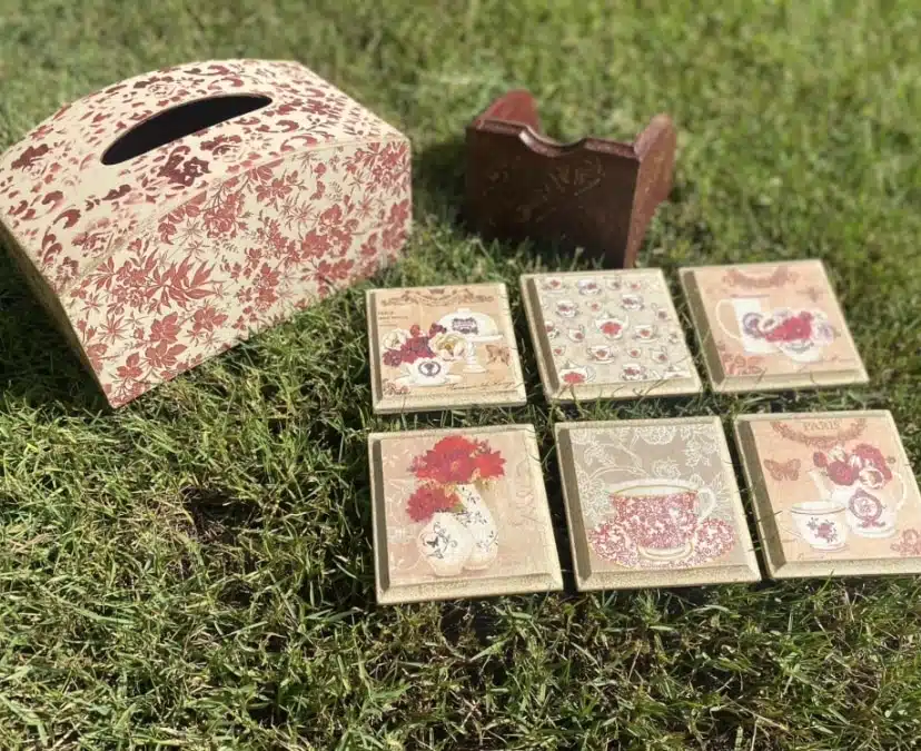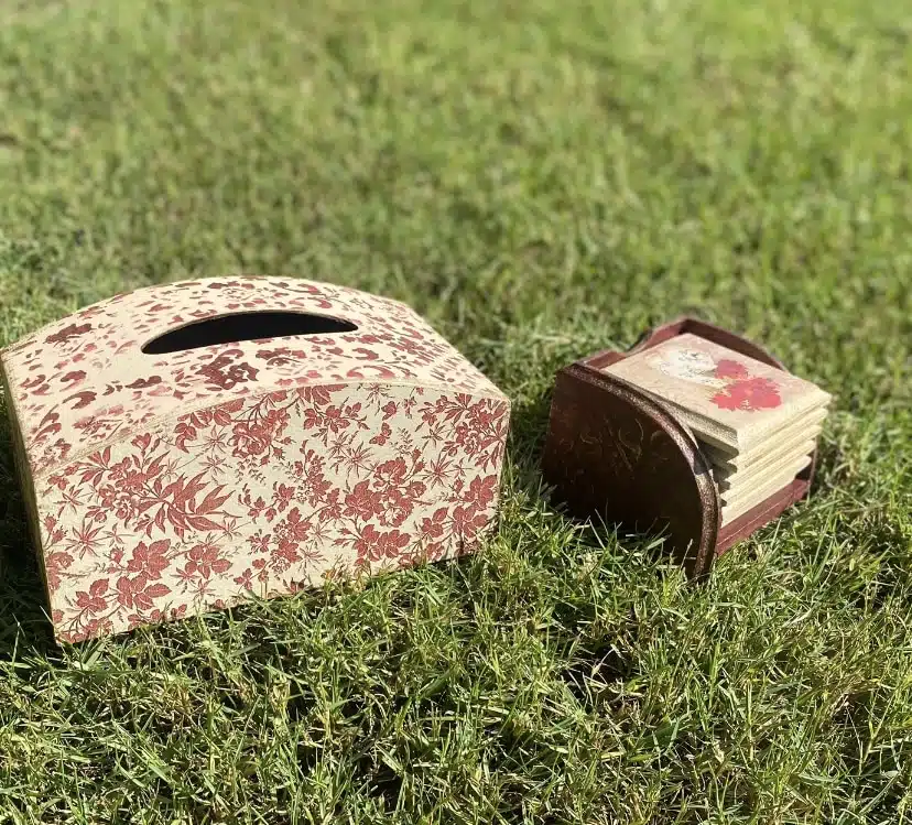 Wooden set of tissue box and coasters in classic design and burgundy x beige colors with touch of gold