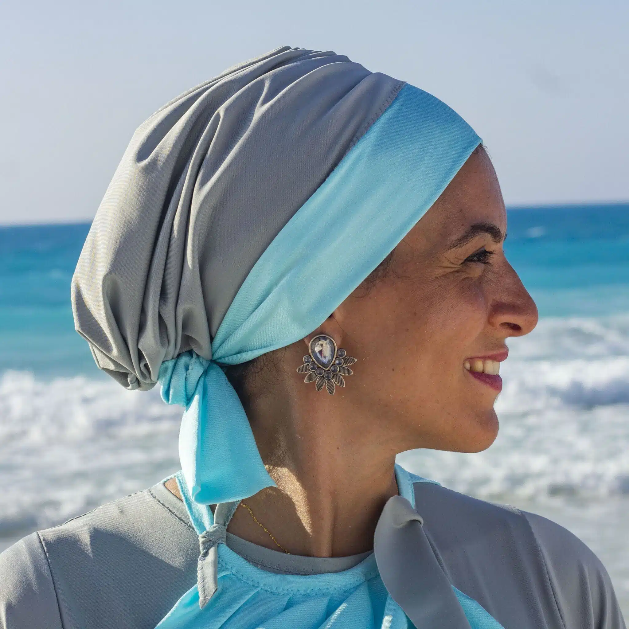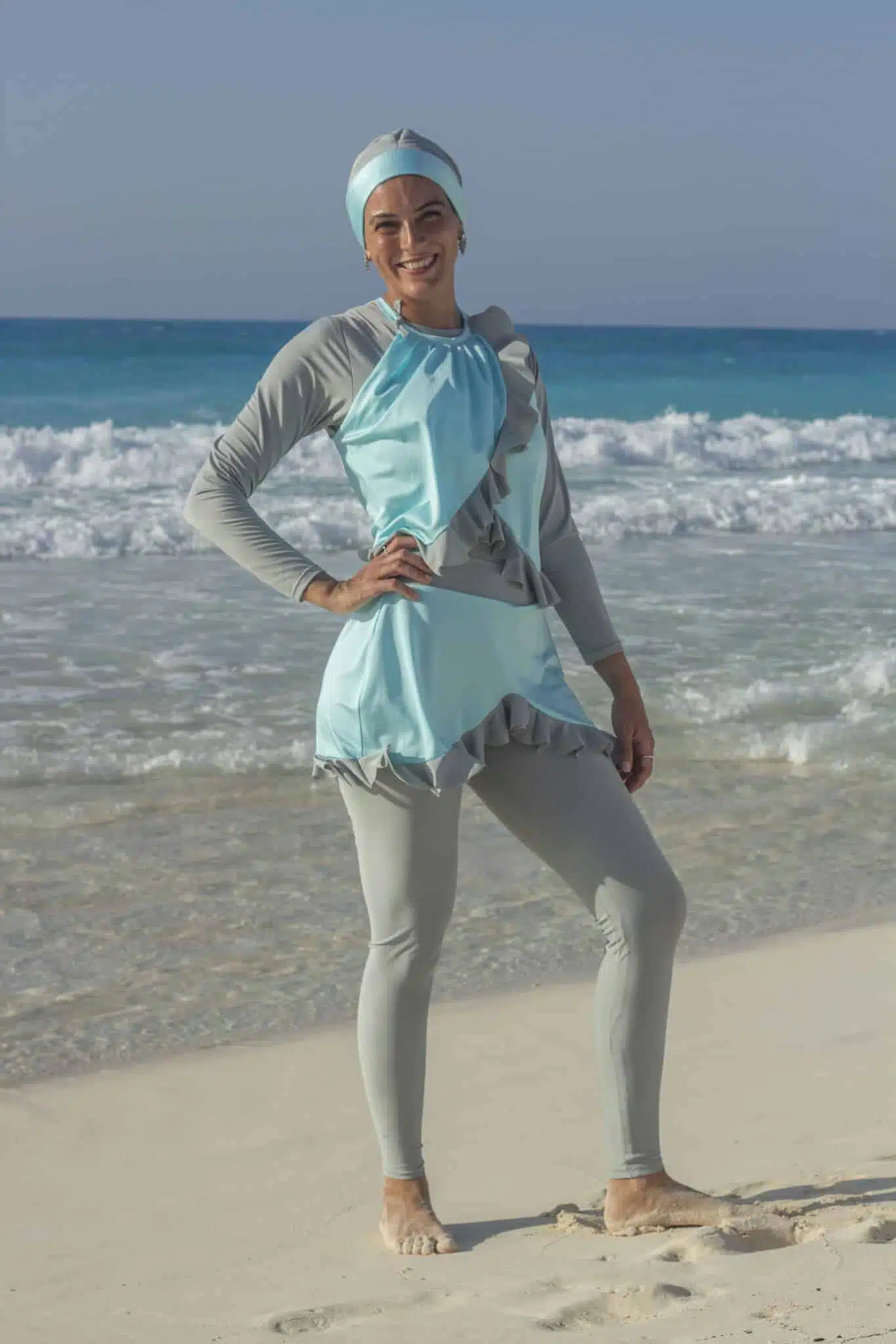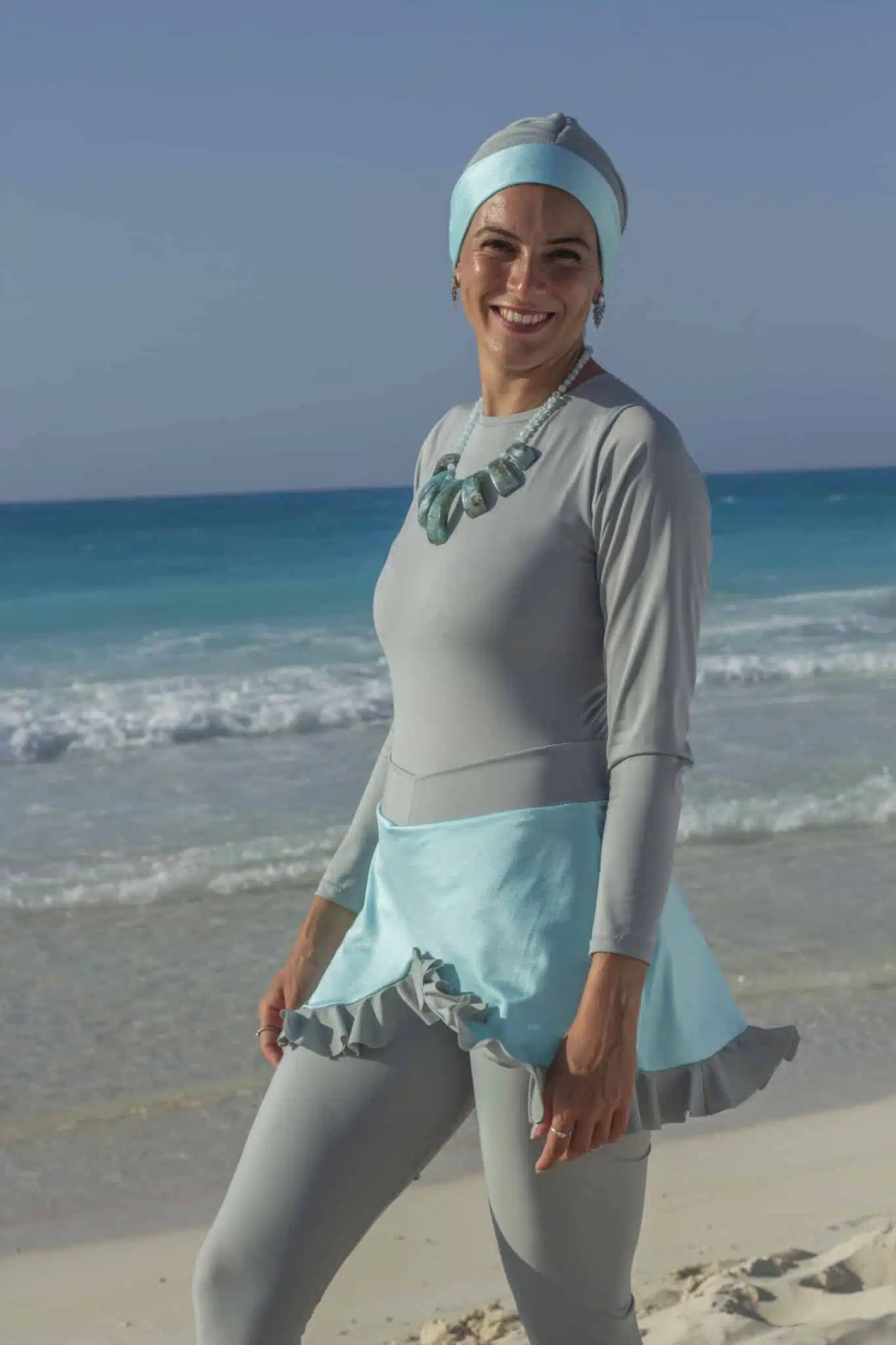 Burkini set consists of top maillot silver with turquoise coverup, pants with skirt attached and turban.