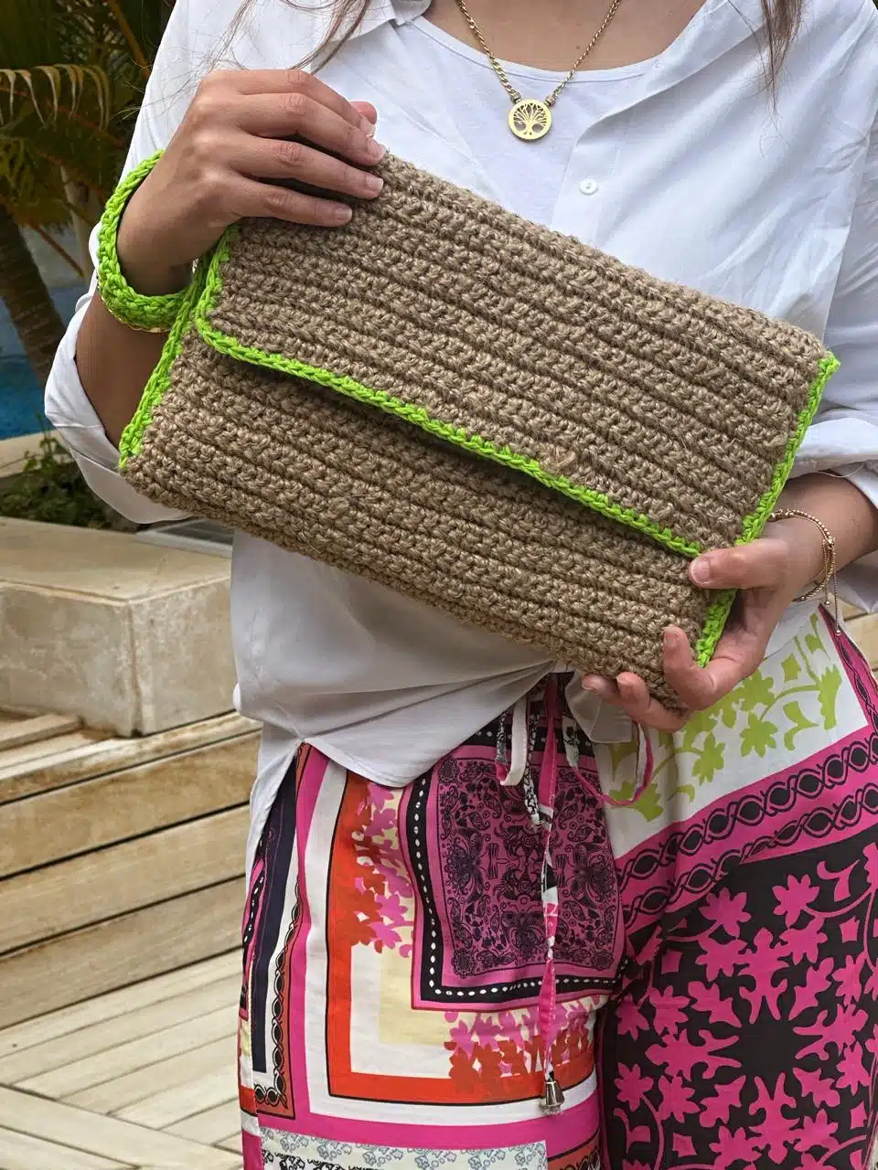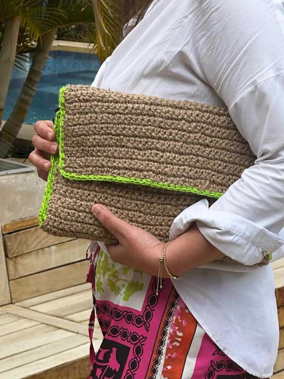 Burlap crochet clutch with green margins