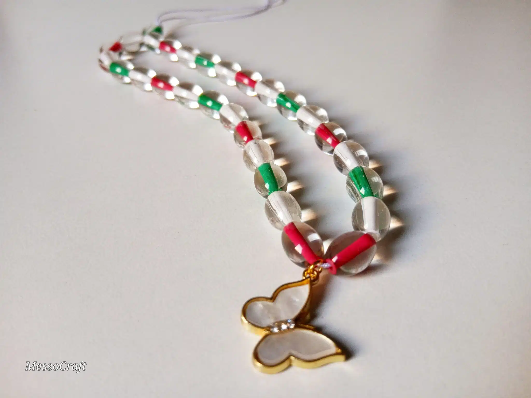 Mobile-chain in red/ green opal beads with pearl butterfly pendant