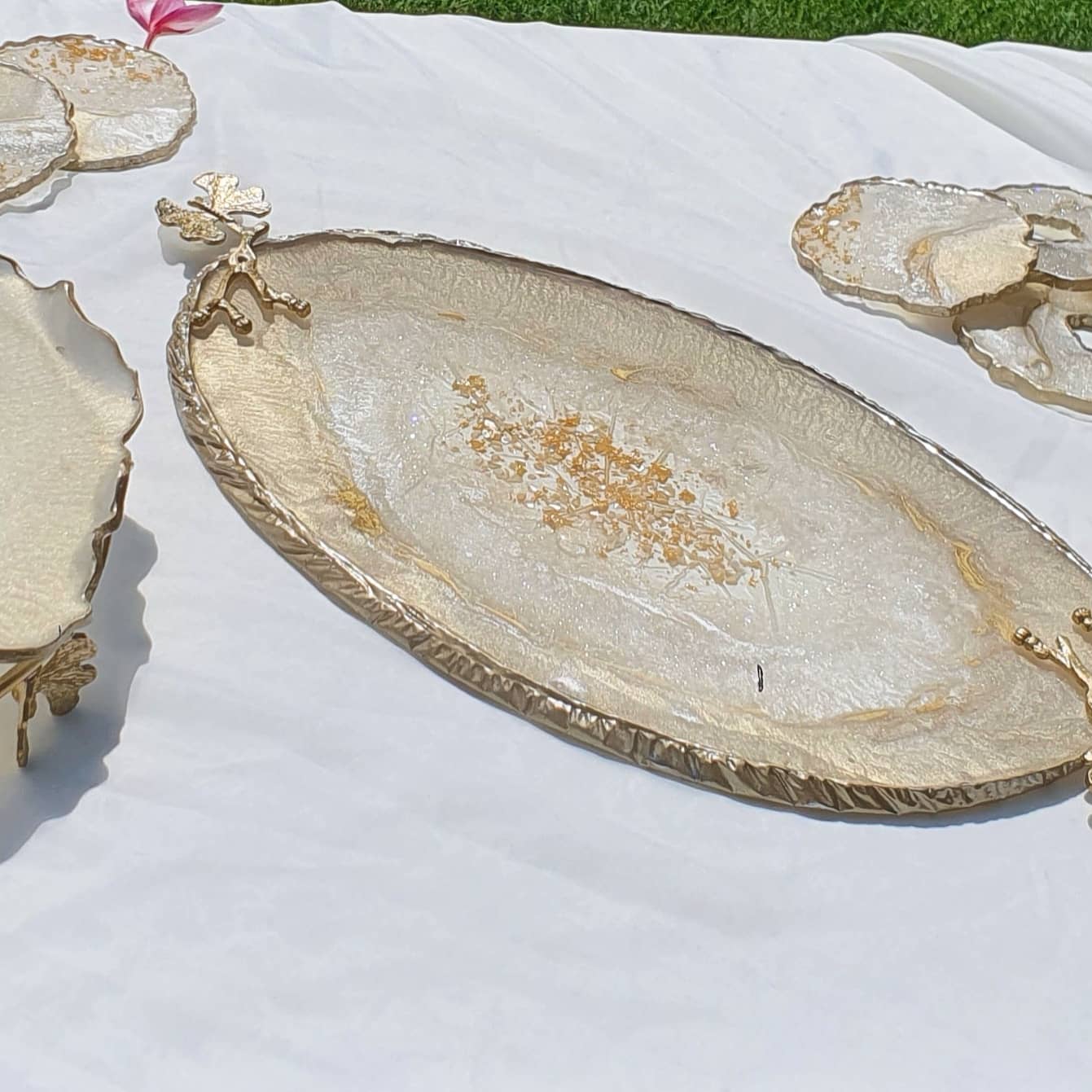 DELUXE: The decorative serving platter/tray is elegant, esthetic home decor. It is a resin serving set, hot and cold drinks set with a carefully polished surface to elevate your space.