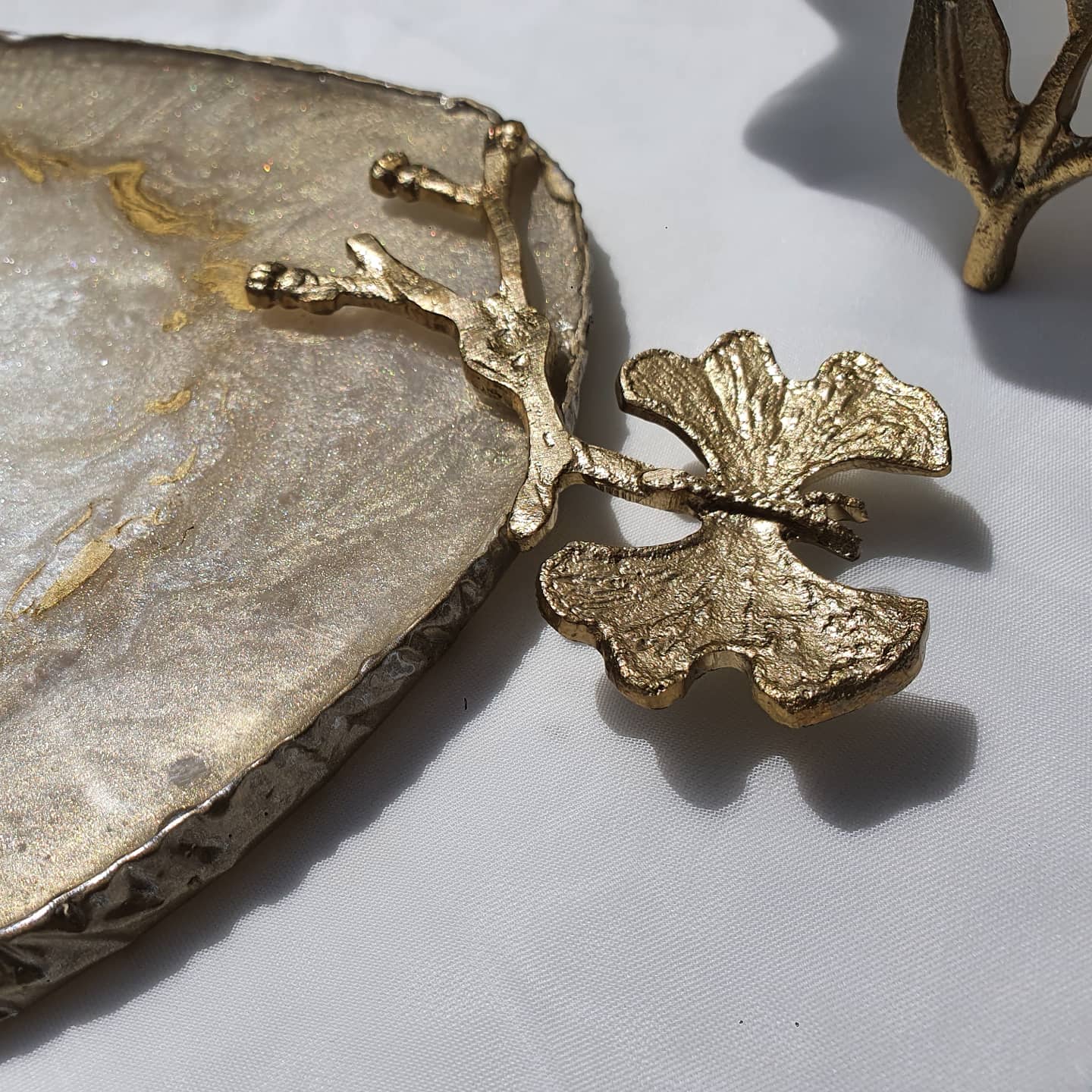 ELEGANT: Resin 100% handmade platter/tray that could be used as a tray or simply a piece of art to decorate your table or wall, oval freeform shape, approximately 44×26 cm, inlaid with crushed seashells and gold leaves with copper handles. Handmade using epoxy resin that is food safe.