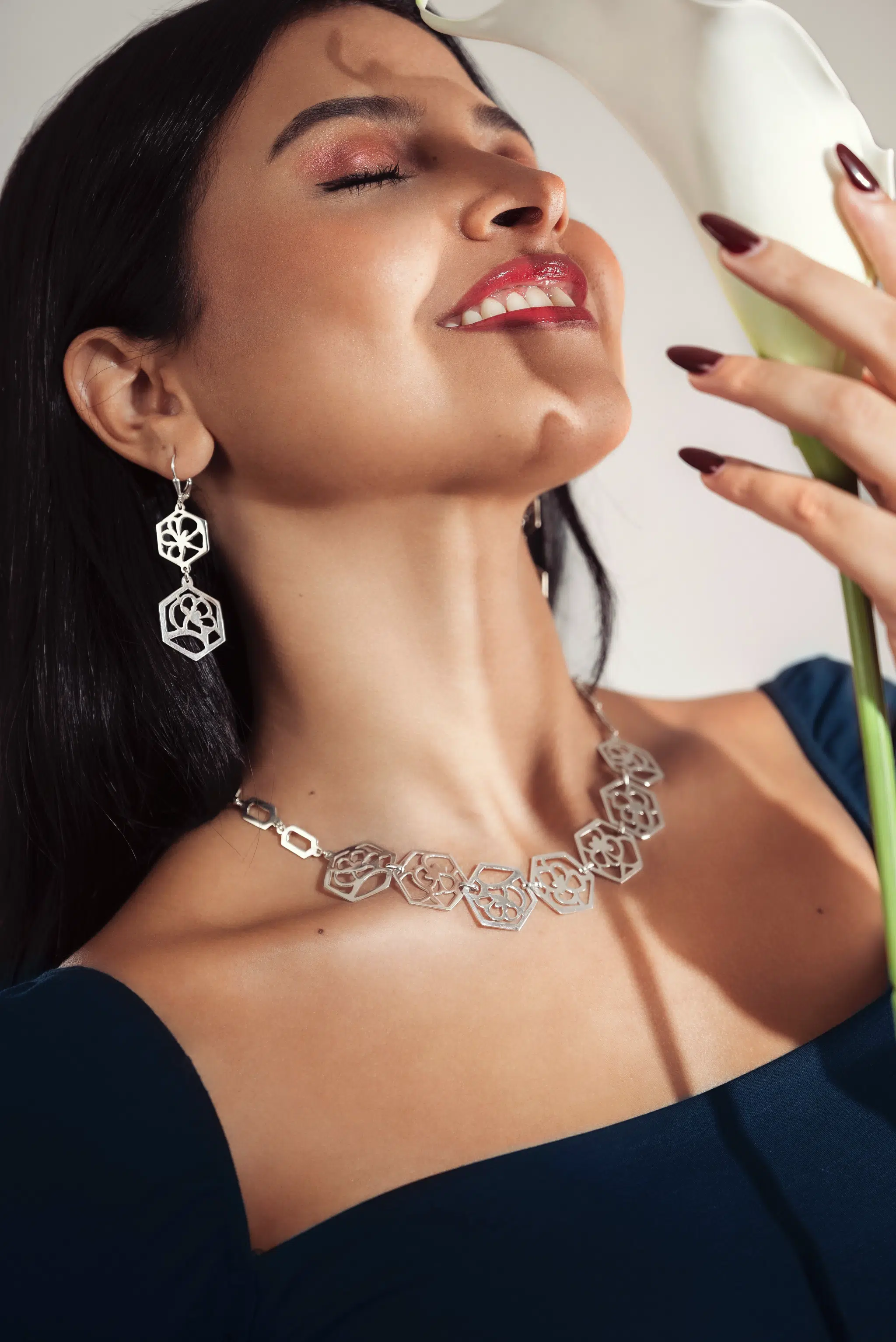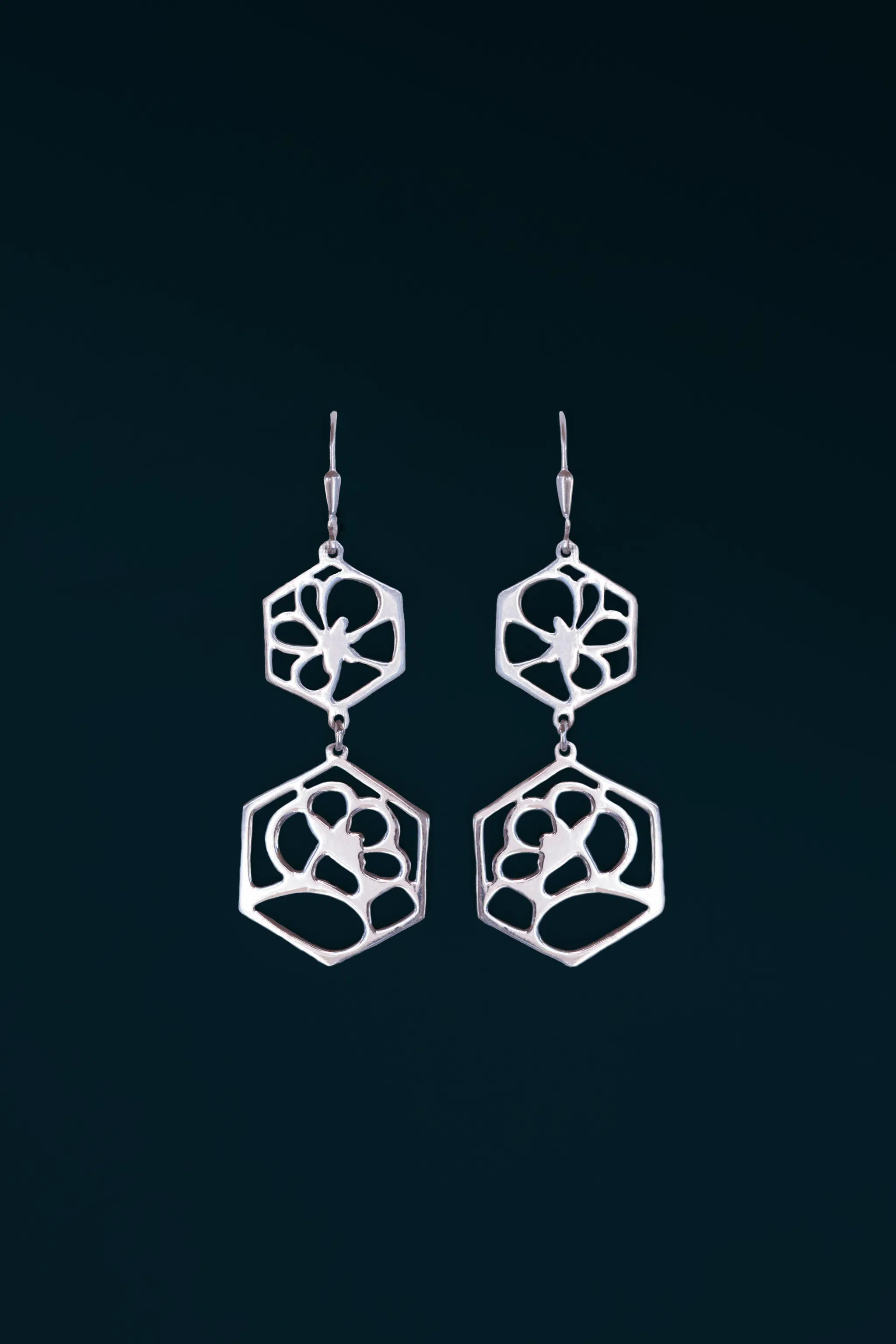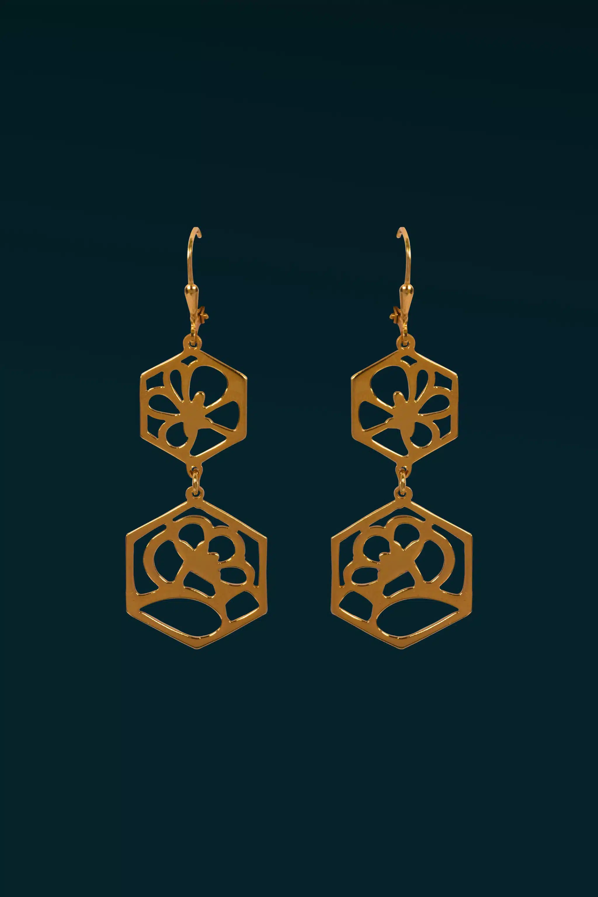 Motifs of the Camellia flower meticulously sawn by hand and intricately linked together. These earrings are a statement of fine craftsmanship where the structured geometry of the hexagon frame contrasts beautifully with the unique, fluid shapes of the Camellia flower. The hooks make it move freely and naturally as you move.