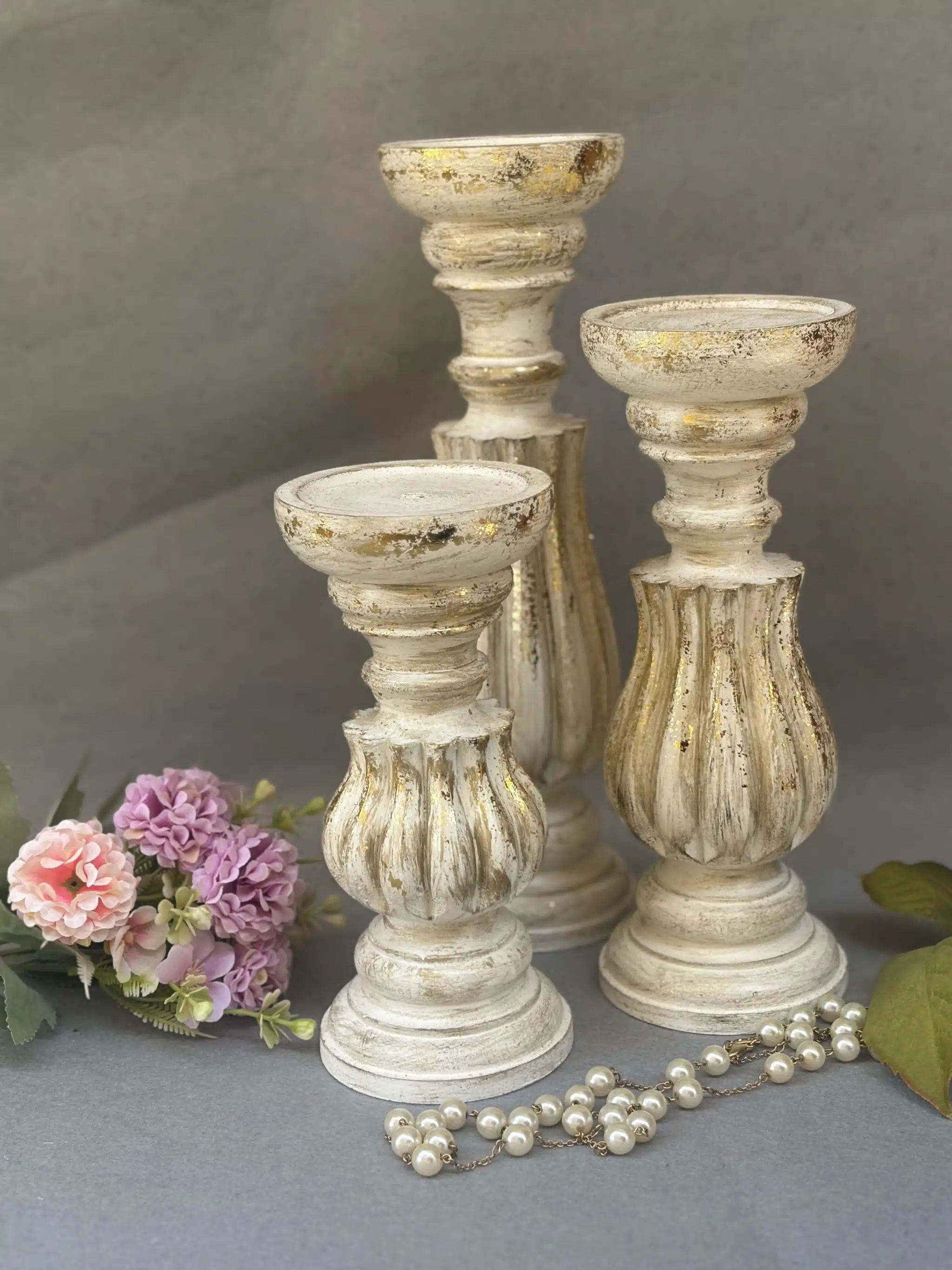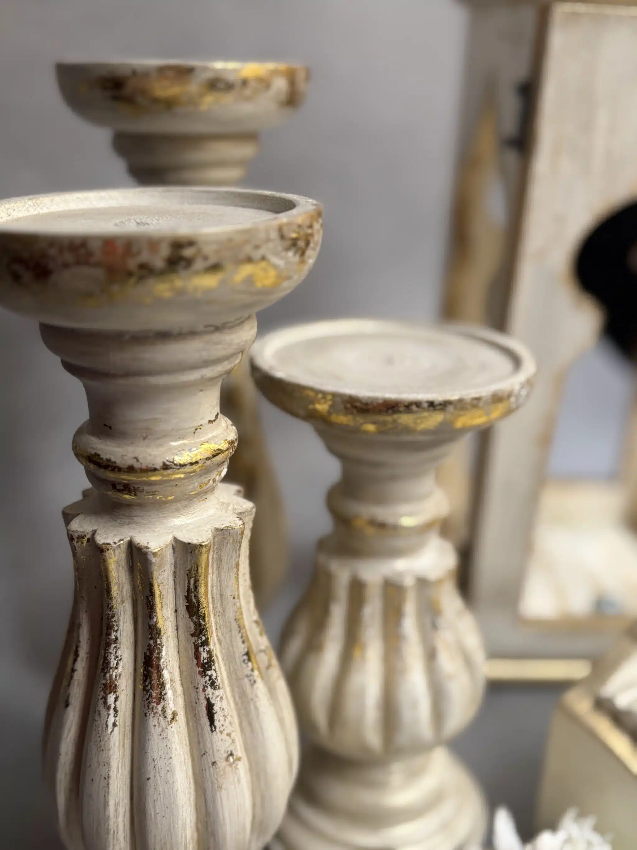 3 wooden candle holders with gold leaf