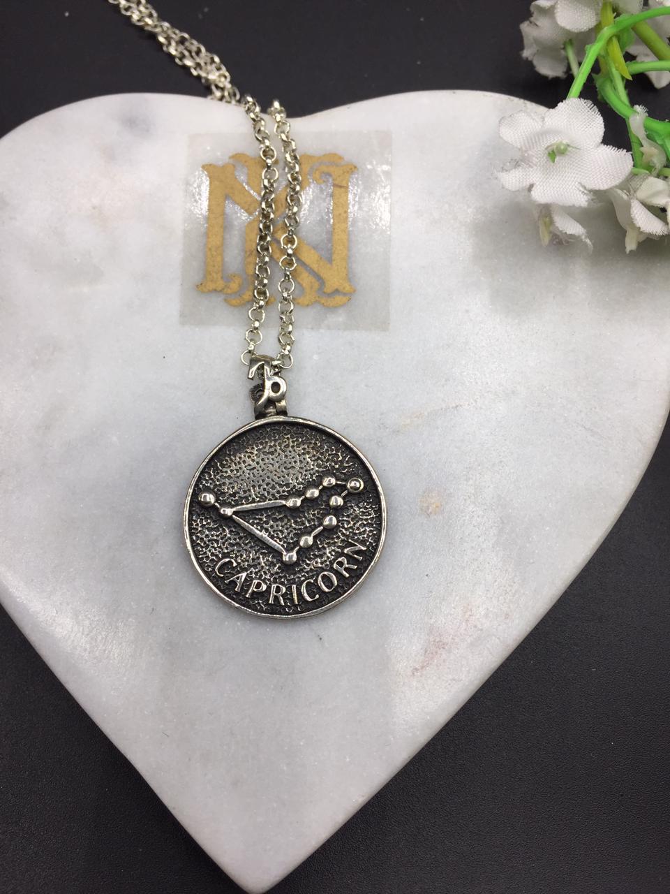 Description:925 sterling silver zodiac sign double faced pendant necklace. One side shows the sign shape and the other side shows the sign stars constellation shape.