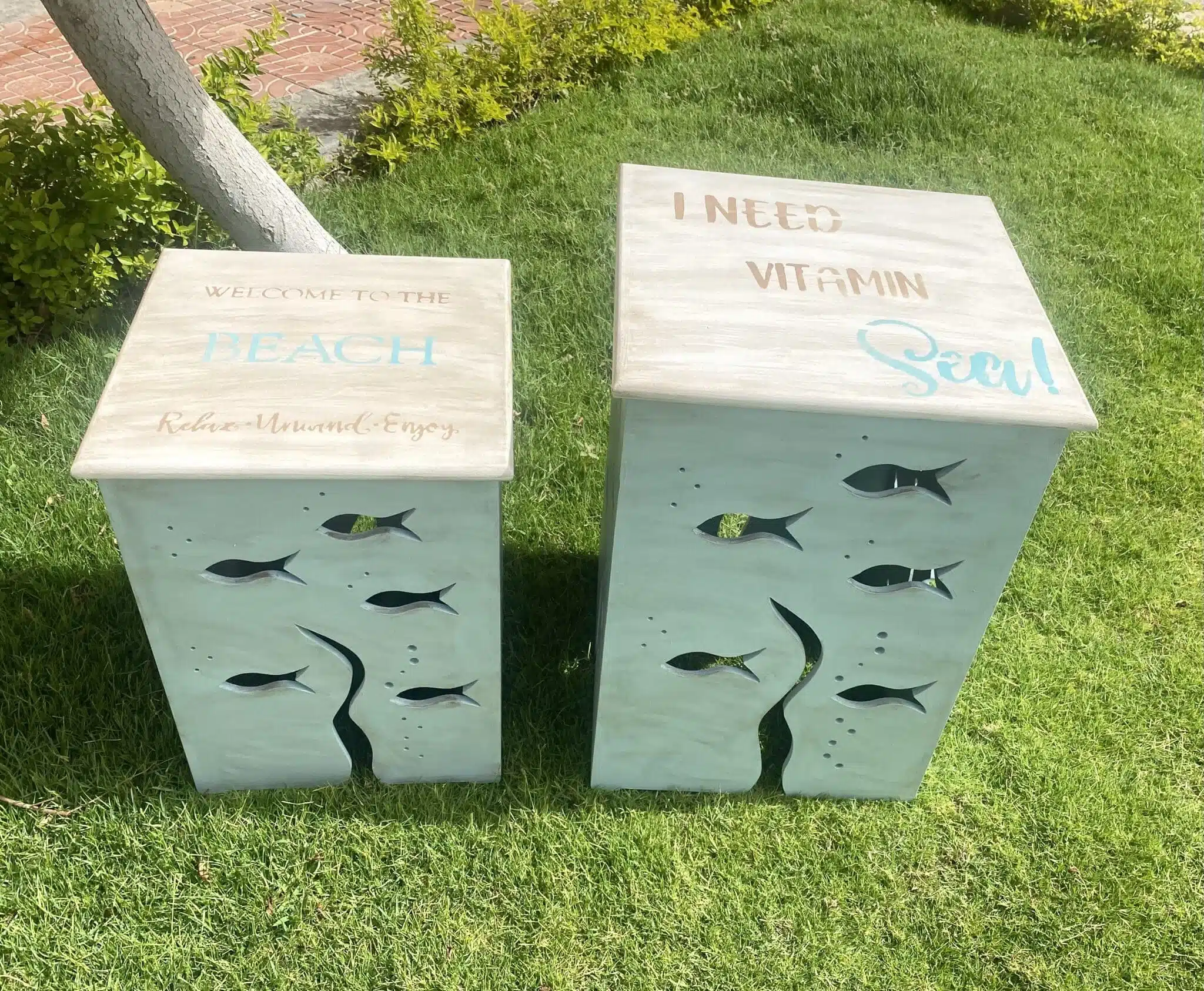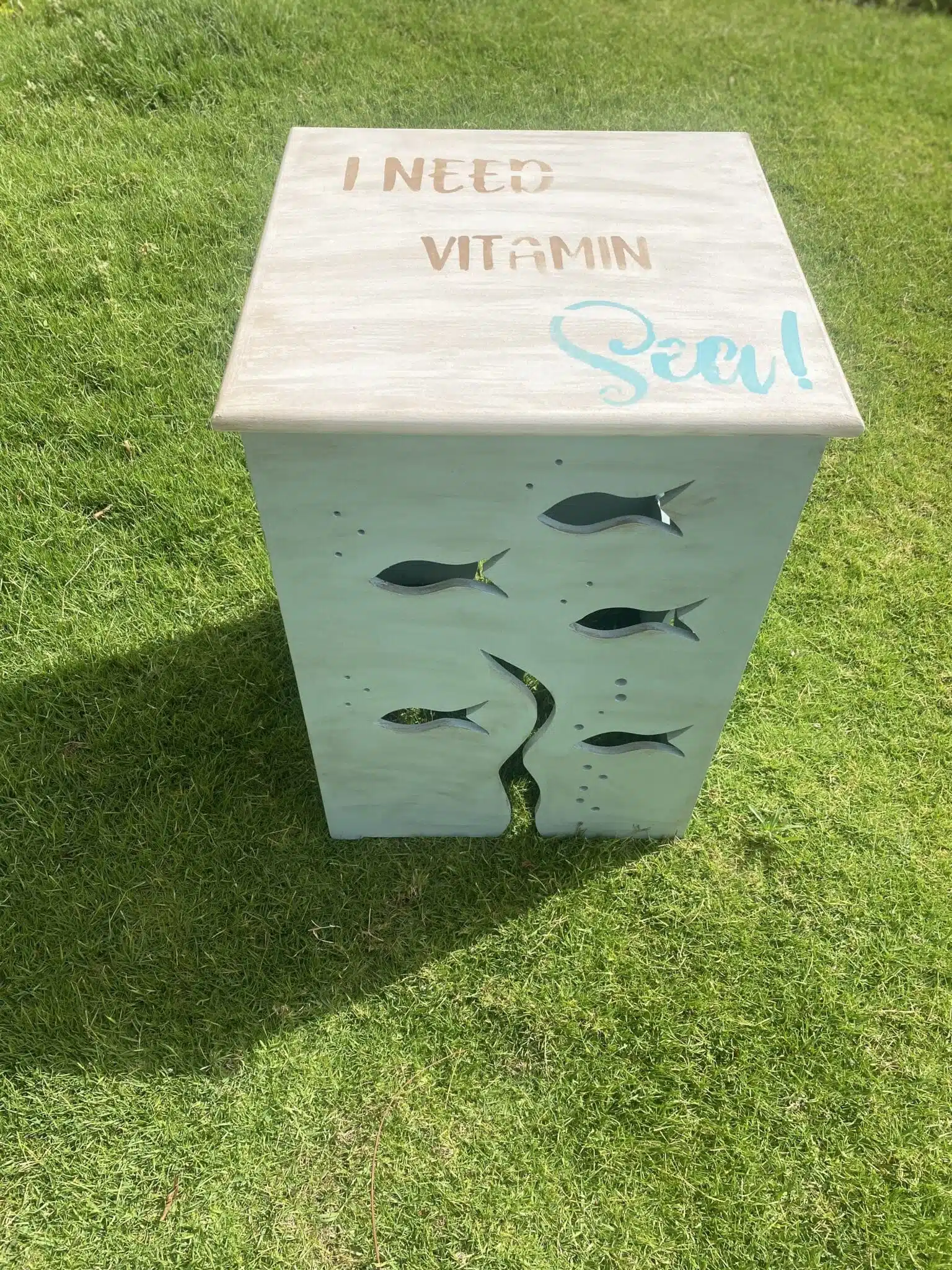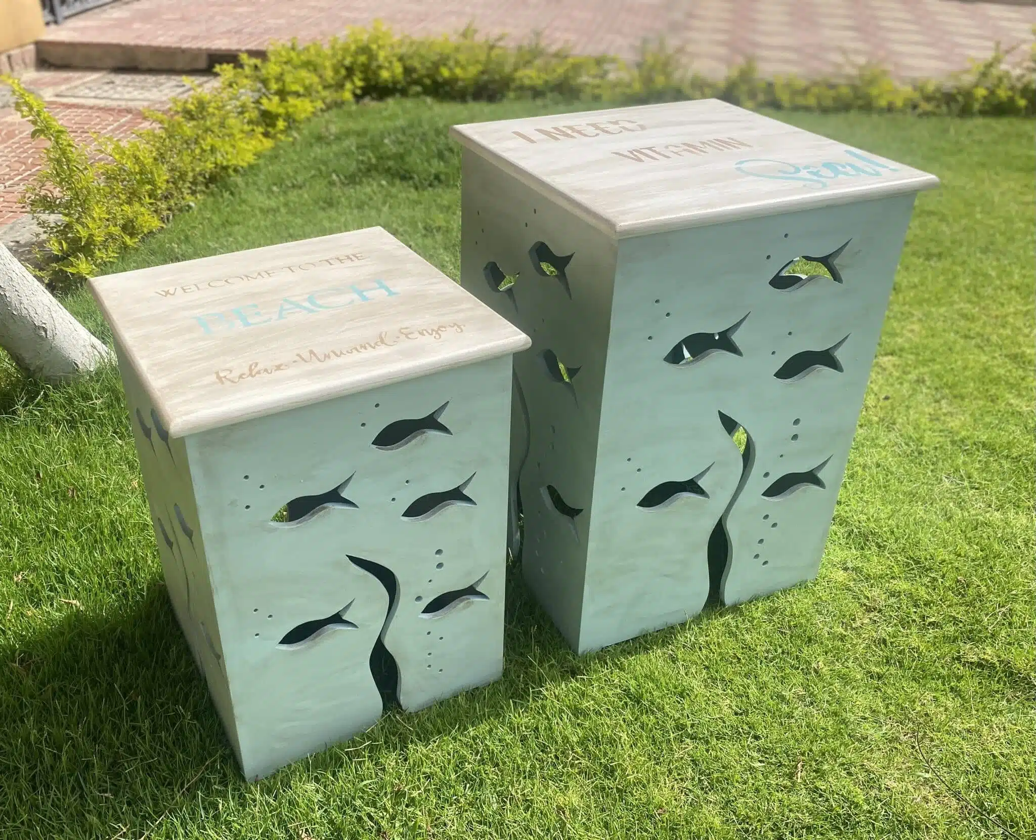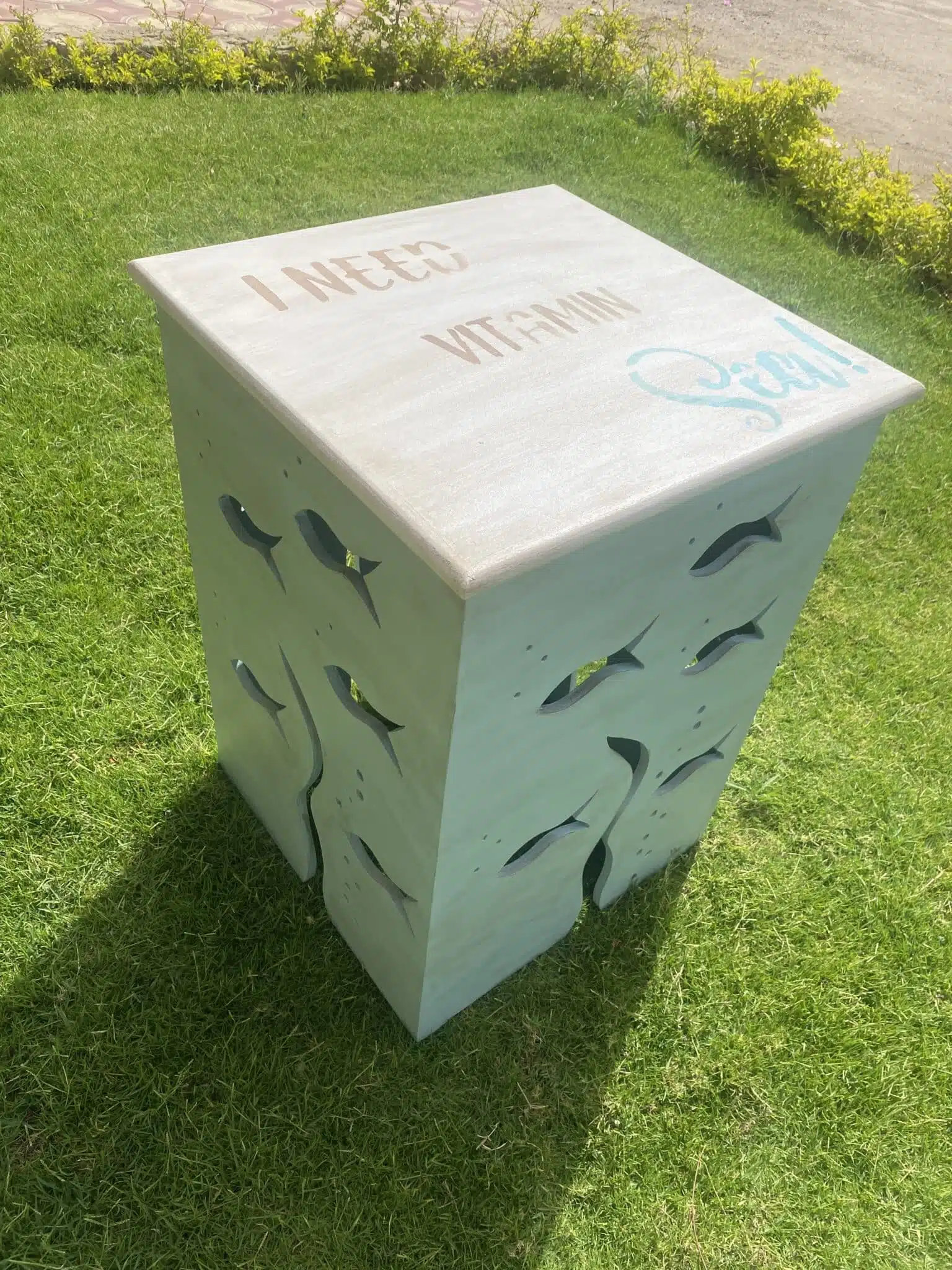Wooden side table with carved fish and summer design