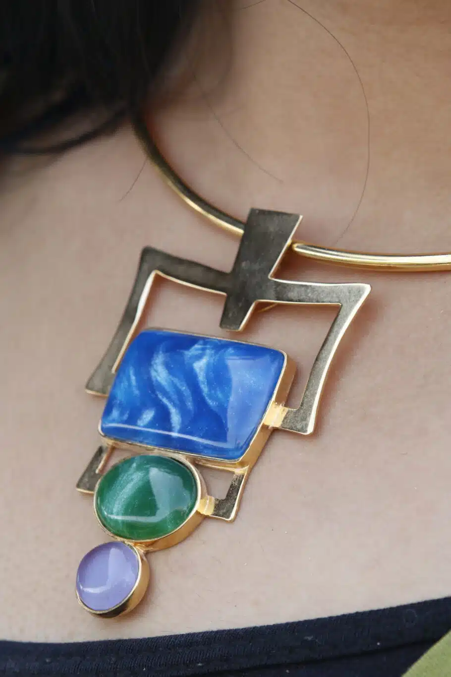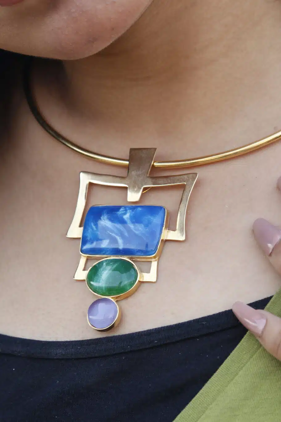 Bold and artistic, Celestial Path is a statement choker featuring vibrant stones in blue, green, and lilac, set in a structured gold-toned frame. Inspired by cosmic energy and geometric harmony, this piece brings a modern yet mystical touch to any look.