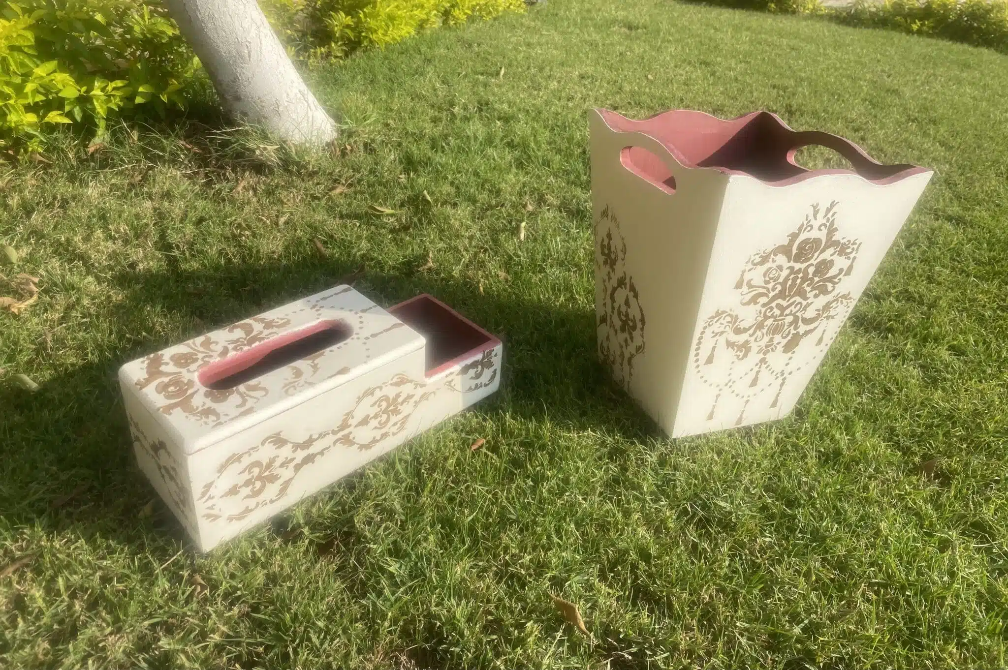 Set of tissue box with organizer and trash bin in classic colors beige x brown with a touch of burgundy
