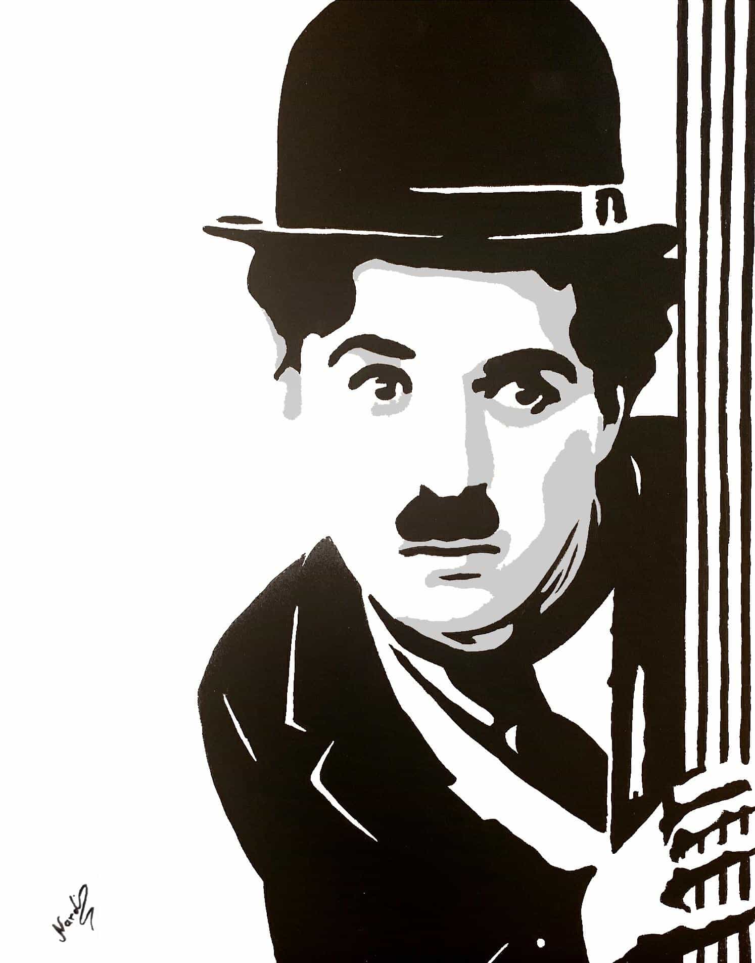 This is an acrylic painting of the actor Charly Chaplin on canvas. It is based on only three colors; black, grey and white.