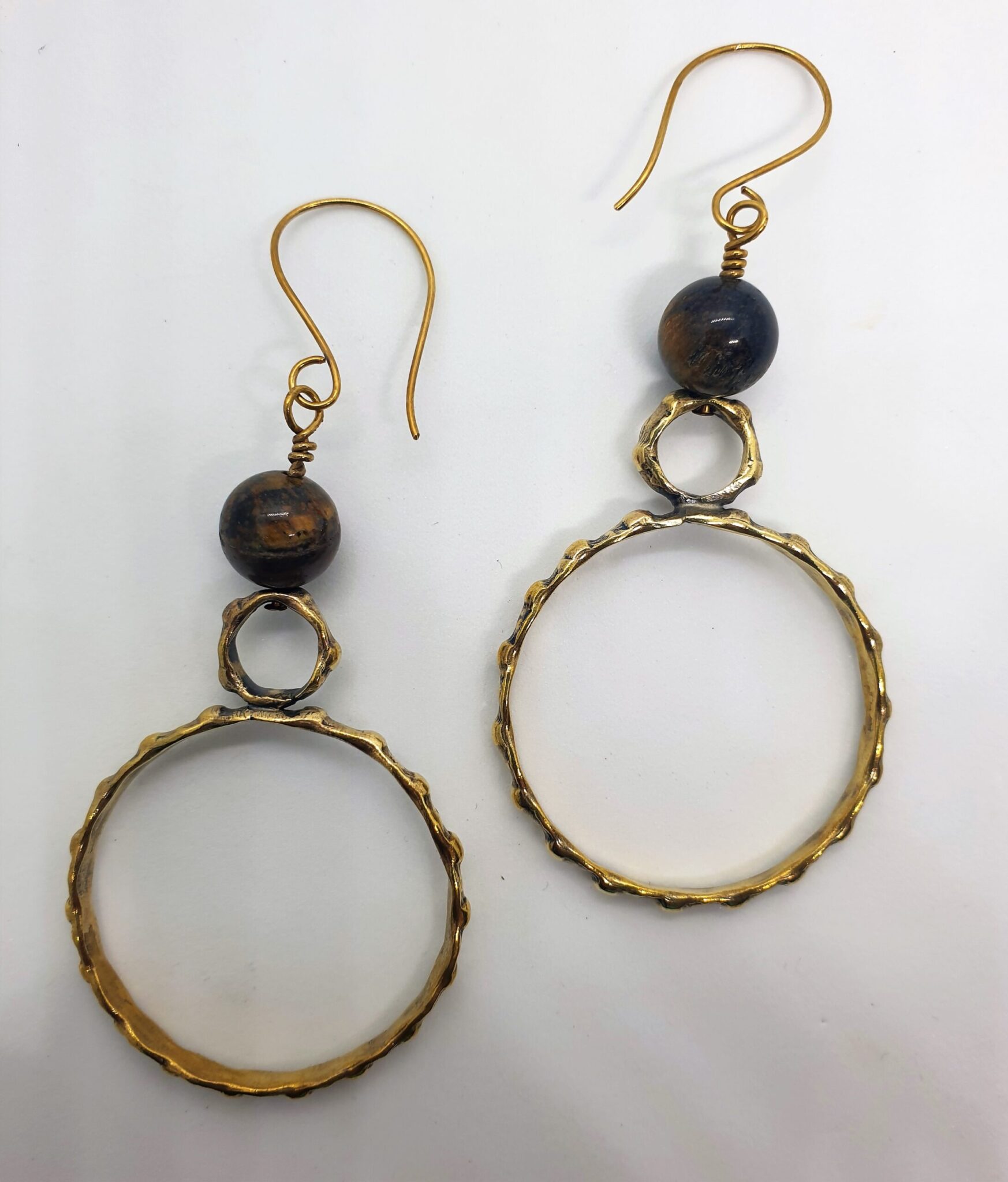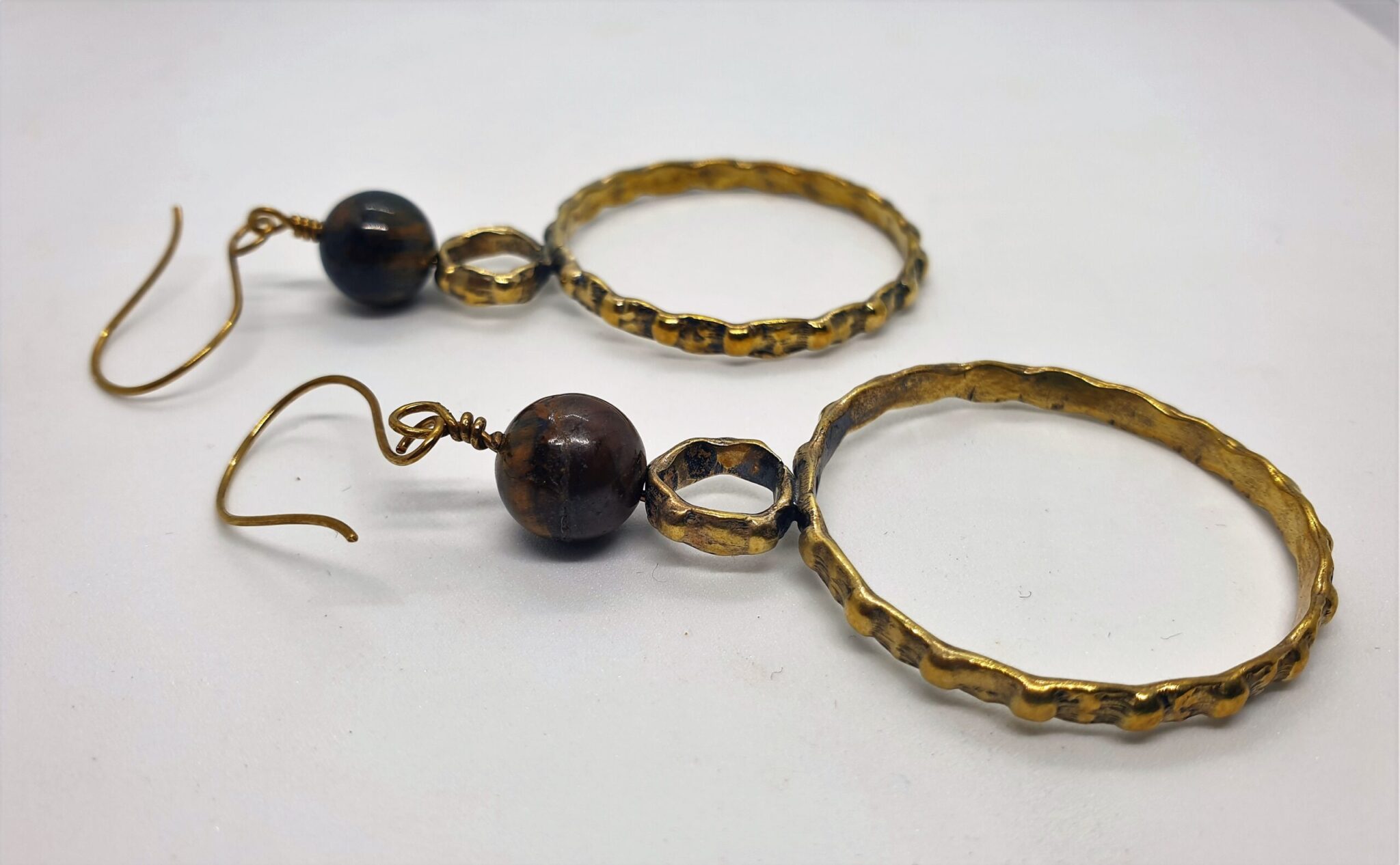 Circular textured earring with top tiger eye stone.