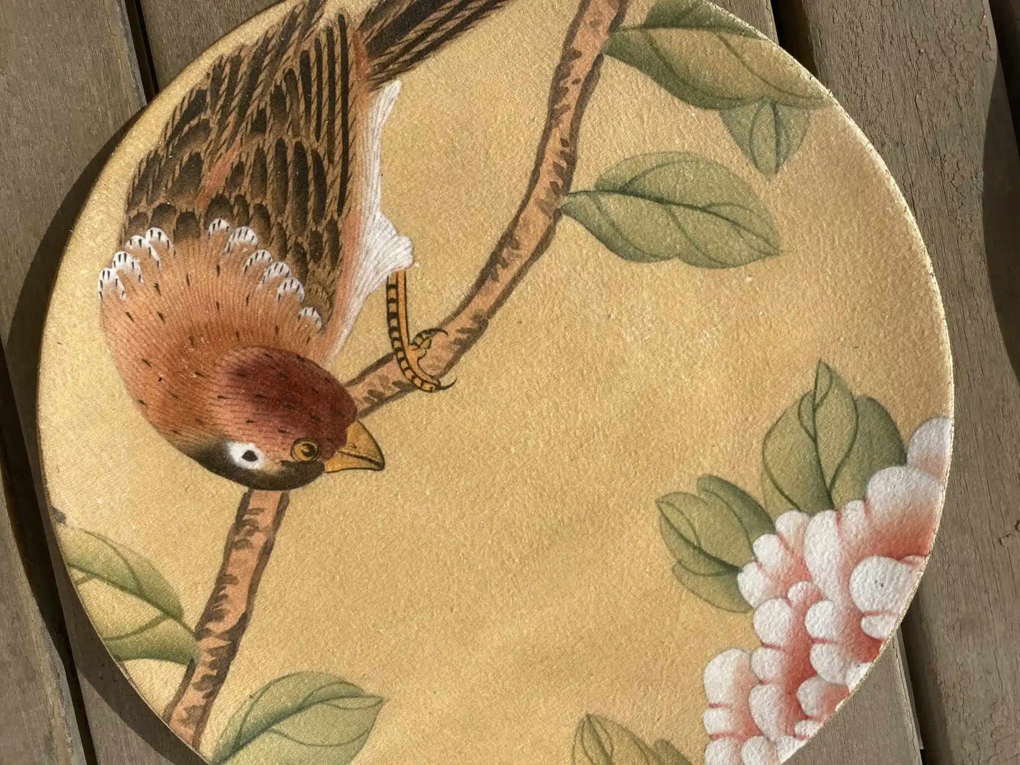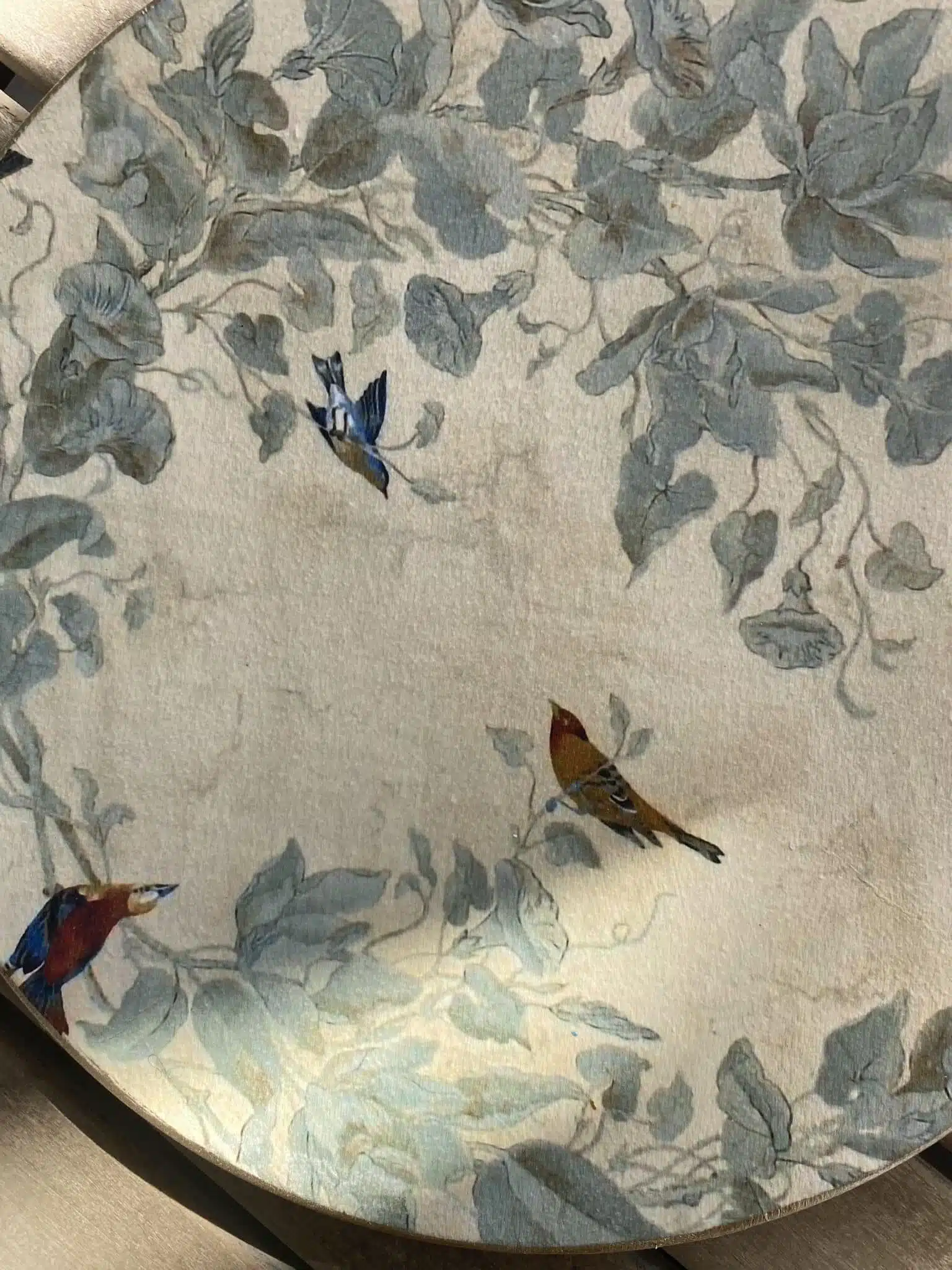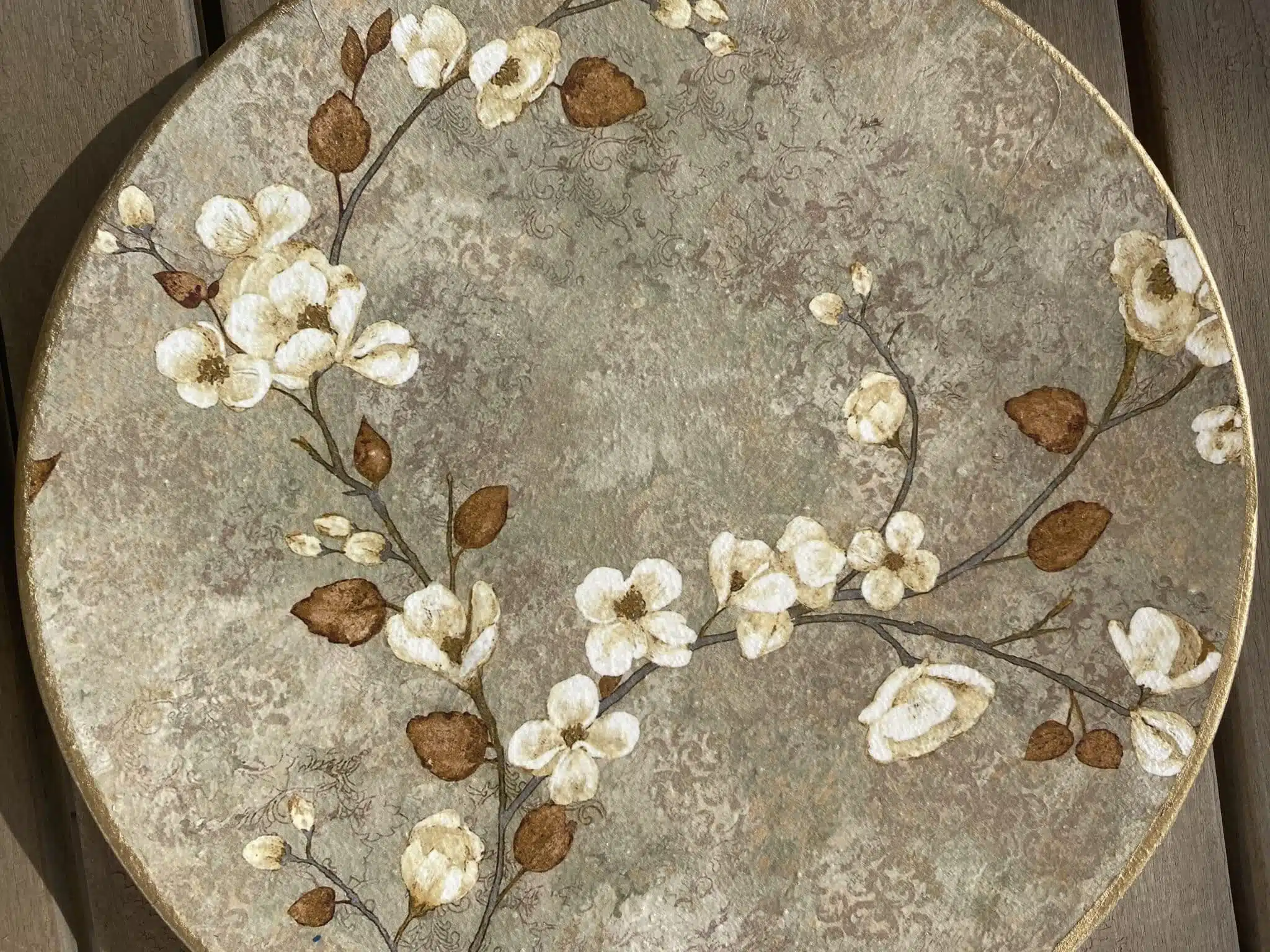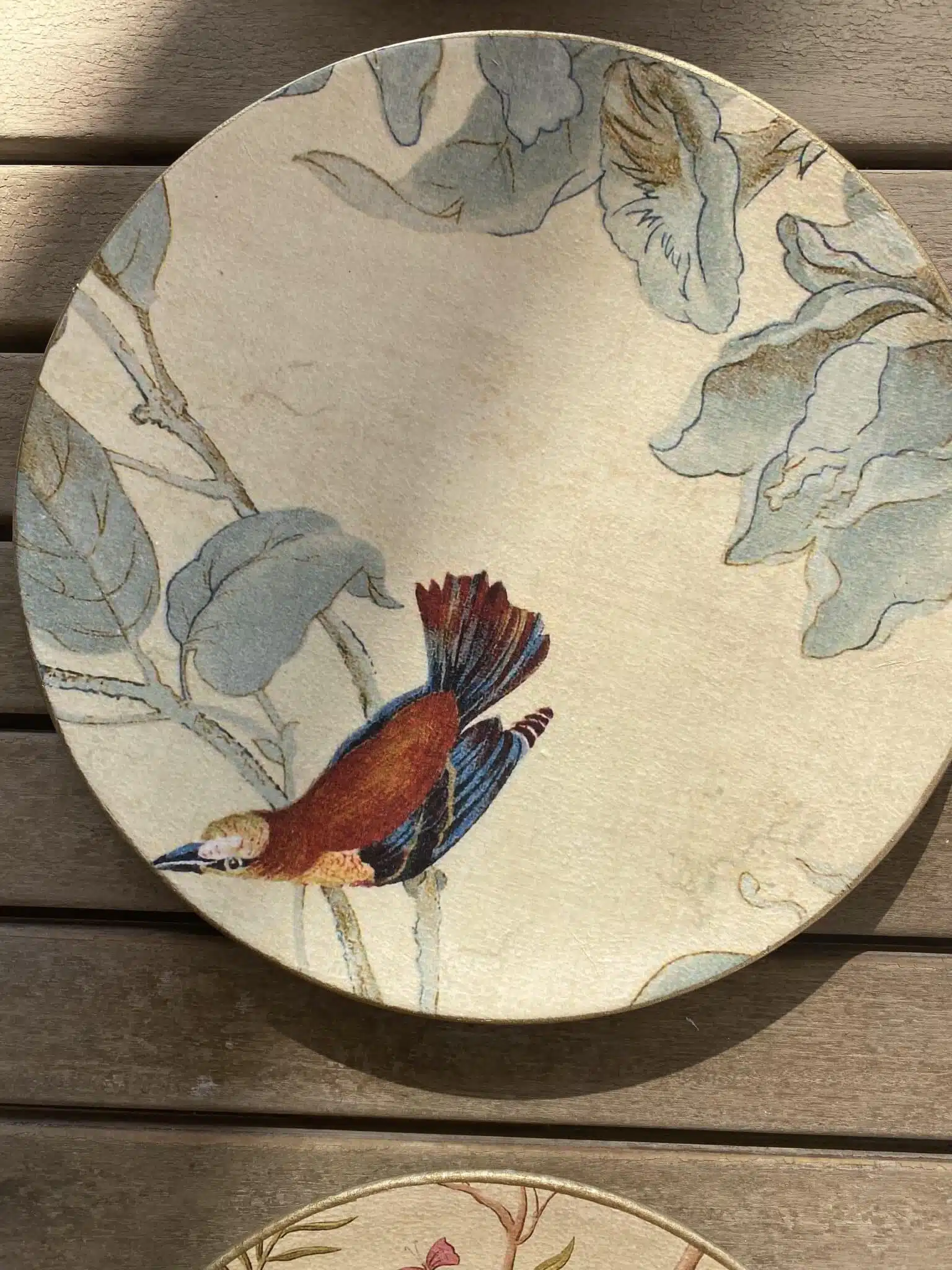 Decoupaged wall plates in beige color with a touch of gold featuring Chinese garden theme