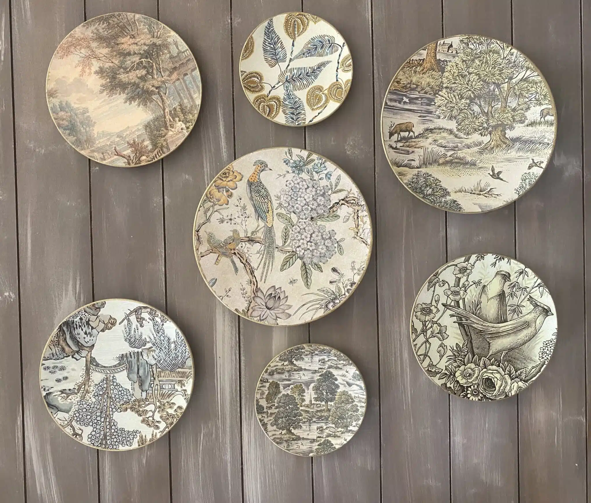 Decoupaged wall plates collection in classic beige chinoiseries