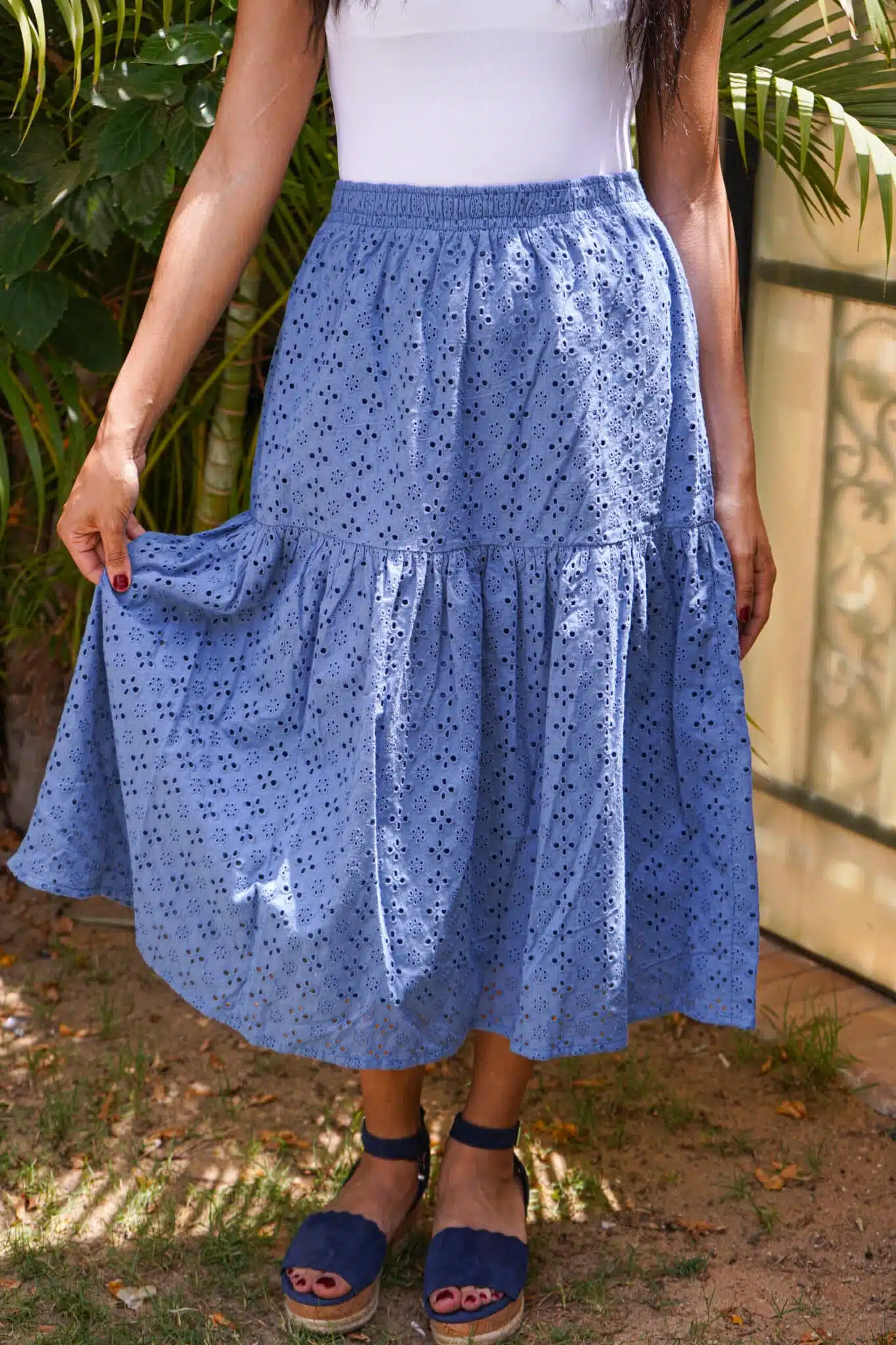 Classic blue midi eyelet tiered skirt