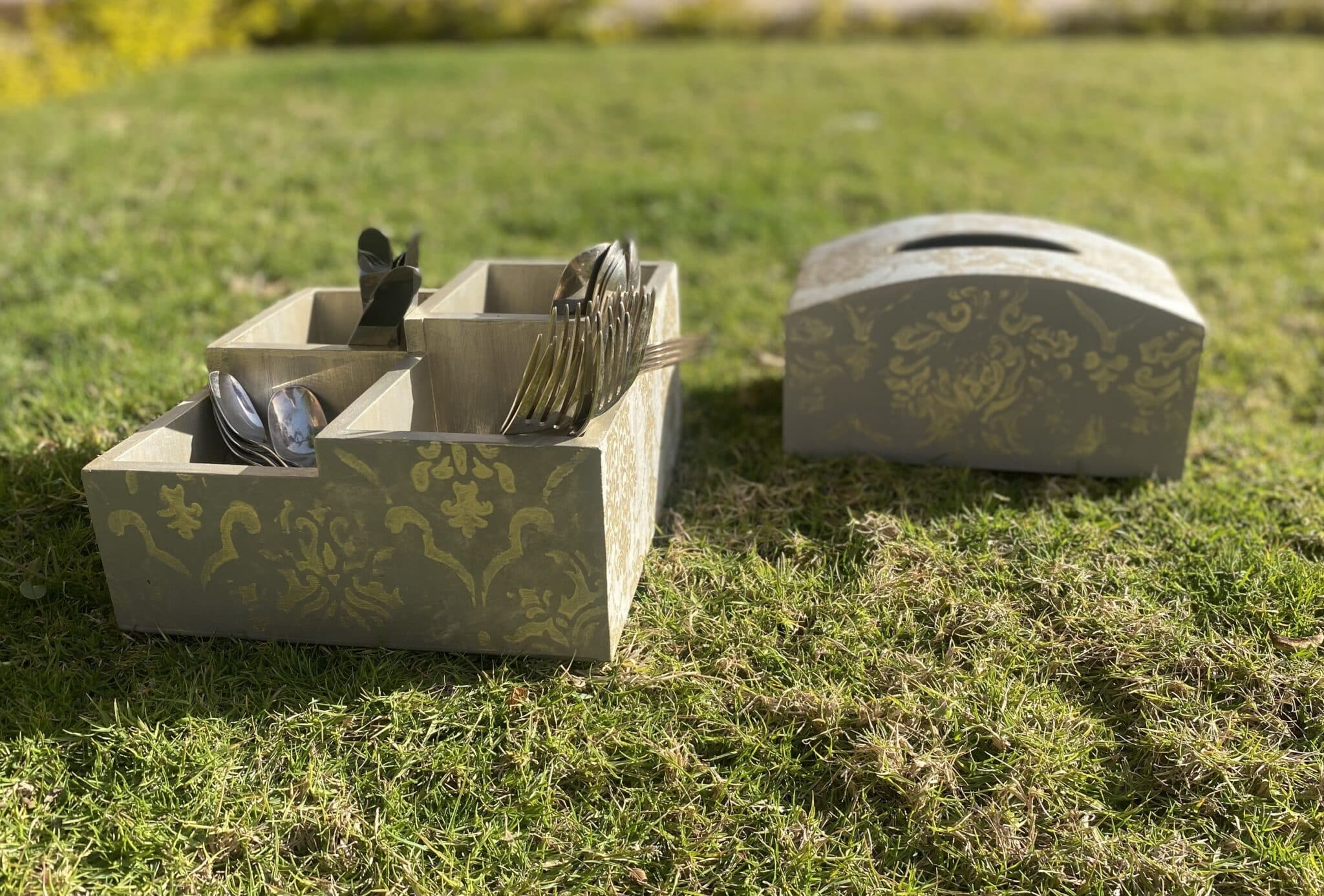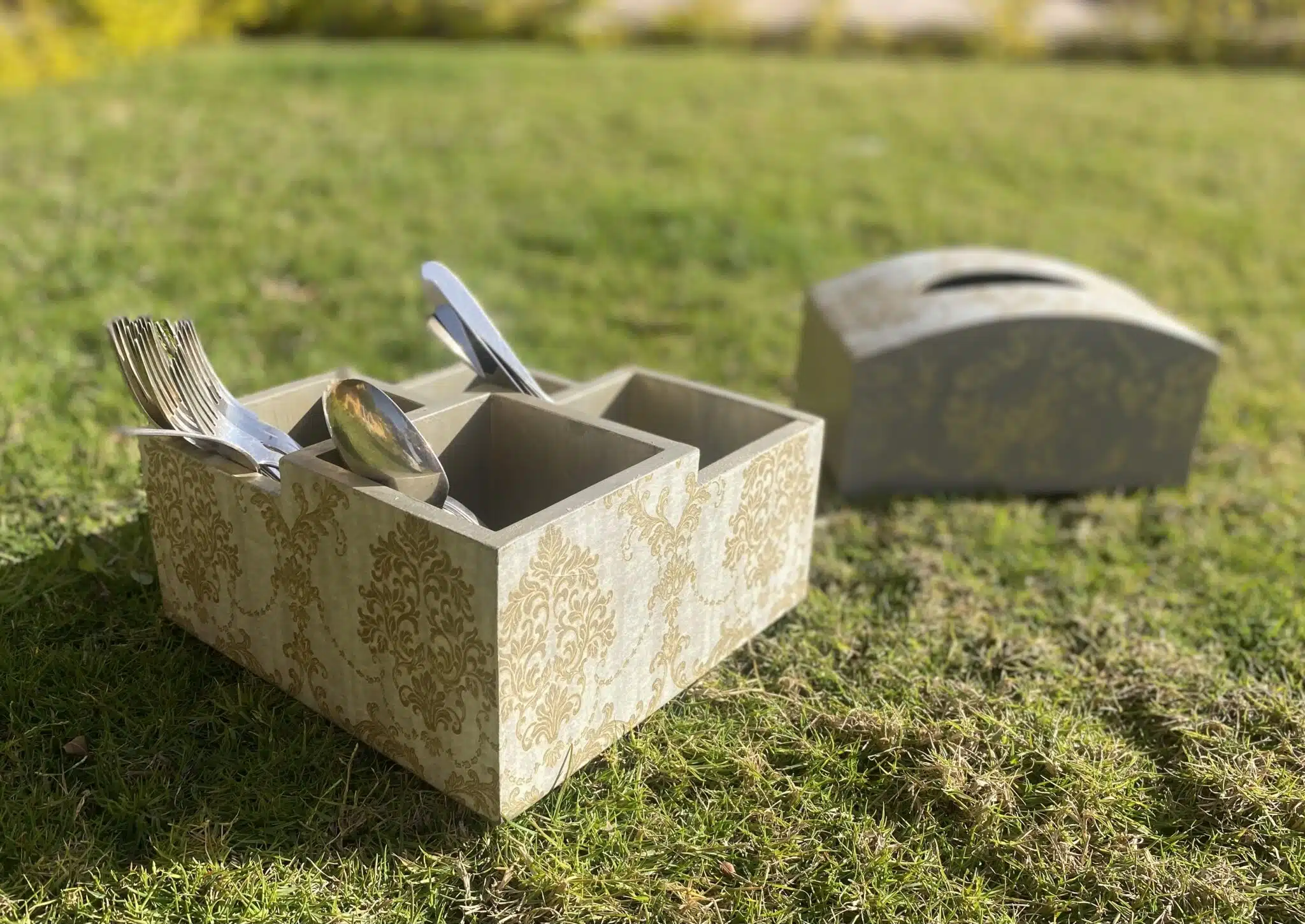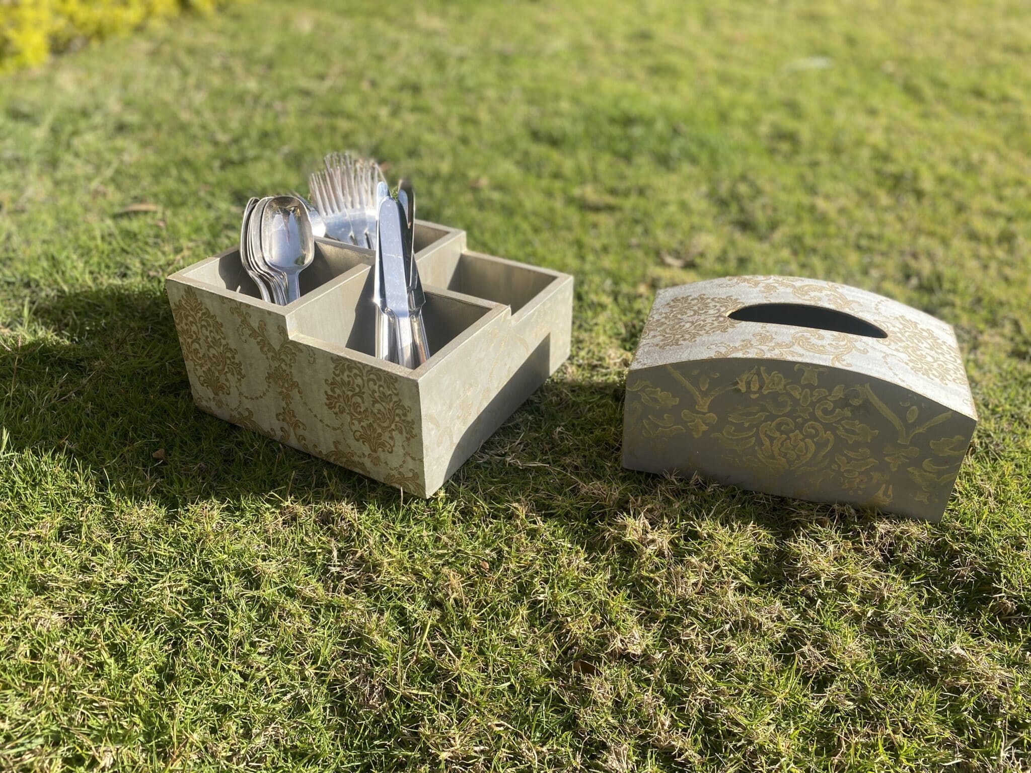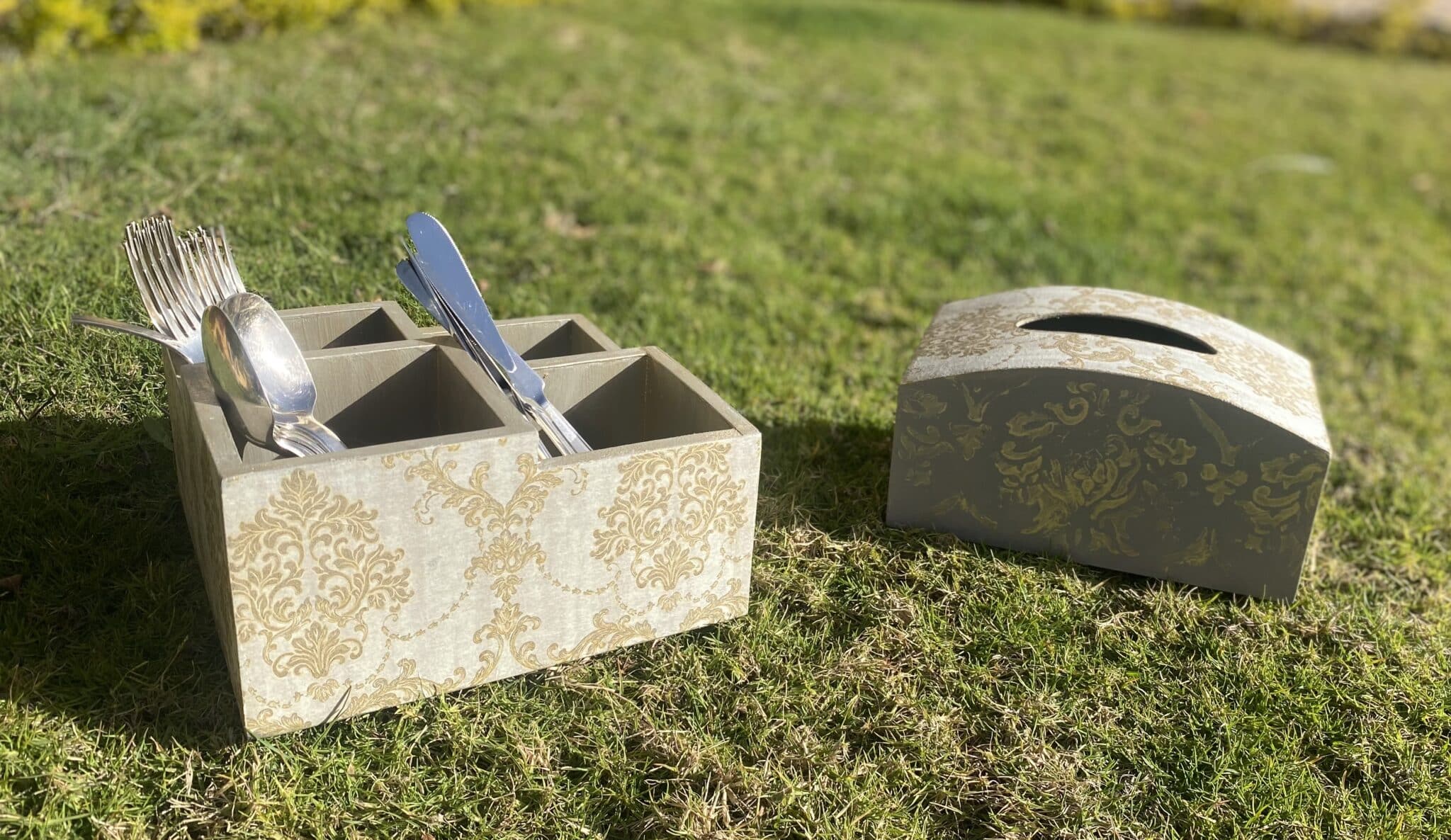 Wooden set of cutlery organizer & tissue box in griesh x gold classic designs