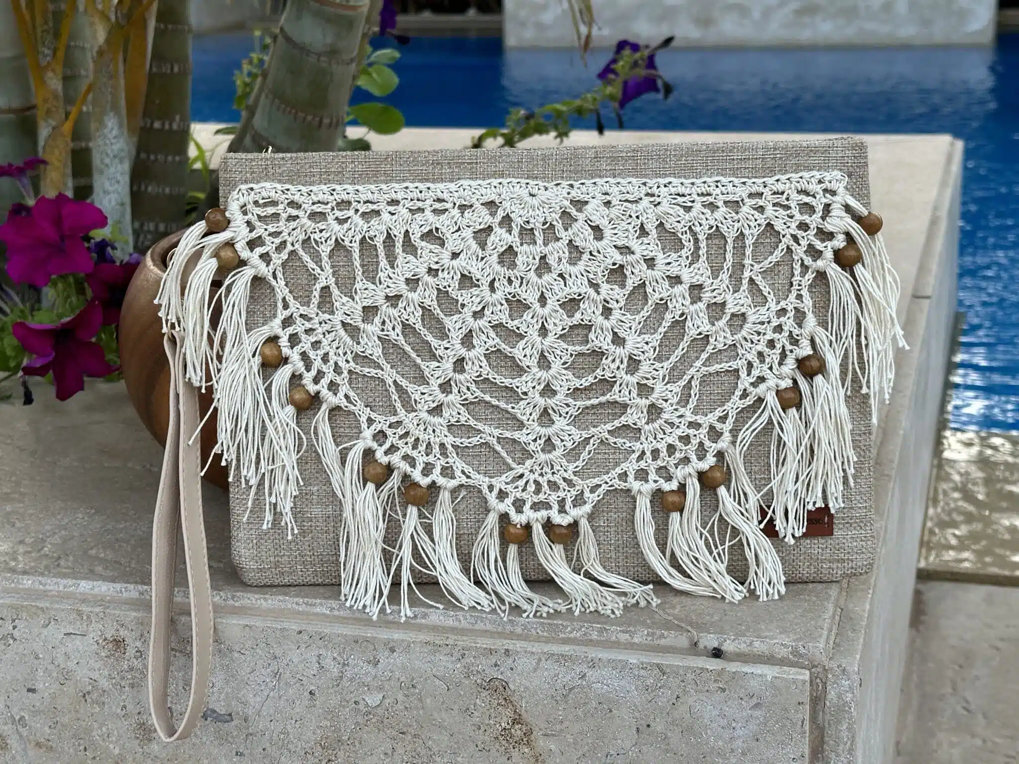 Clutch,30×20 cm, with semi circle crochet applique ending with beaded tassels,comes with leather handle