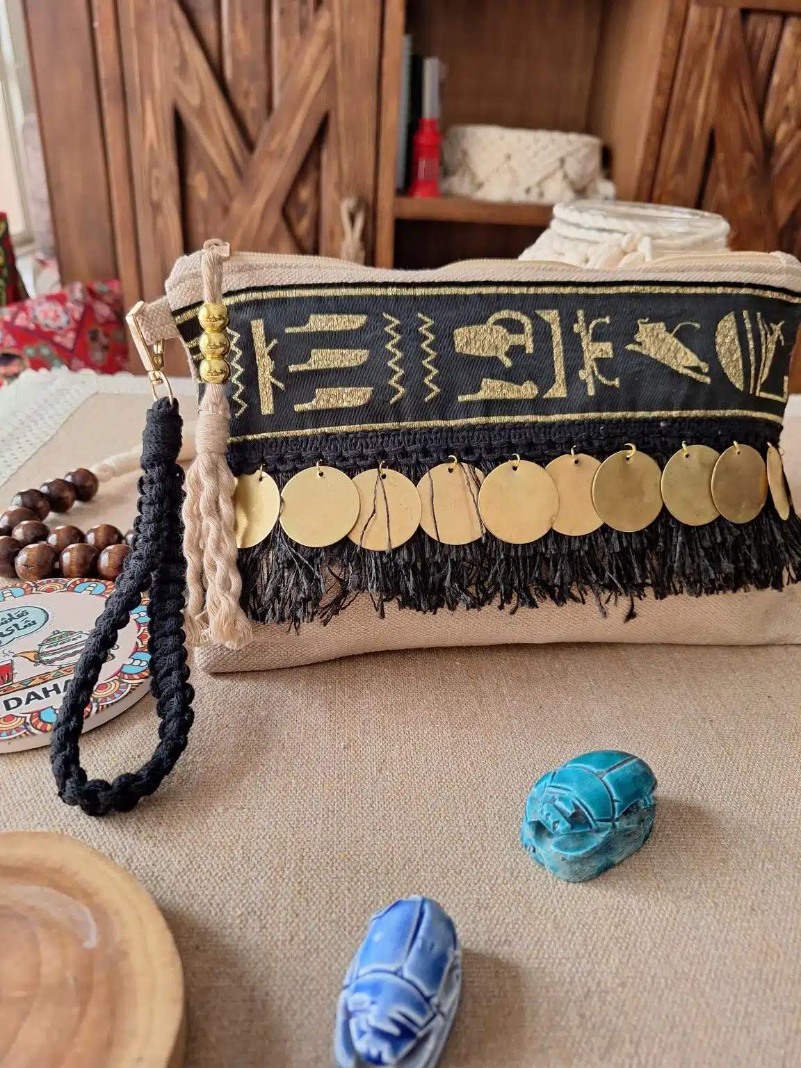 كلاتش مصنوع يدويا شكل فرعوني اسود في سرما زهبي مع دلايات نحاس