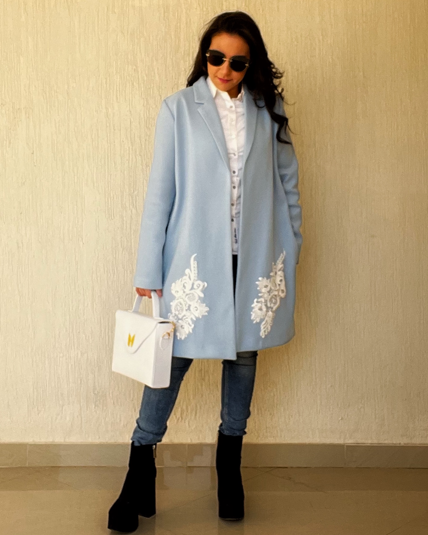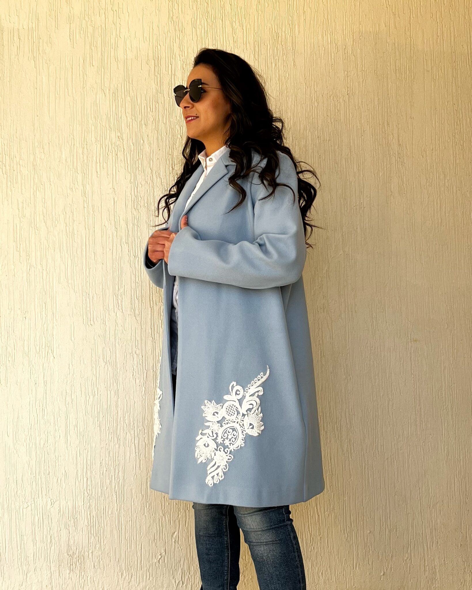 Blue coat with handmade accessory