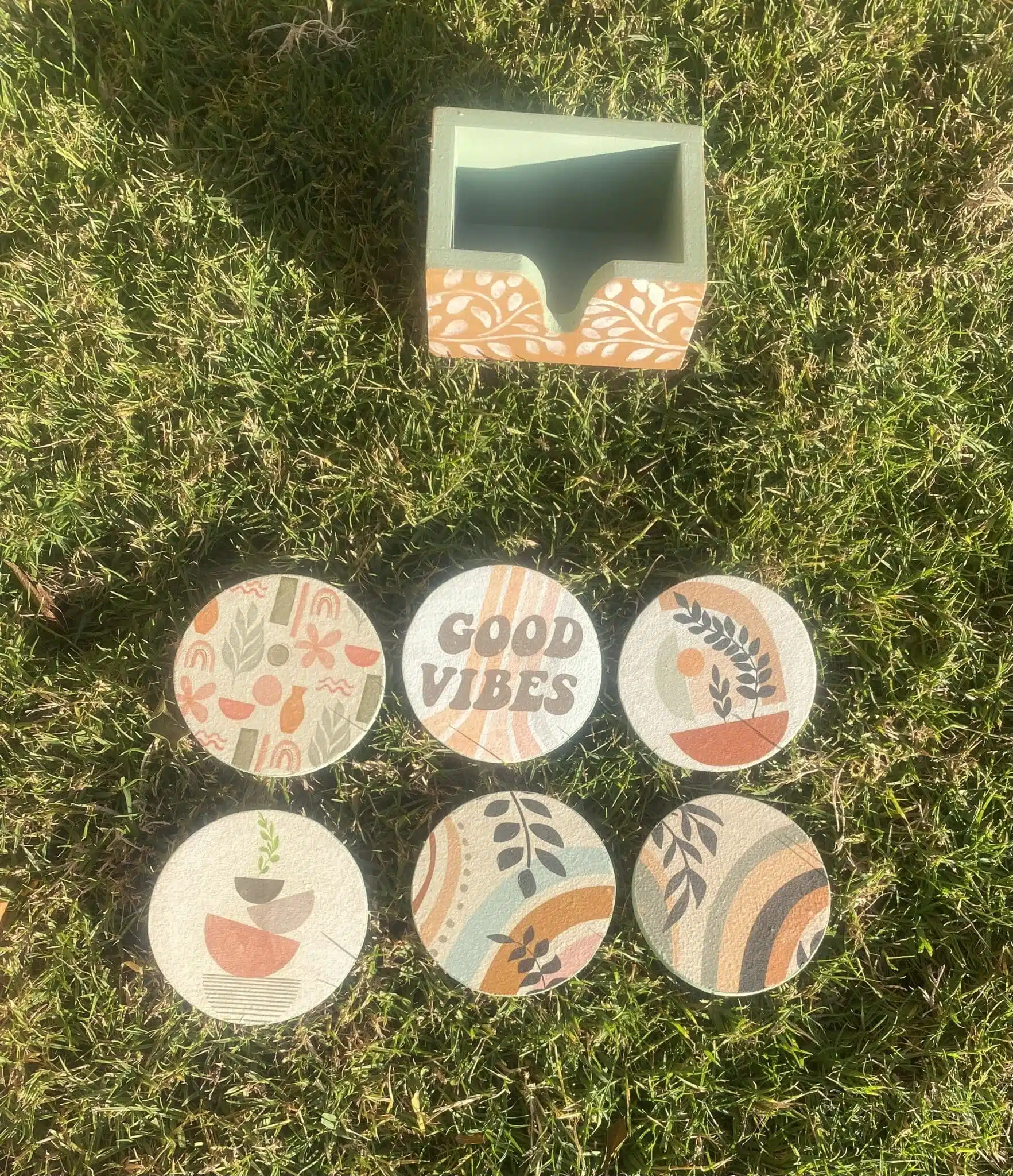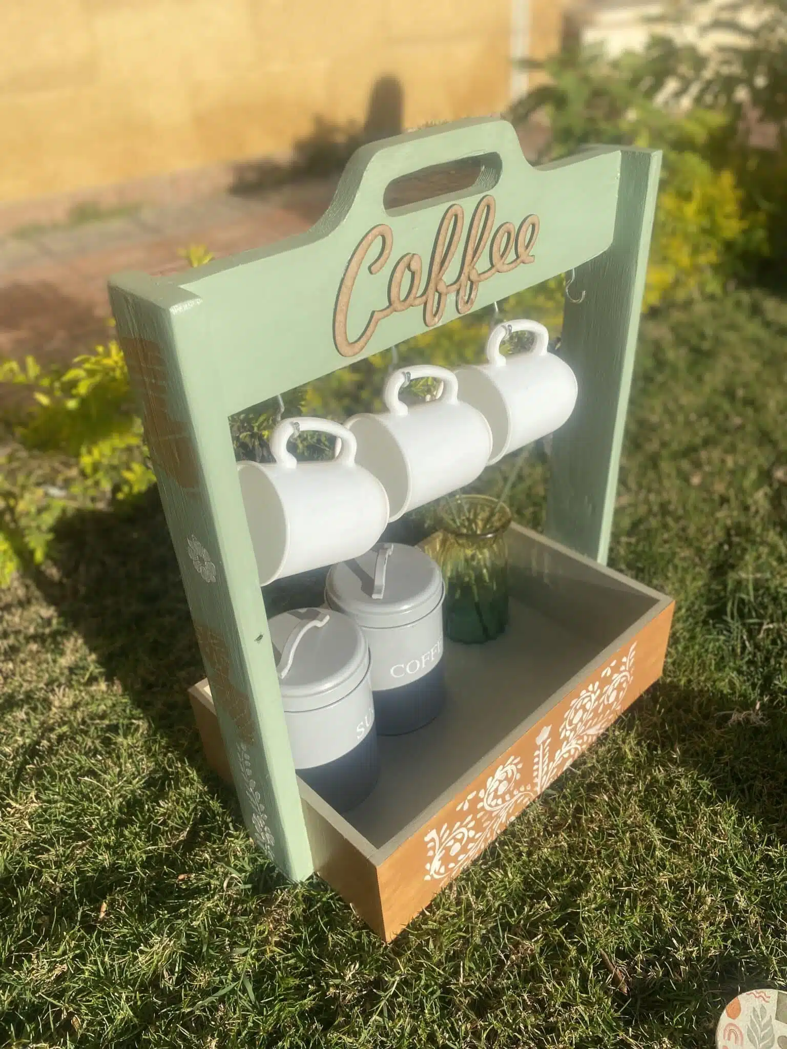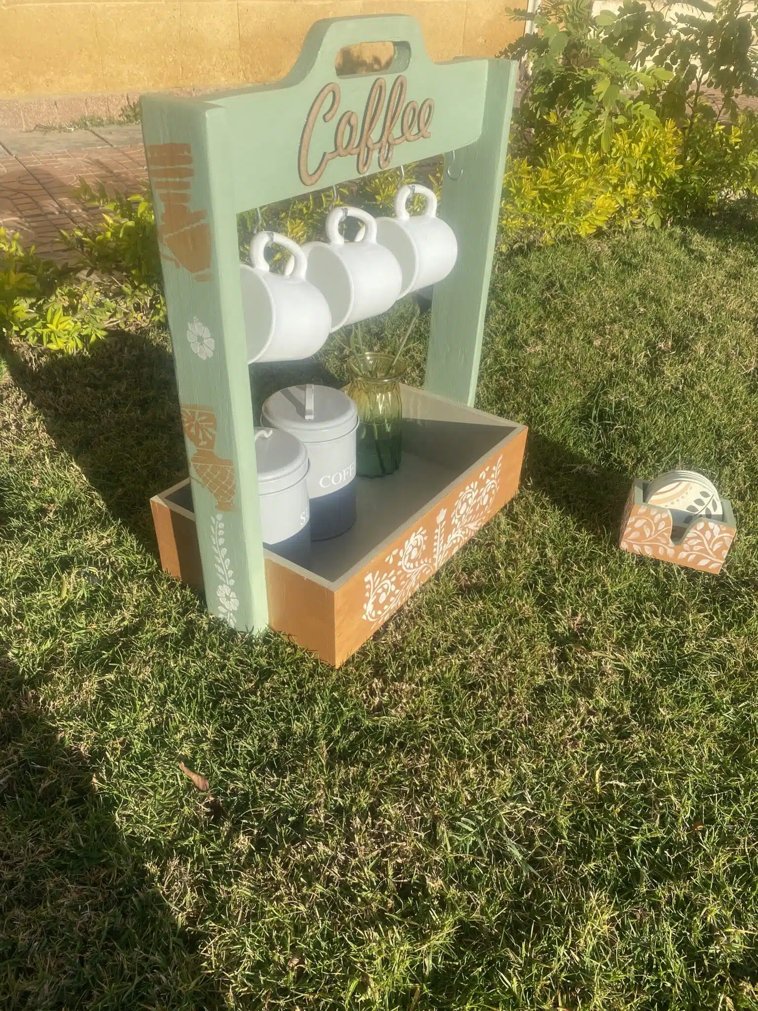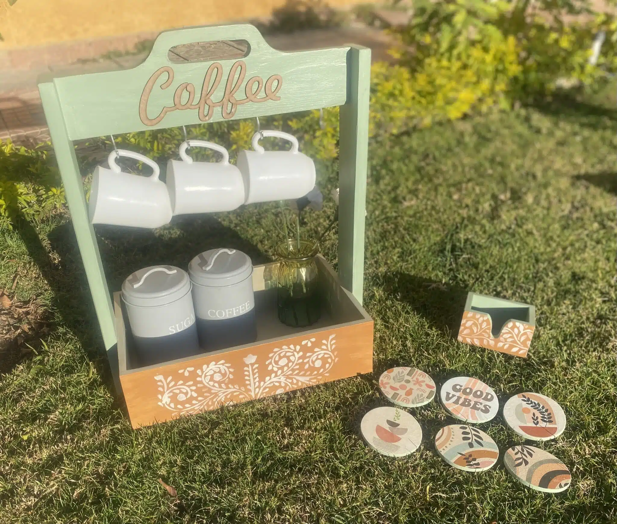 Wooden coffee stand with hooks for mugs and matching coasters in boho design