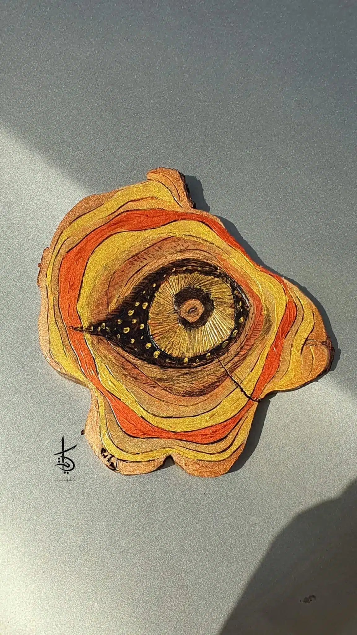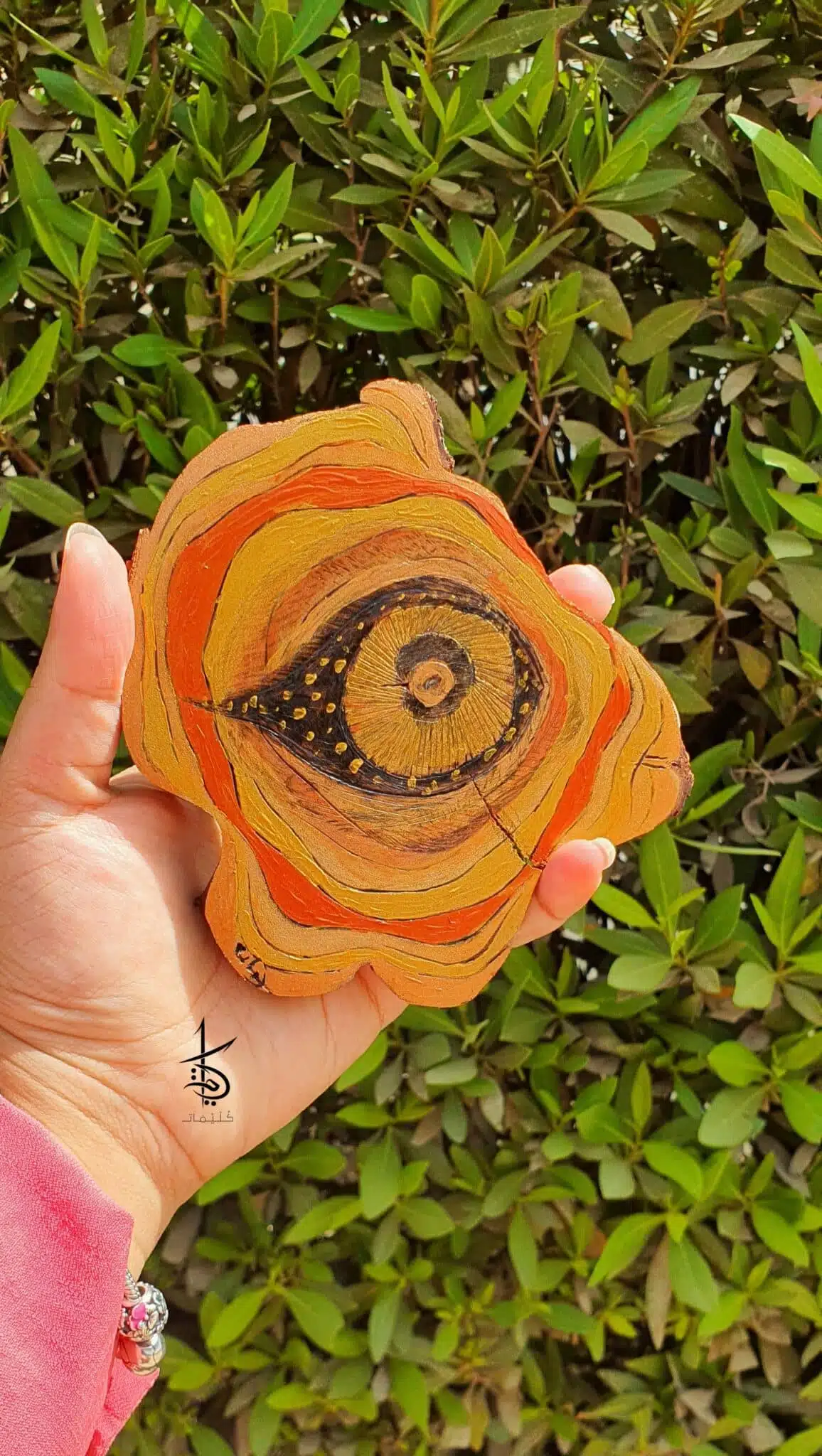 A decorative hand-burned tree slice with a dash of colors.