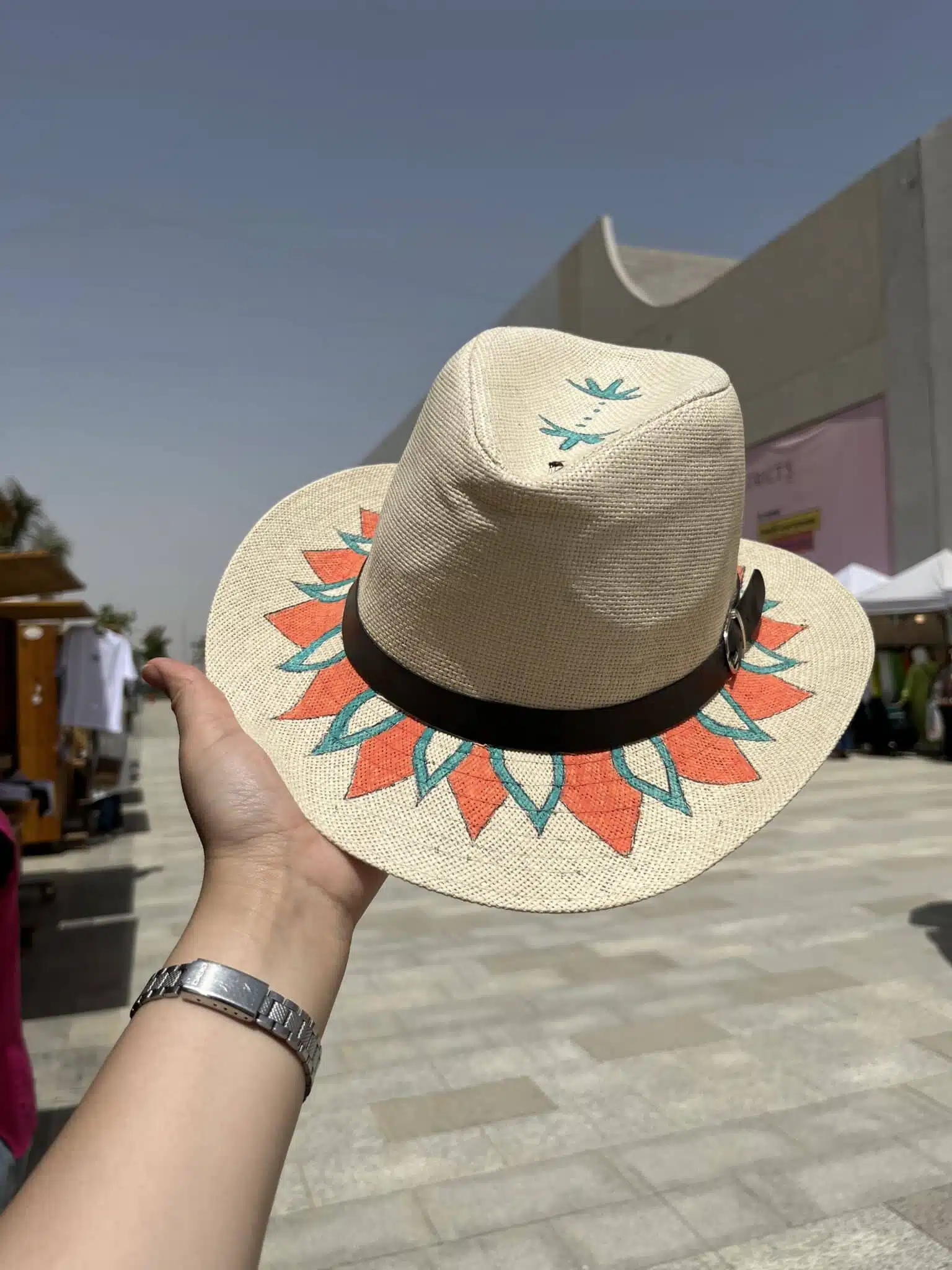 Hand painted colorful mandala summer hat with black belt