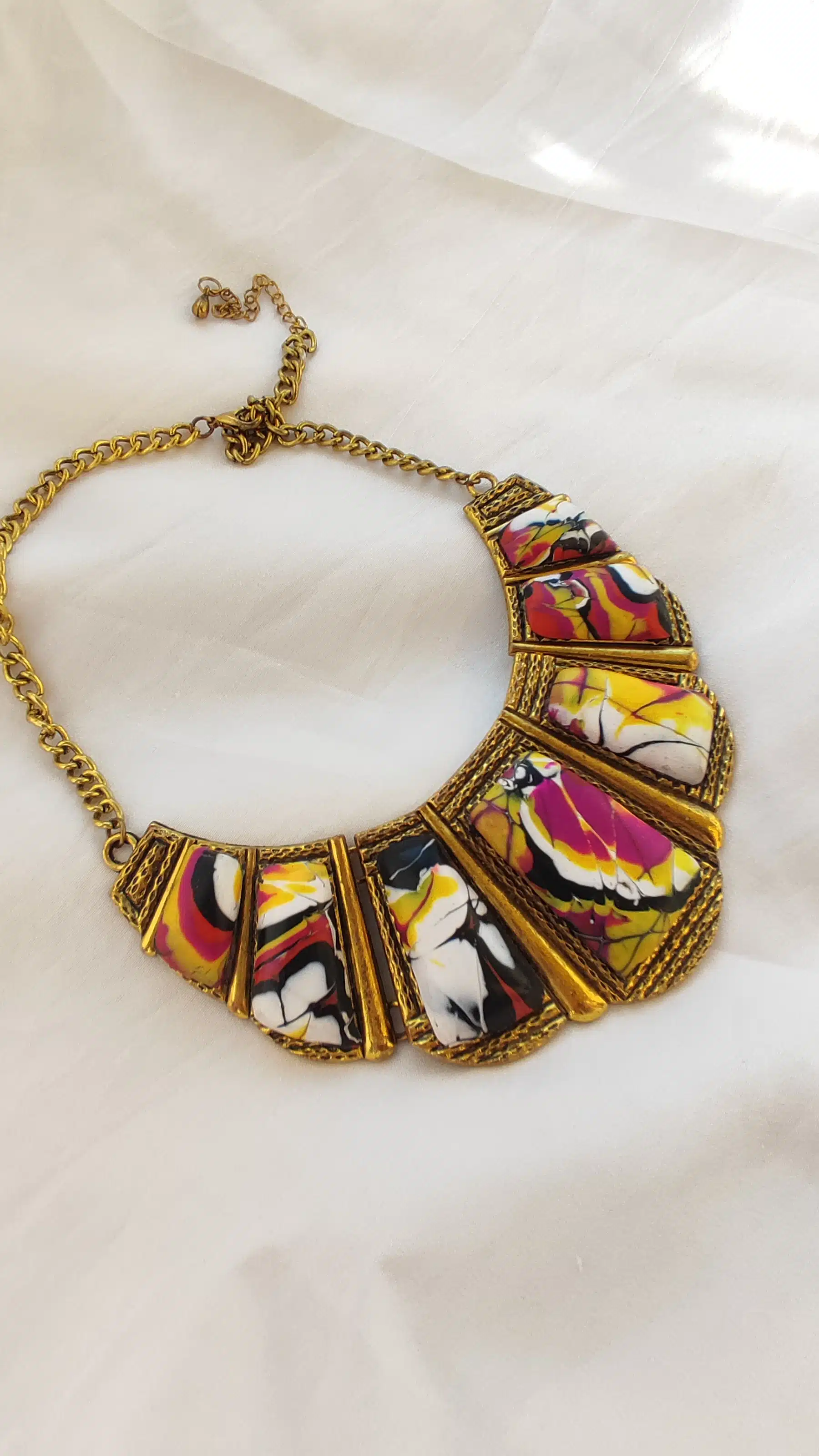 A handcrafted polymer clay necklace with a gold frame, featuring a bold design and vibrant colors. Perfect for adding a touch of elegance to any outfit.