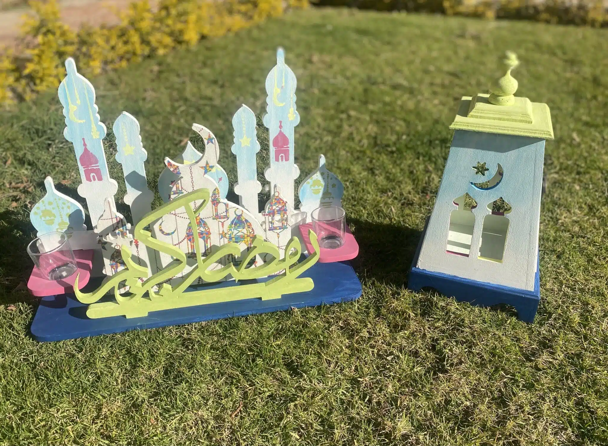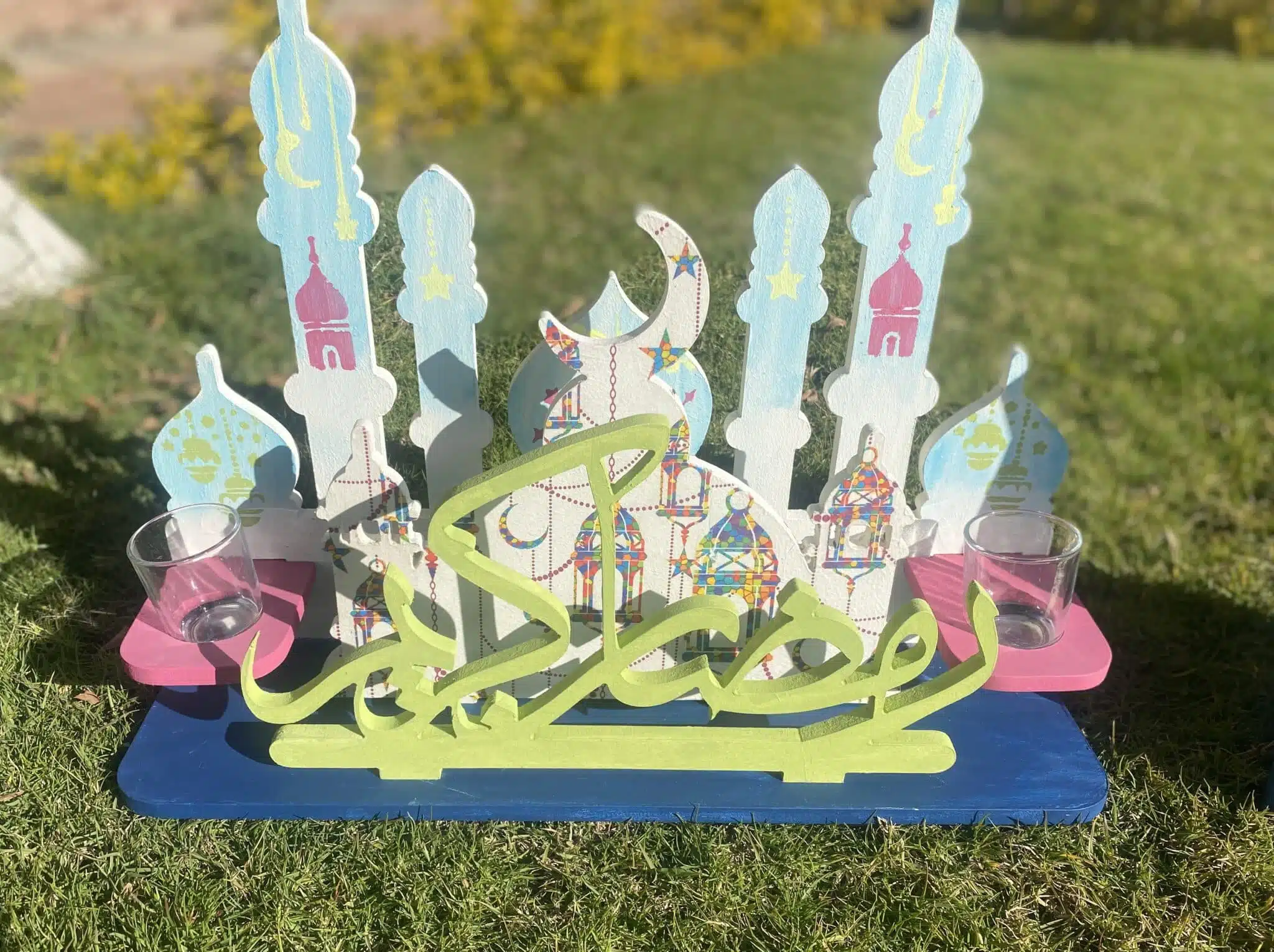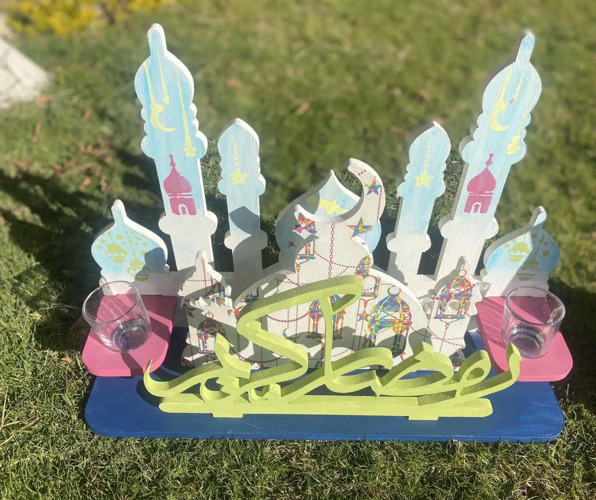 Wooden decorative stand for Ramadan in vibrant colors and candle holders cups