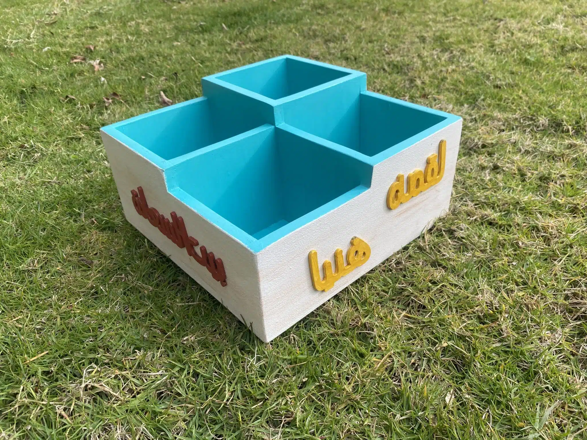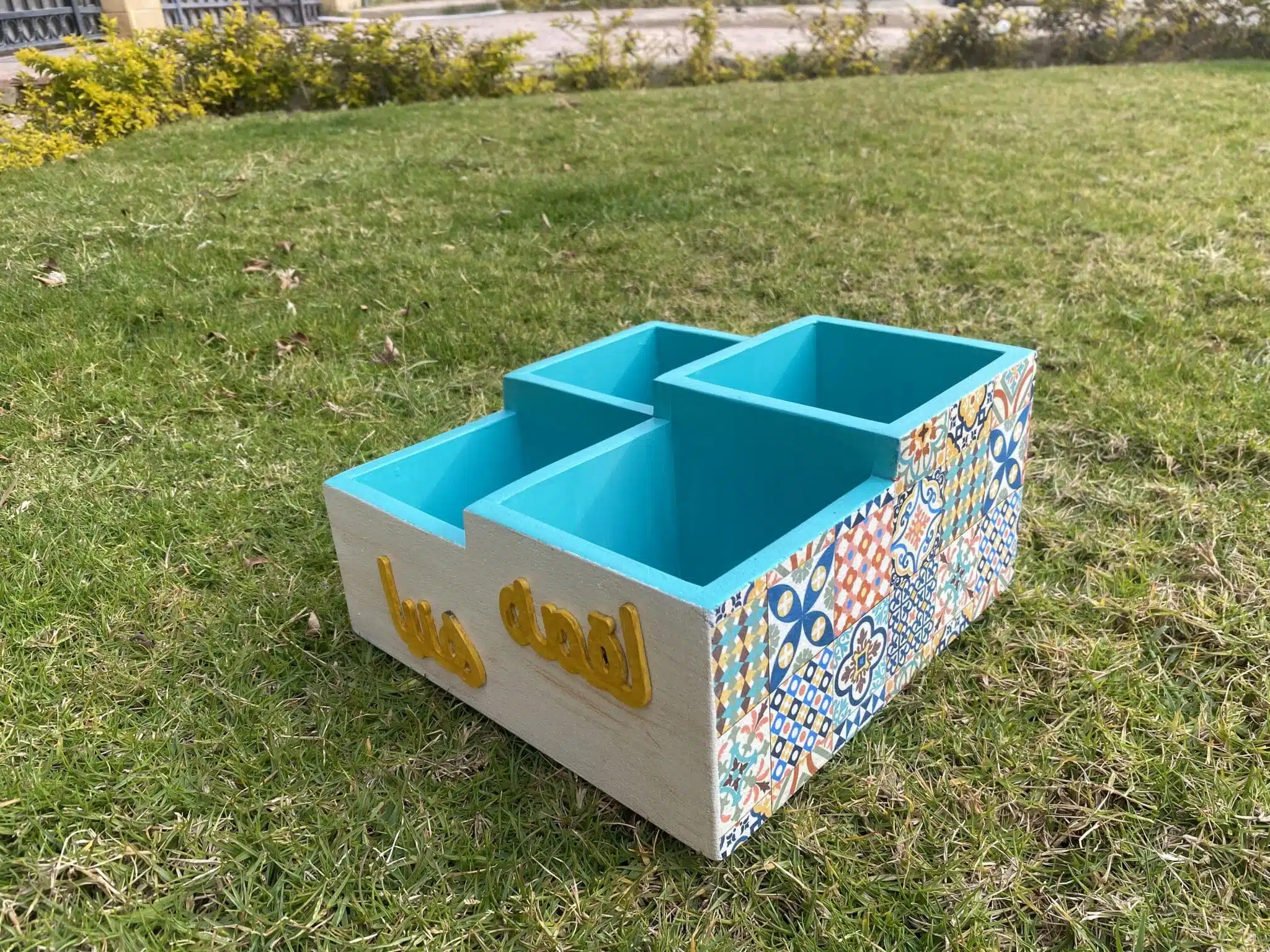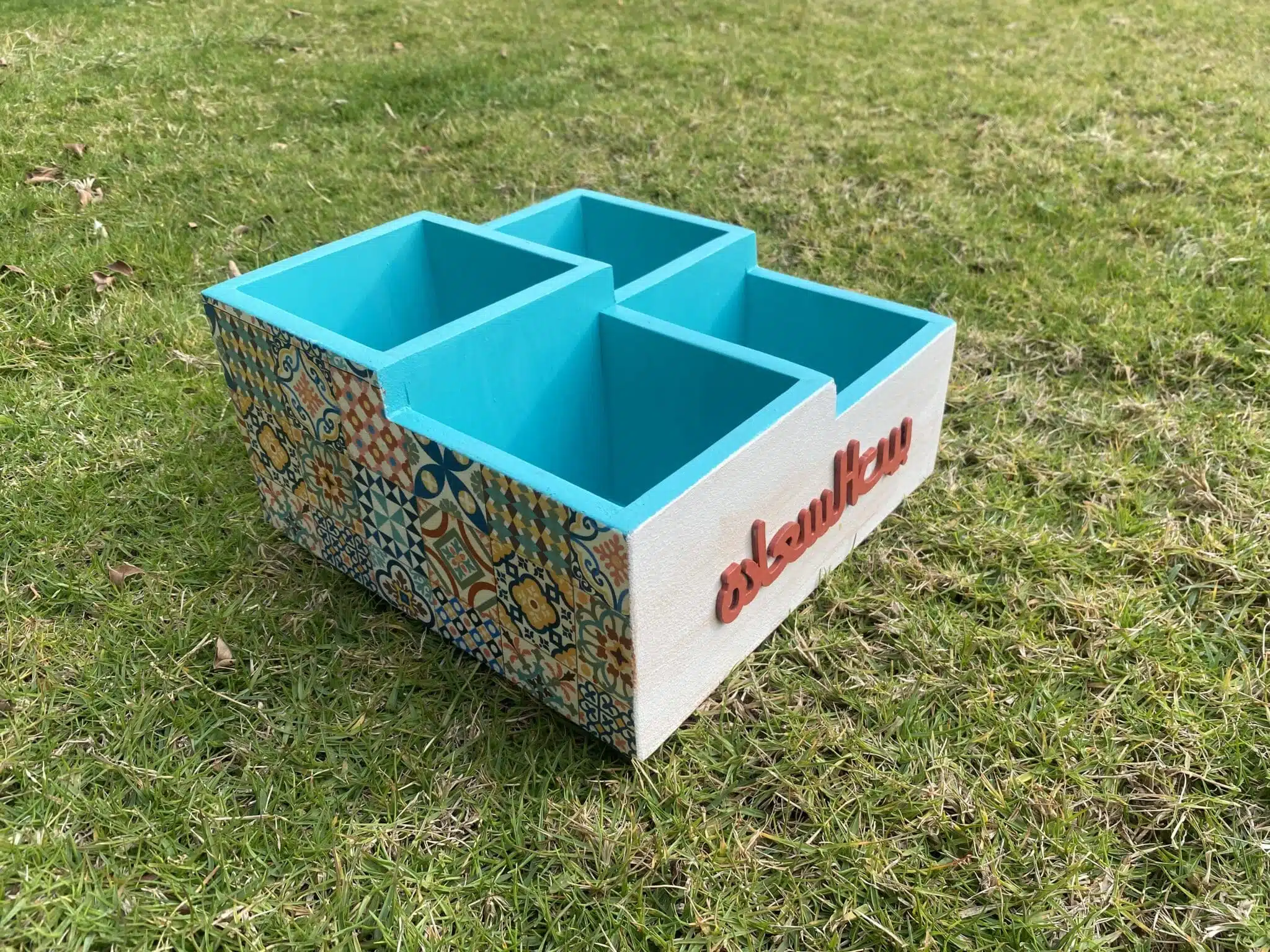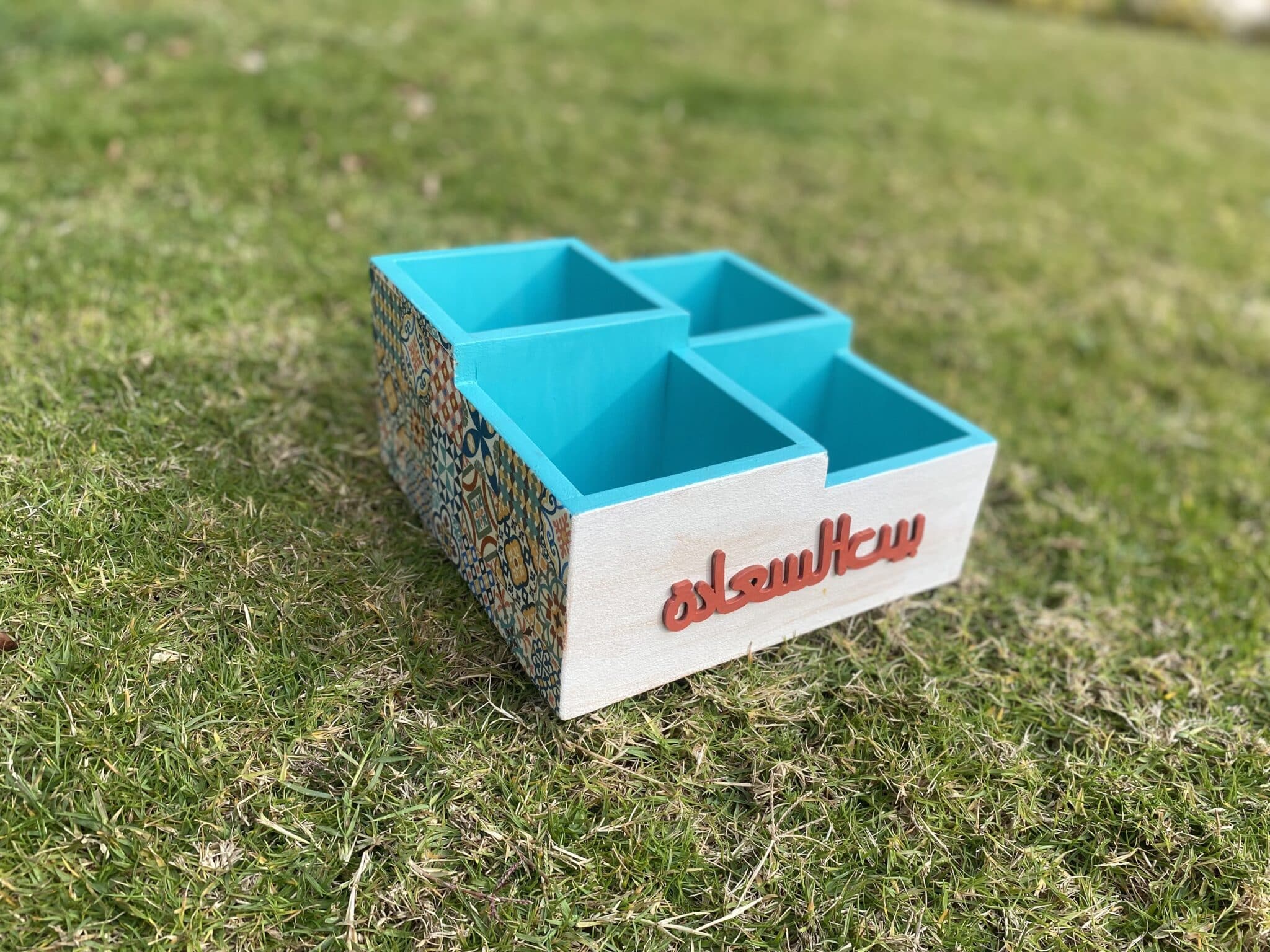 Wooden cutlery organizer in Arabic design and colorful tiles