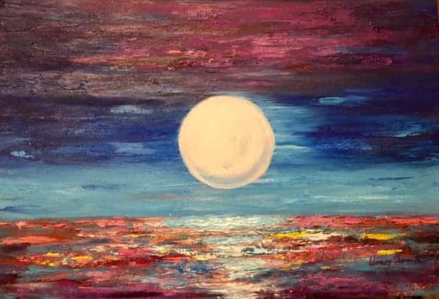Textured oil on canvas painting, with magical coloured reflections, that gives the night vibrant colours. Palette knife technique. 60×40 cm