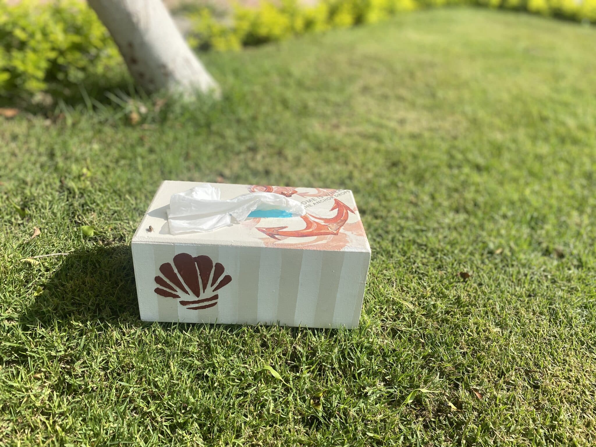 Wooden Tissue box with coral anchor design, strips beige x white