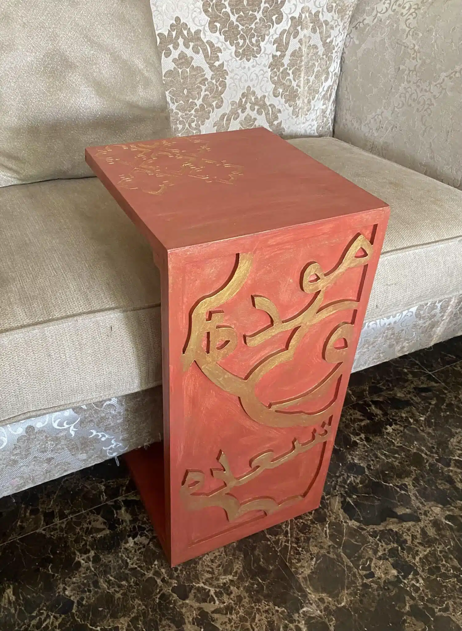 Wooden sofa side table with Arabic calligraphy “مودة وسعادة”
