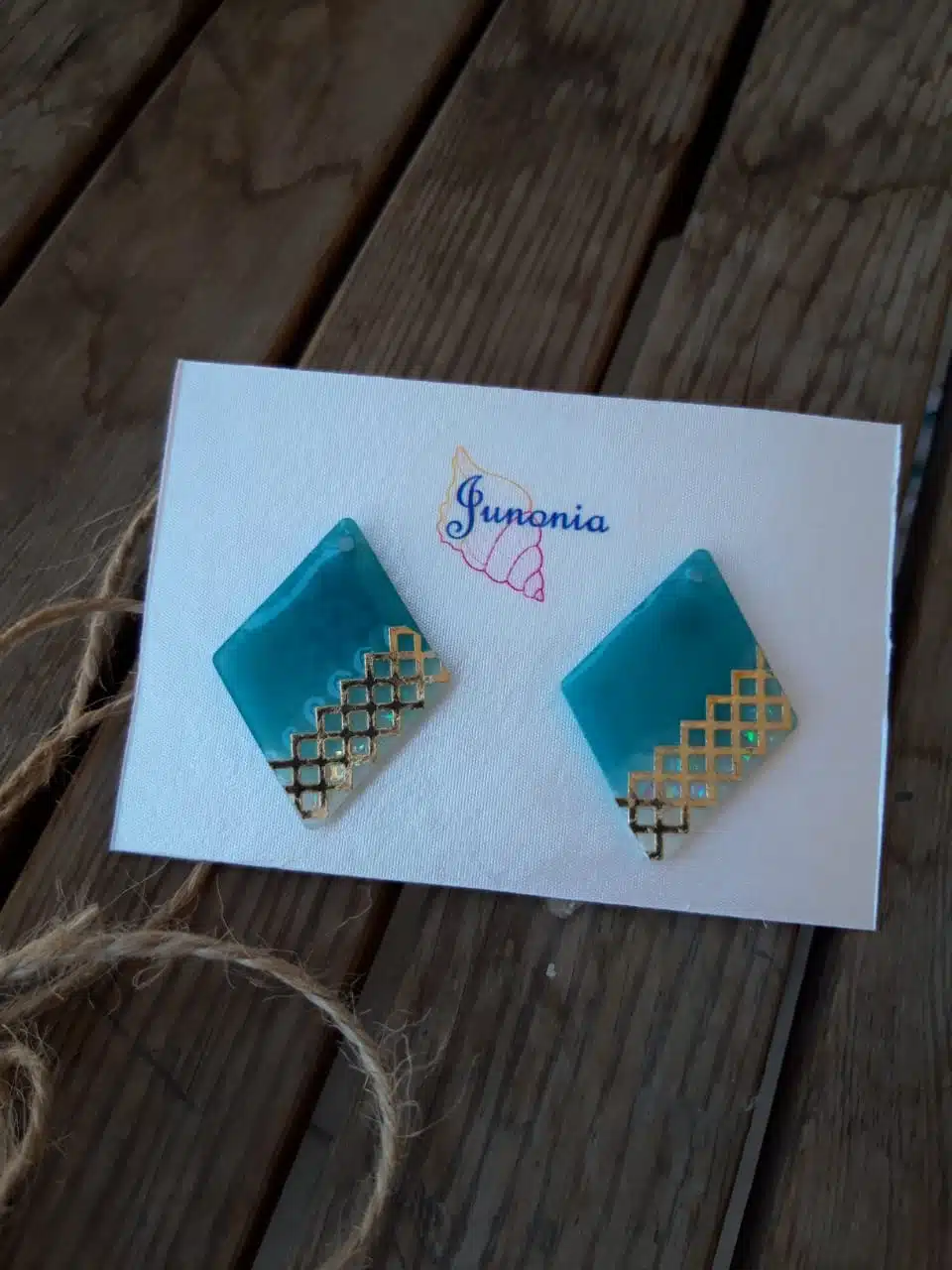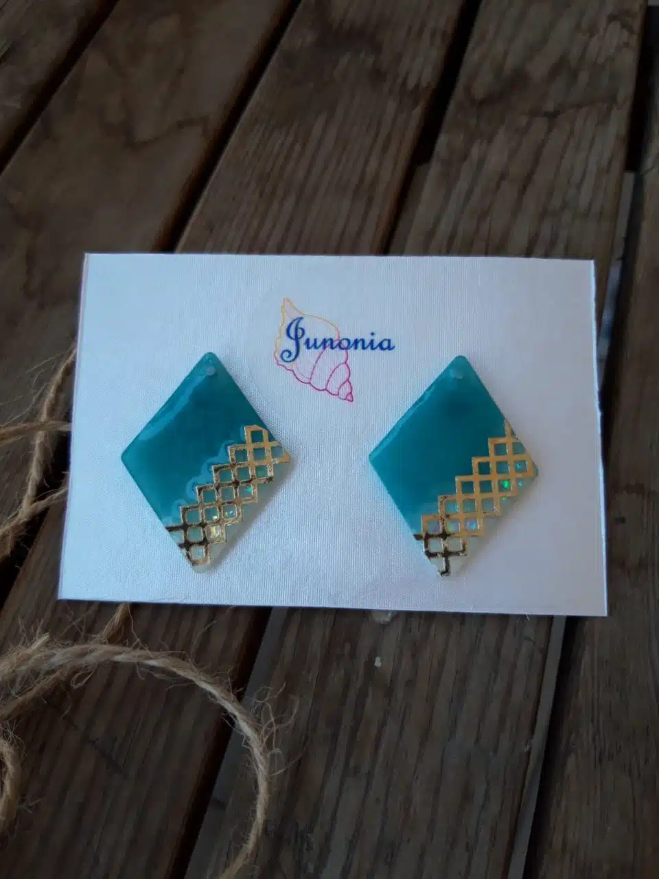 Turquoise Rhombus shaped earrings with golden pattern