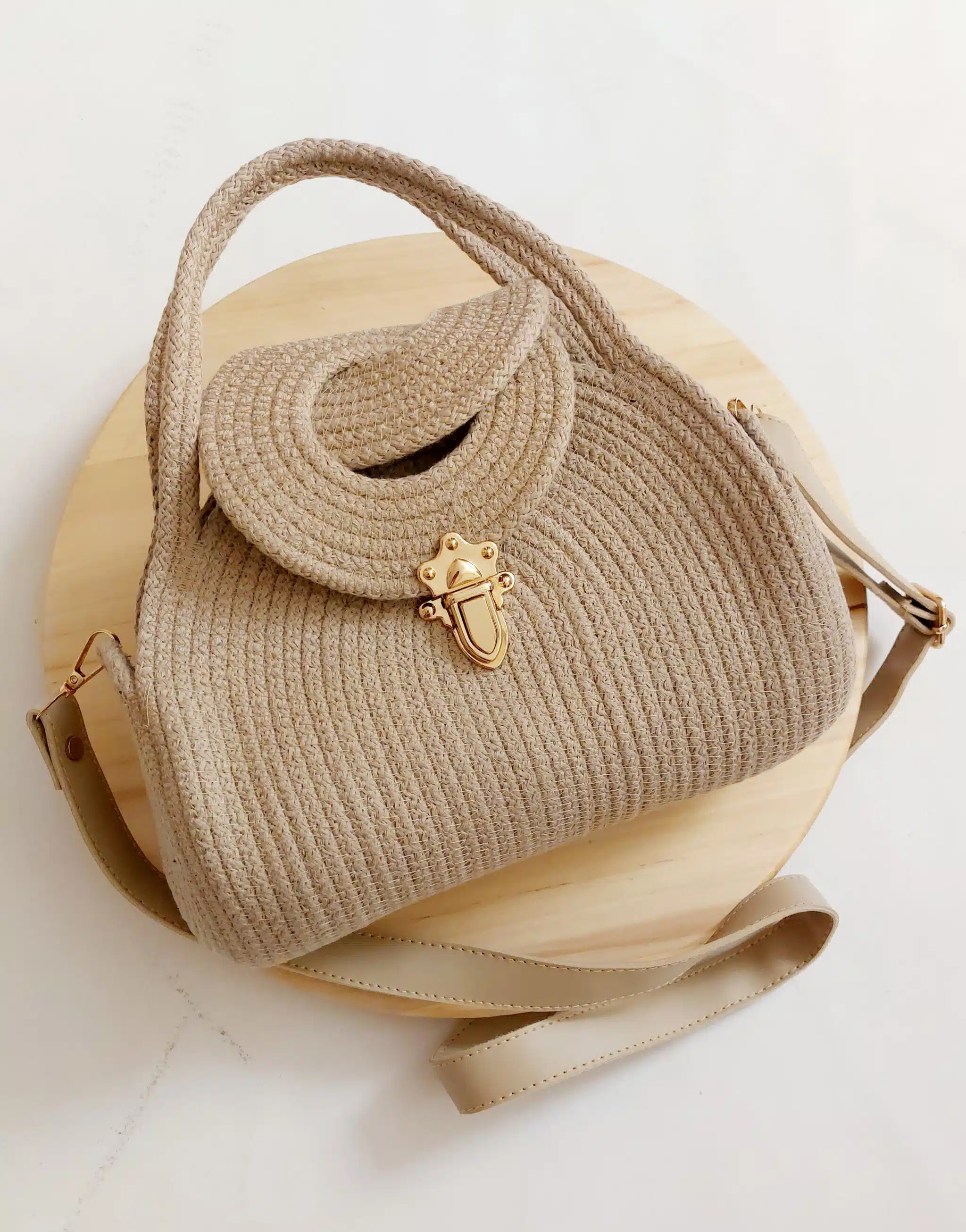 Perfect medium size 25×26 cm eco-friendly rope bag with adjustable faux leather handles.. and removable pompom charm.. change the handle and get a new look for your bag ..