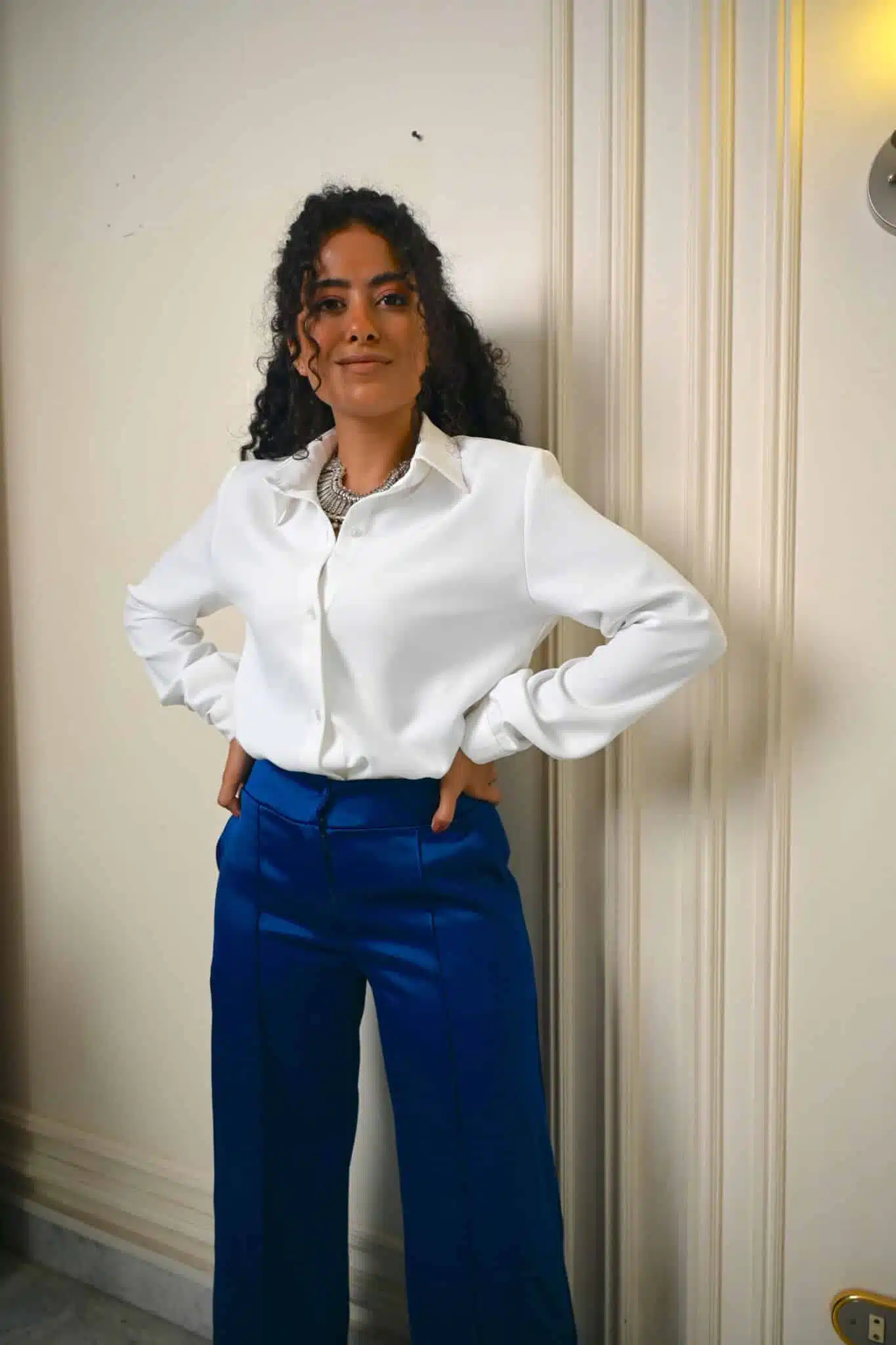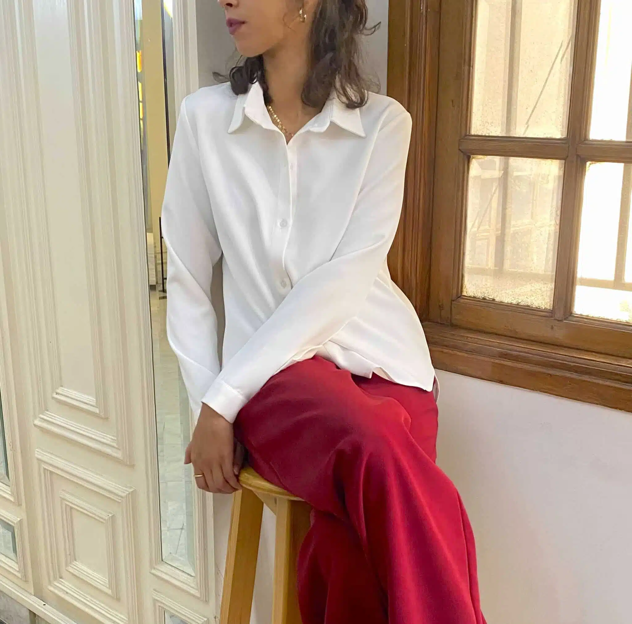 This soft crêpe shirt will give you enough matter and shape to be worn alone in the autumn, as well as some warmth when worn under a blazer for the slightly colder days. It is not transparent and the color is so crisp. With just a necklace, it stands out with elegance.
