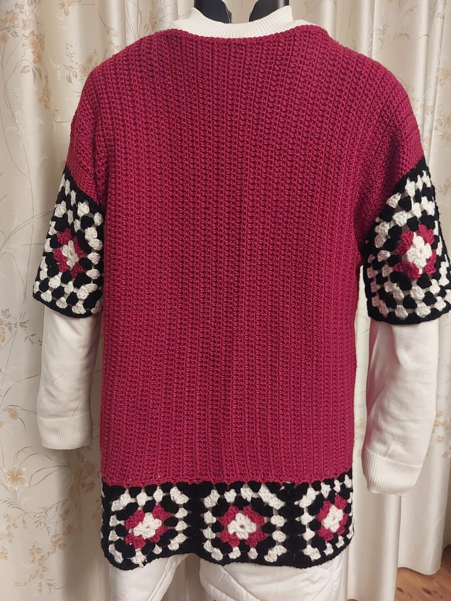 Red colour with black and white granny squares.