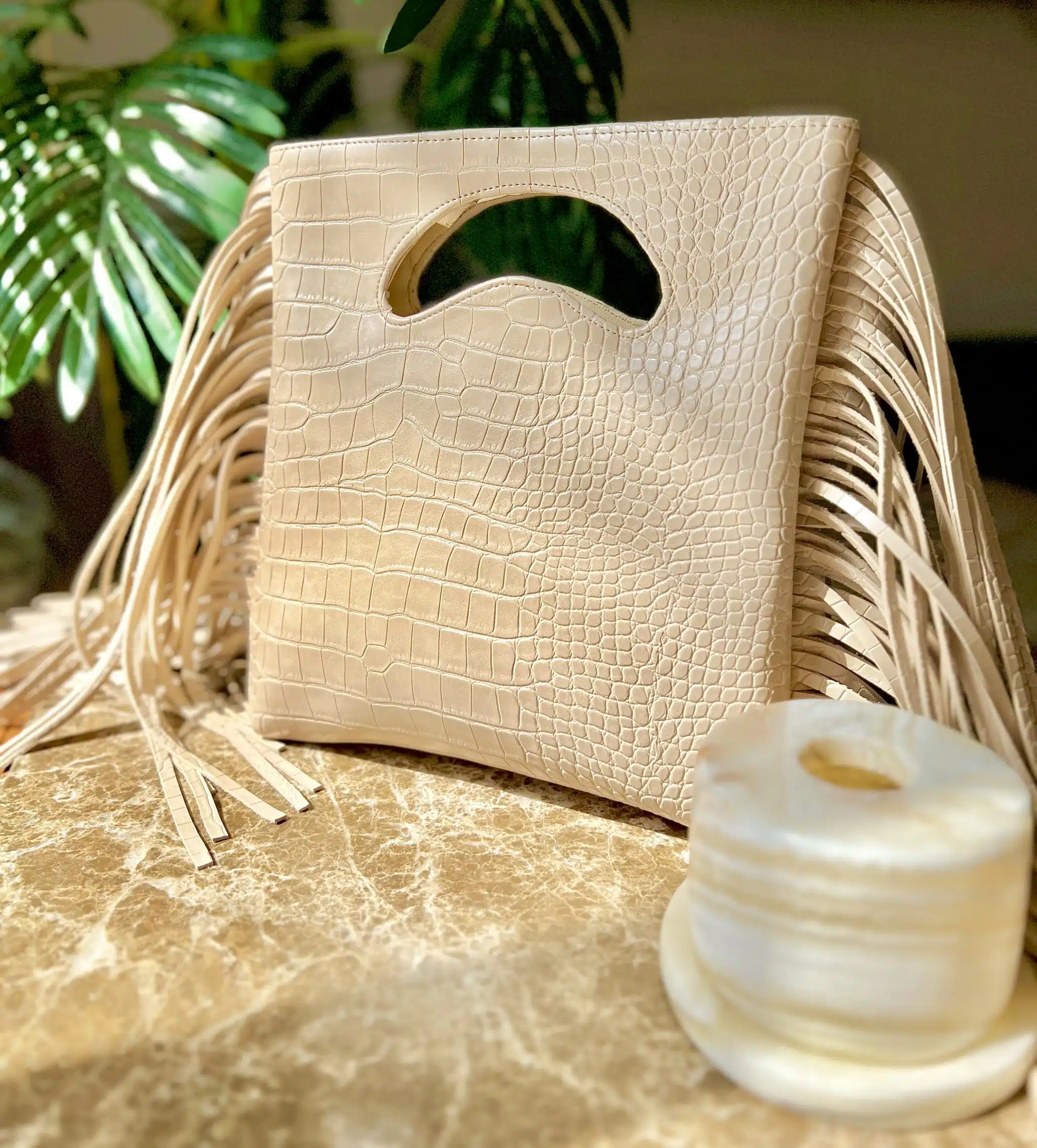 the textured faux crocodile leather paired with dynamic side fringes evokes movement, freedomSoft, neutral, and endlessly versatile. Crocova Sand brings effortless elegance to your everyday chic.Ideal for boho-chic and earthy-styled outfits.