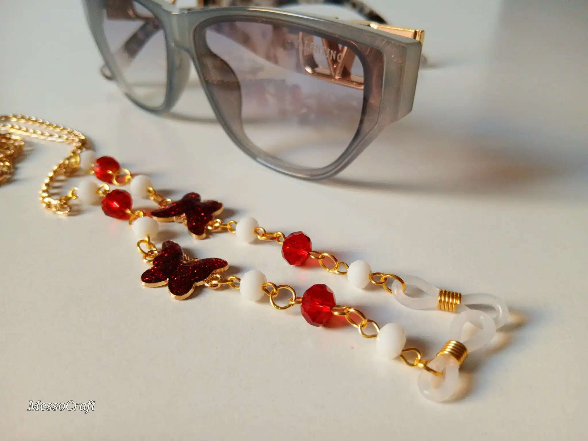 Glasses chain in White / Red crystal stones with a butterfly pendant in a unique style