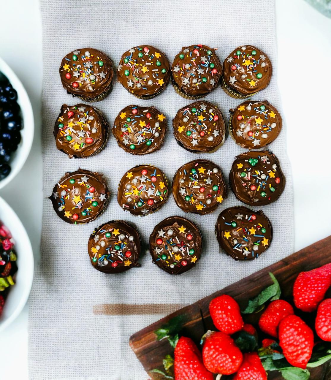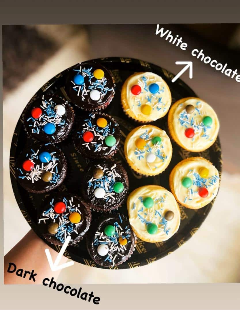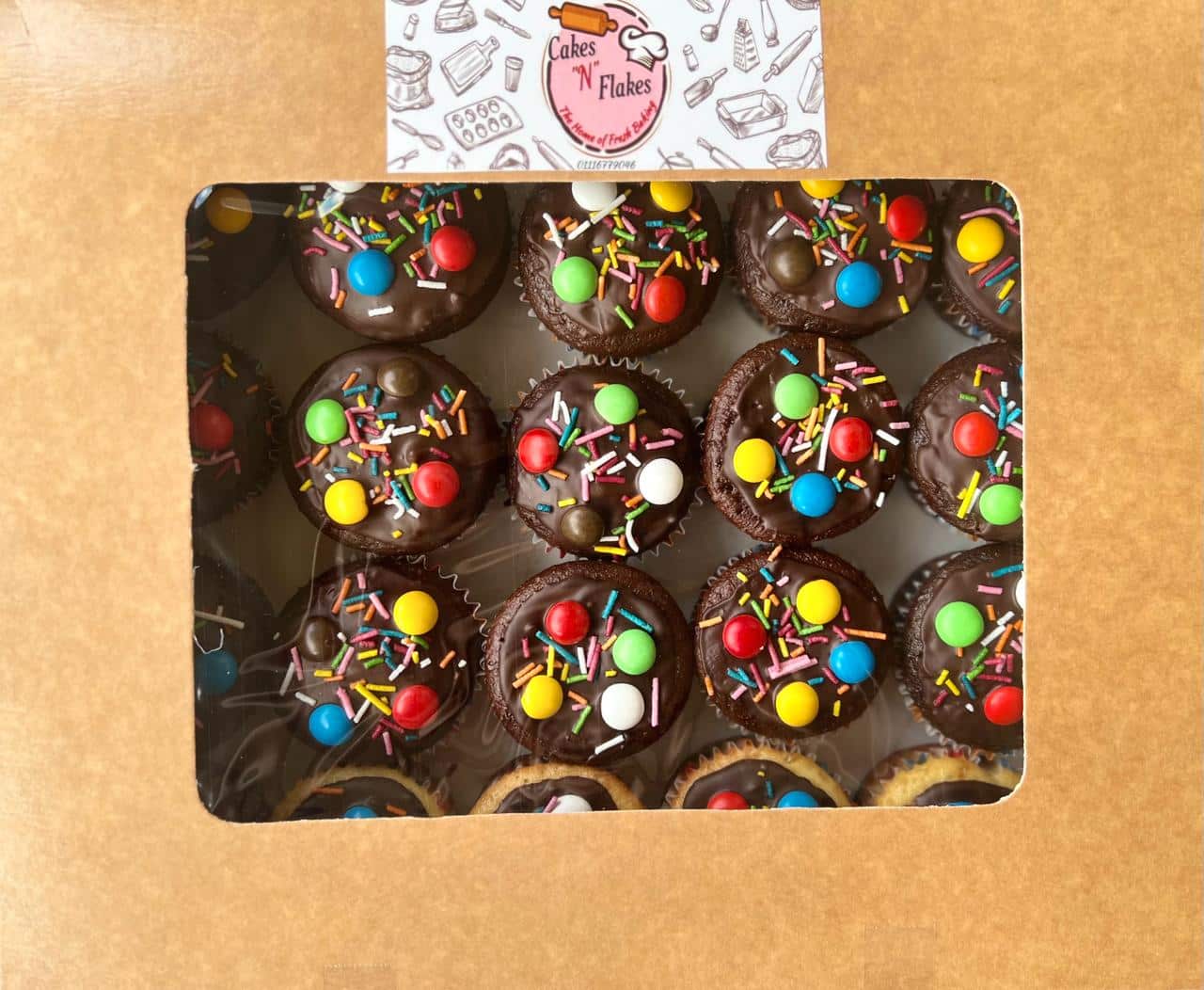 Customized chocolate or vanilla cupcakes topped with white or dark chocolate with M&Ms and sprinkles