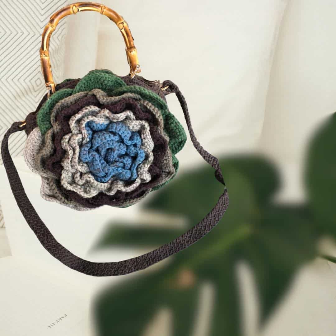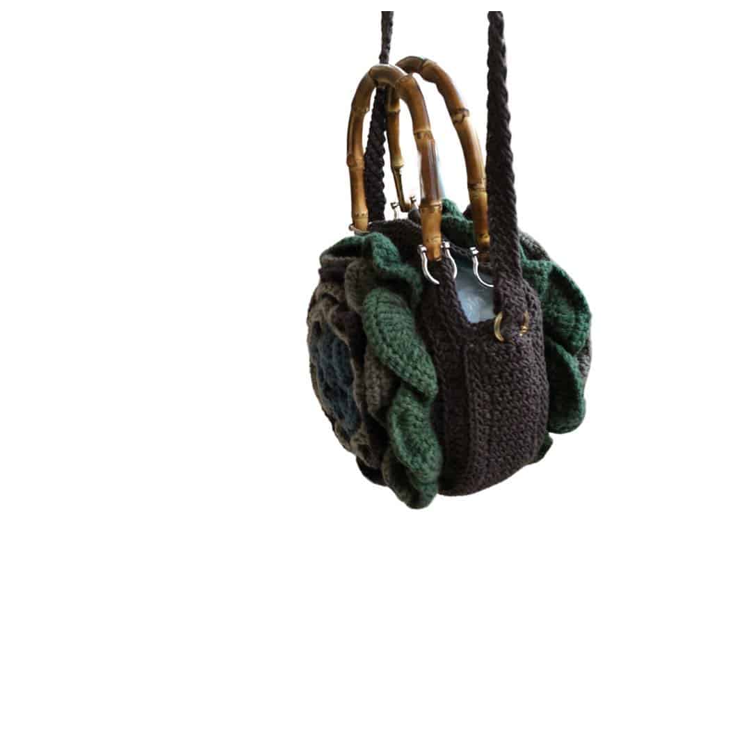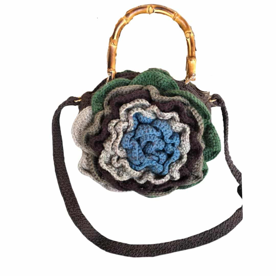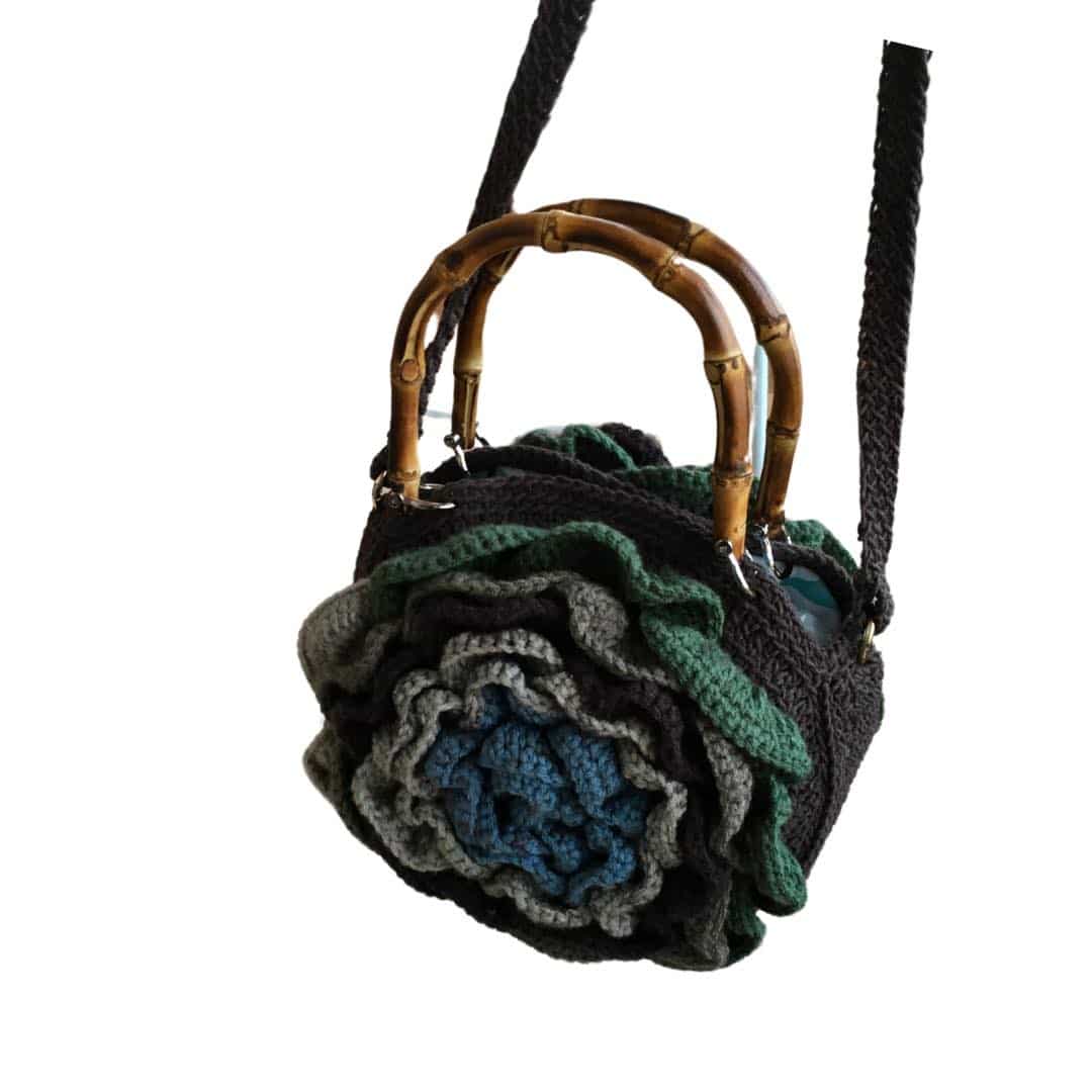 Handmade crochet bag, flower shape from both sides, made of brown cotton yarn and multi color flower