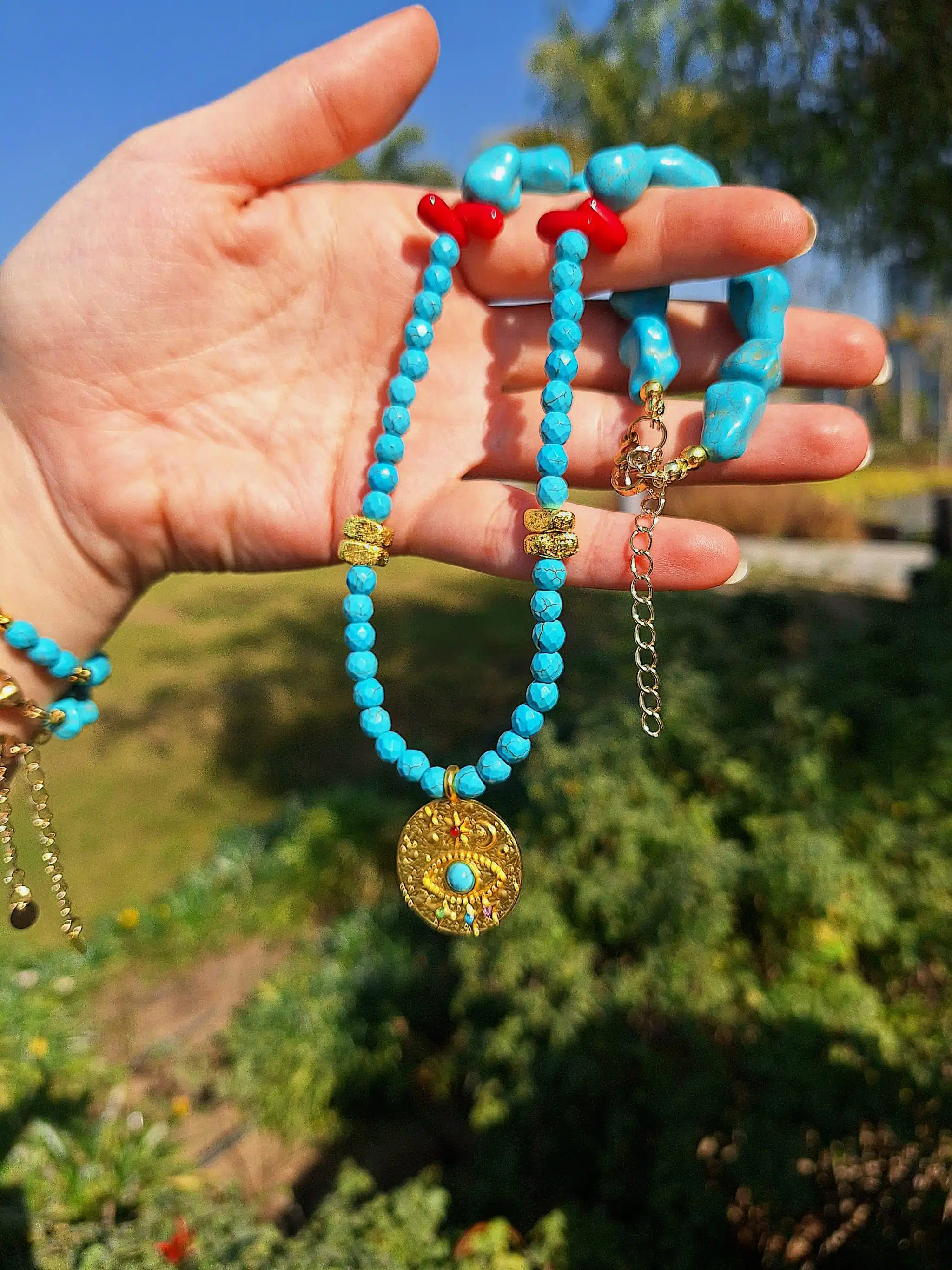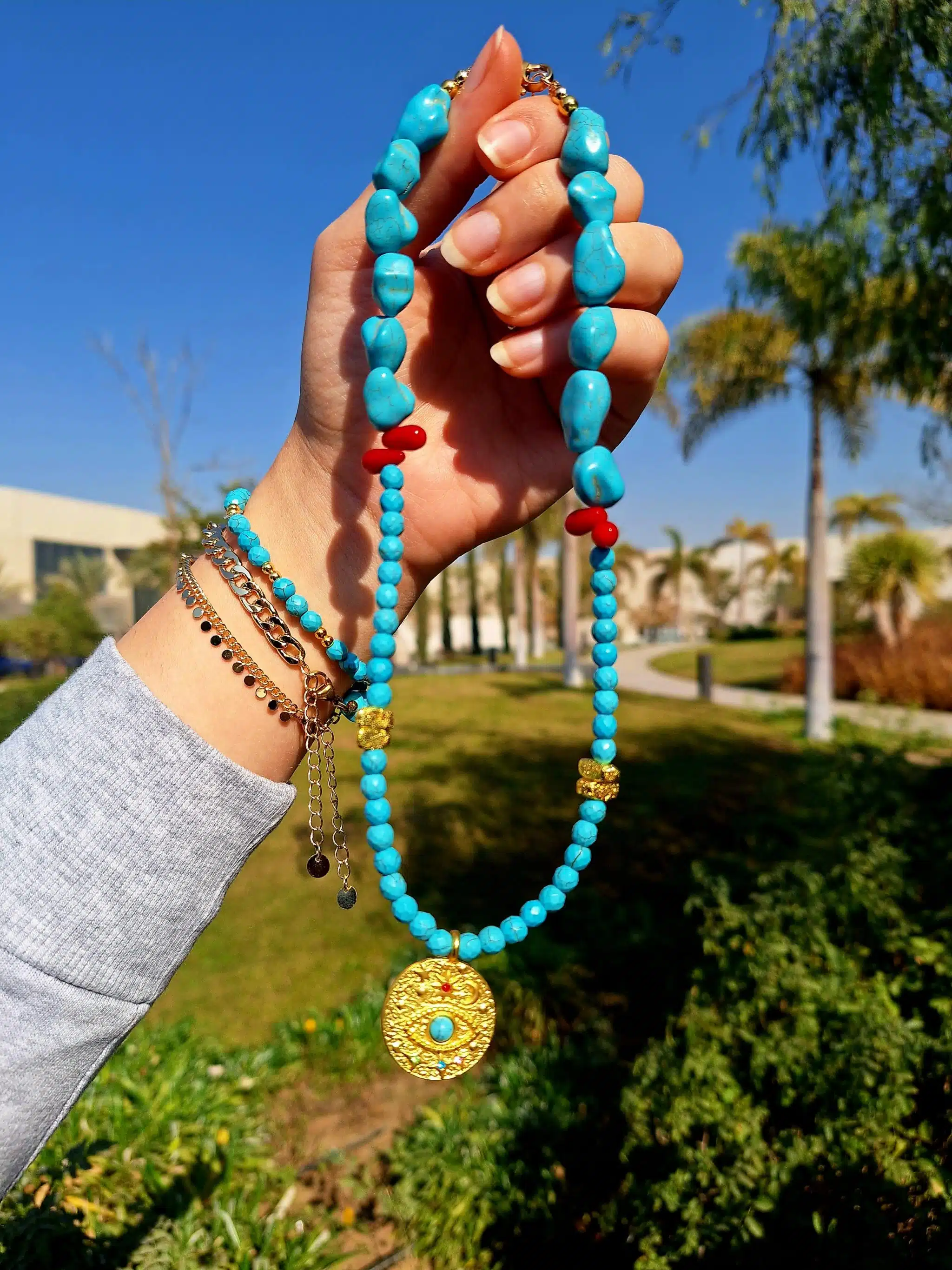 سلسلة هاندميد مصنوعة من أحجار الفيروز و مرجان أحمر طبيعي مع دلاية مطلية باللون الذهبي غير قابلة .للصدأ ولا يتغير لونها قفل من الاستانلس ستيل