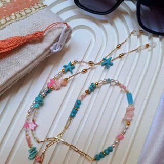 سلسلة هاندميد مصنوعة من أحجار الفيروز و مرجان أحمر طبيعي مع دلاية مطلية باللون الذهبي غير قابلة .للصدأ ولا يتغير لونها قفل من الاستانلس ستيل