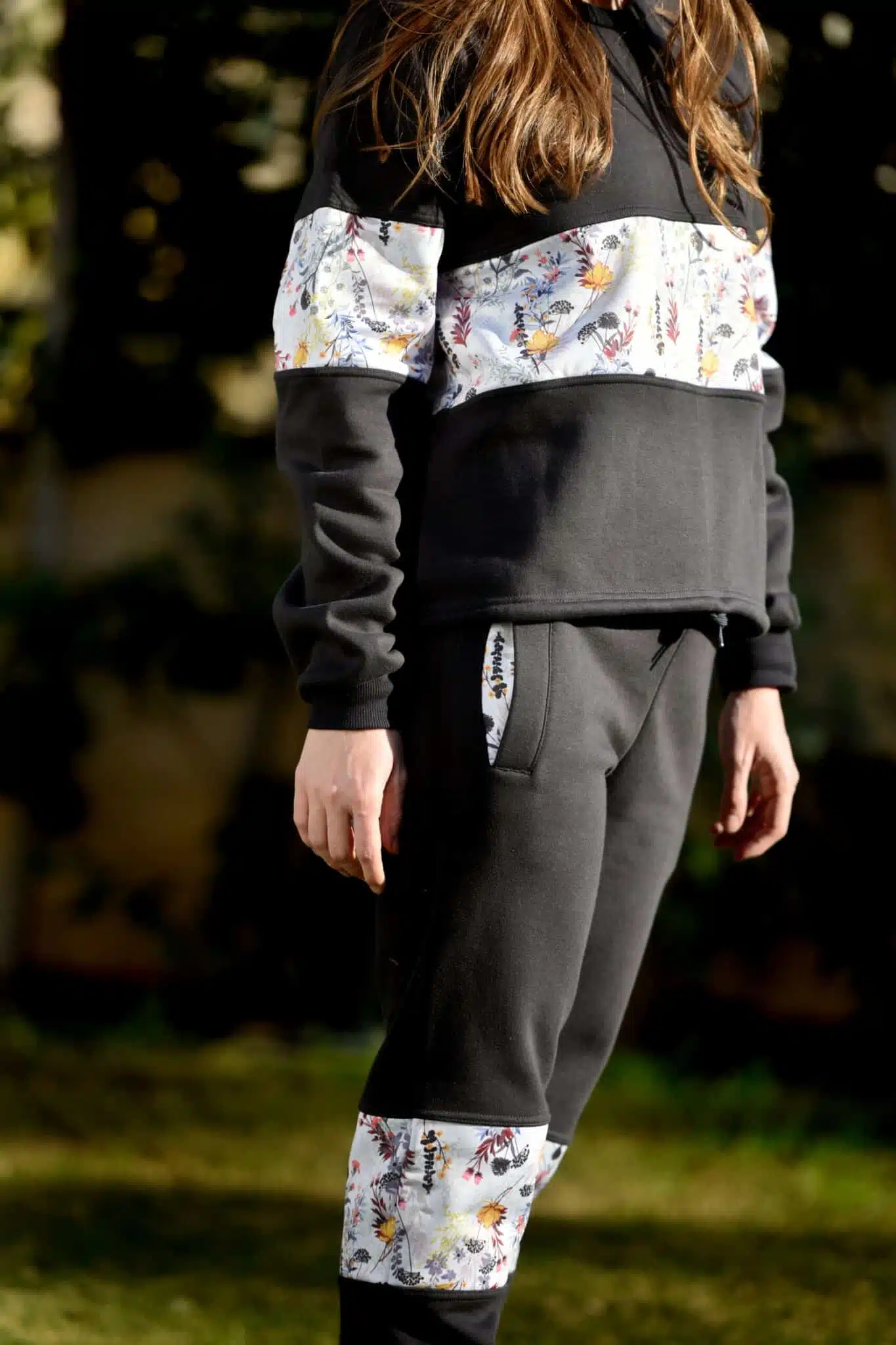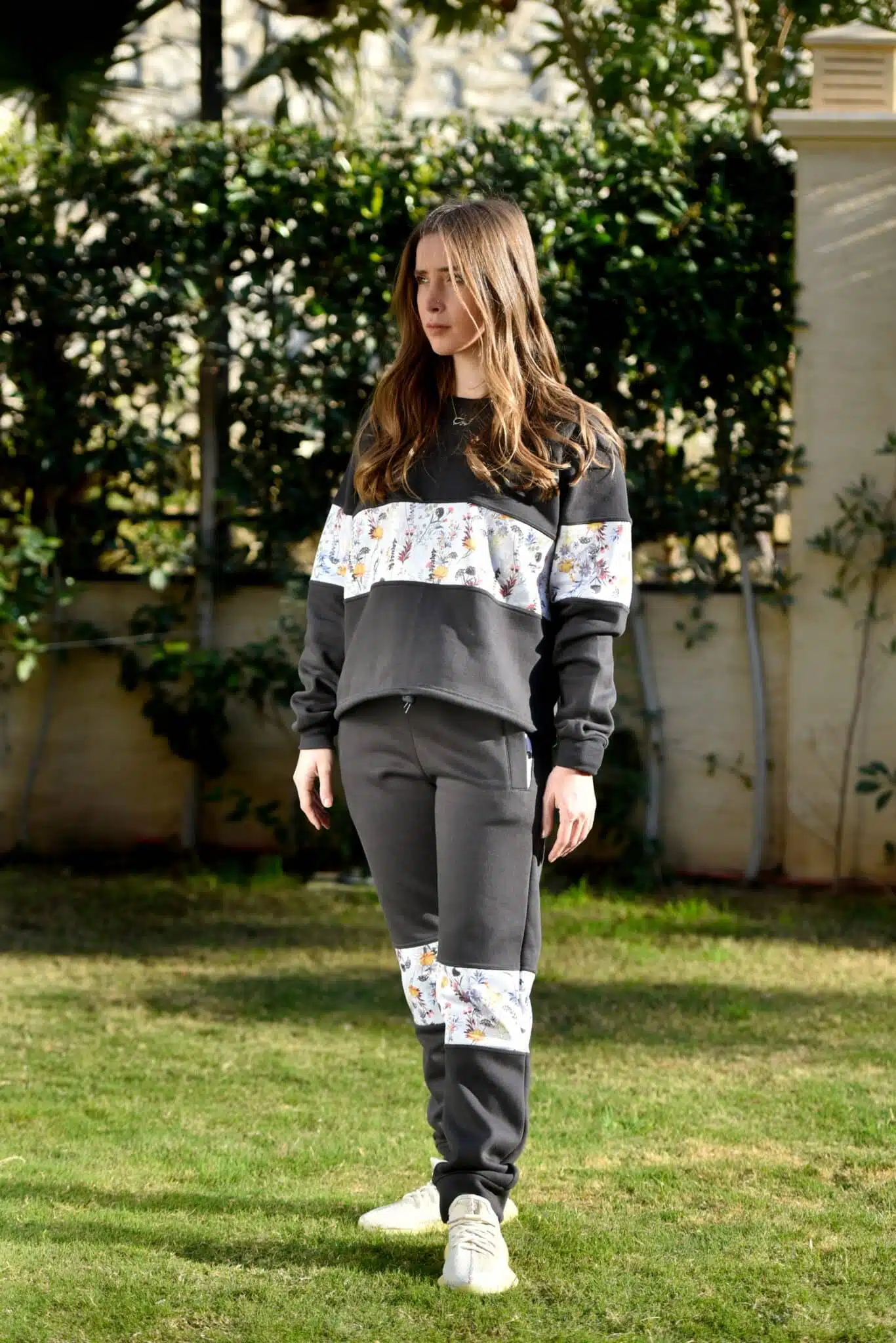 - crew neck sweatshirt with wild flowers print with adjustable drawstrings