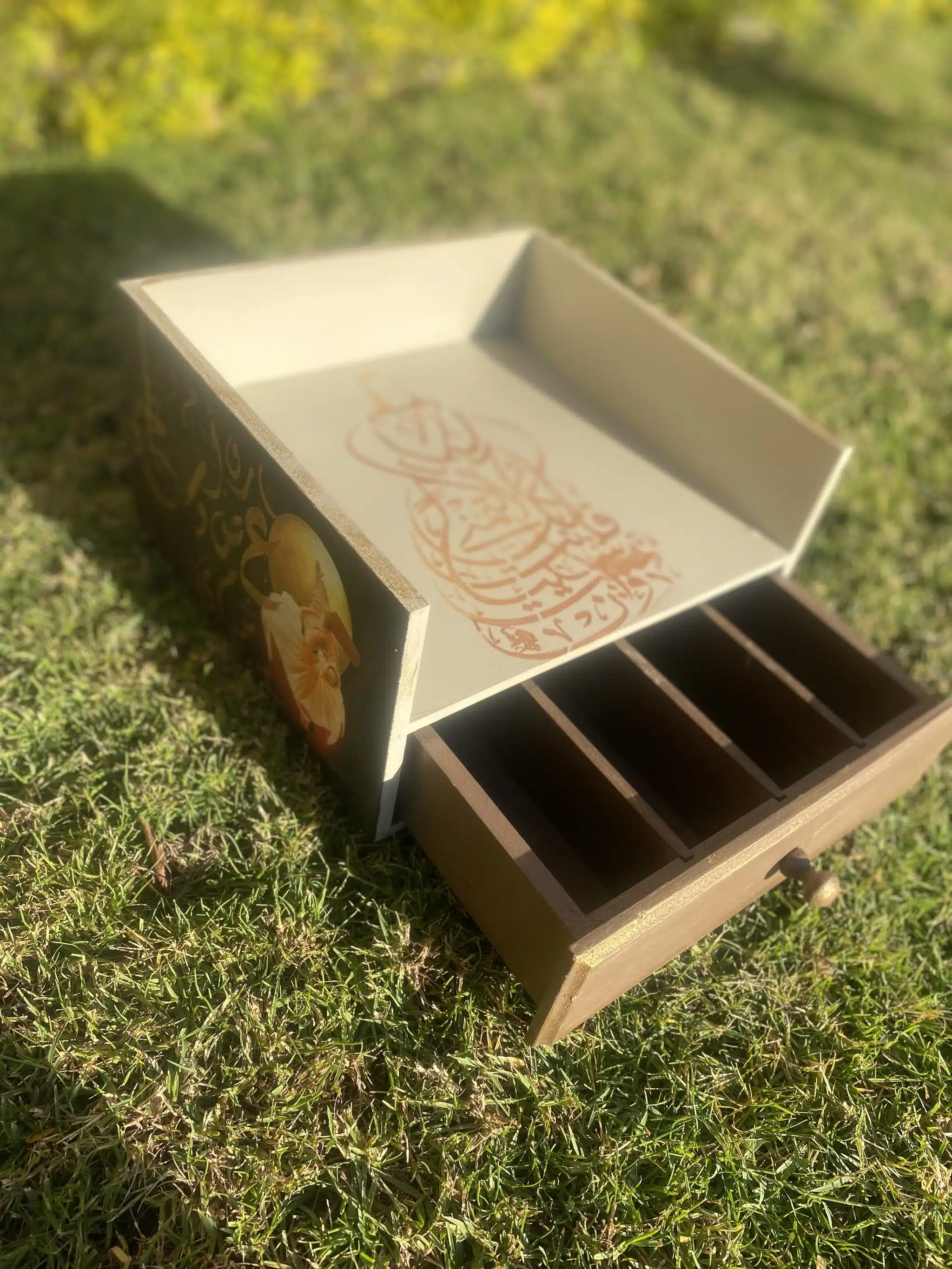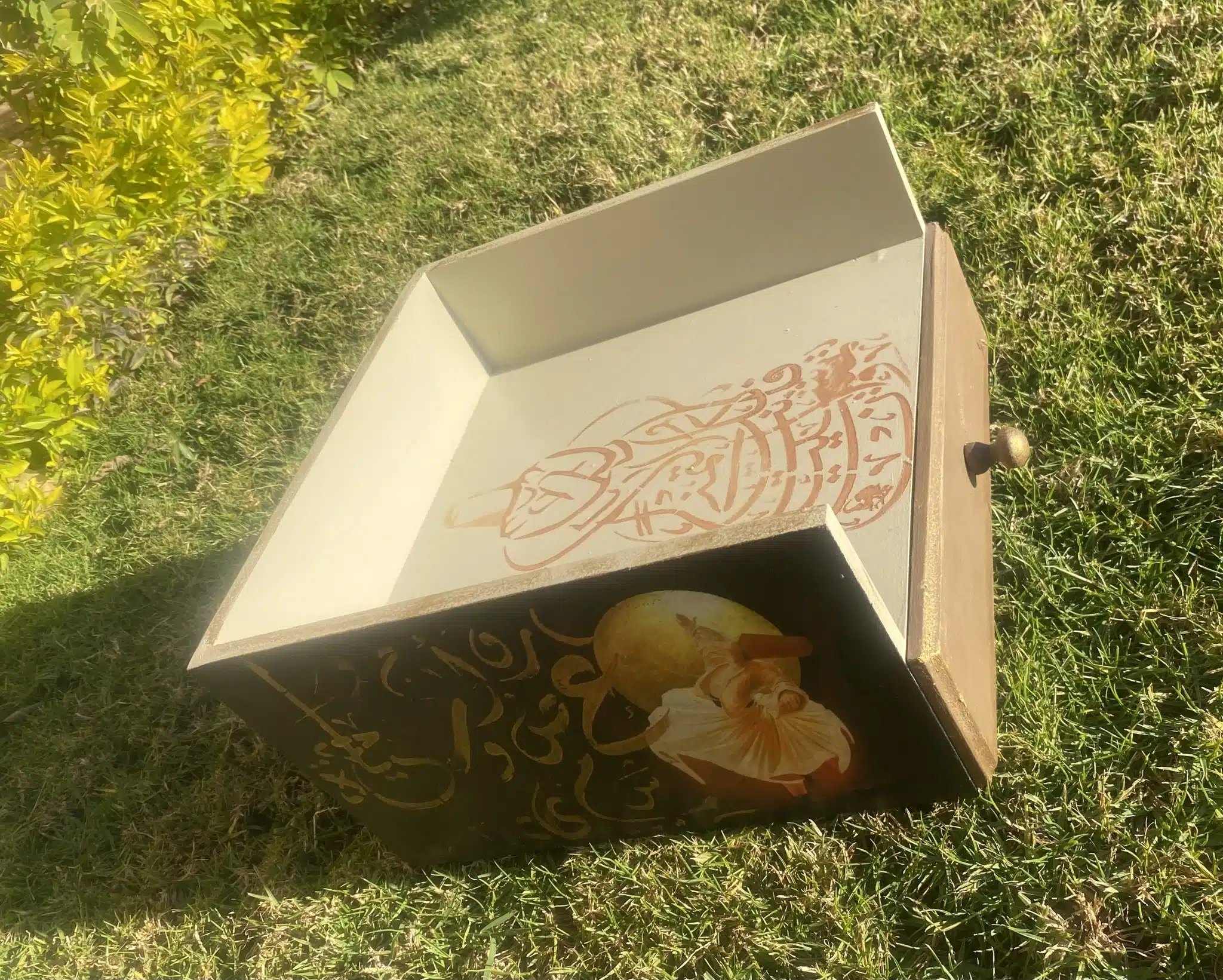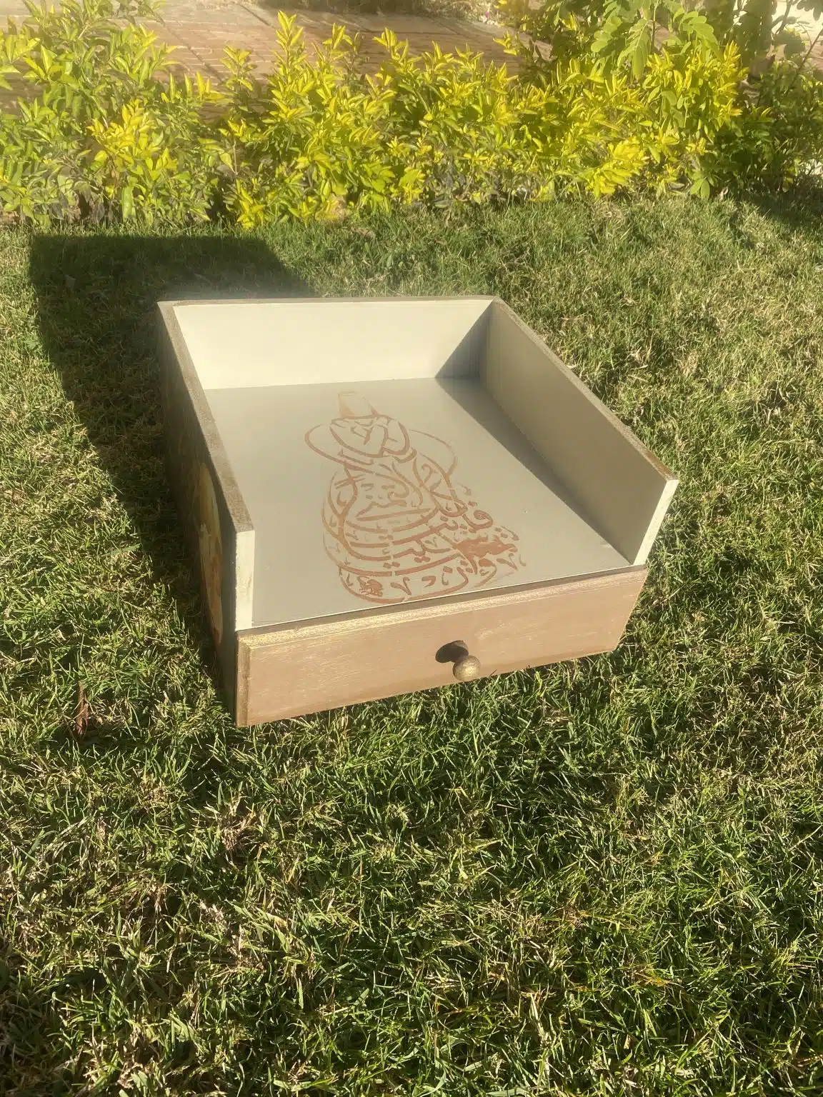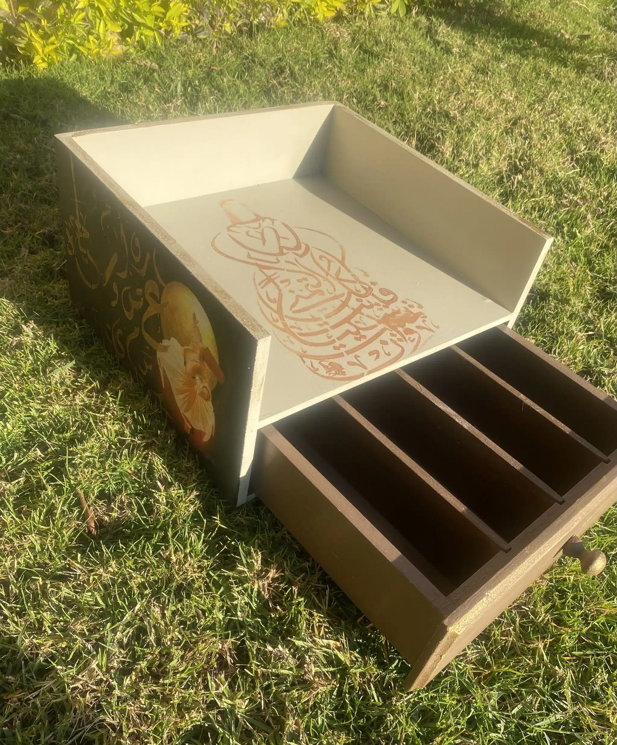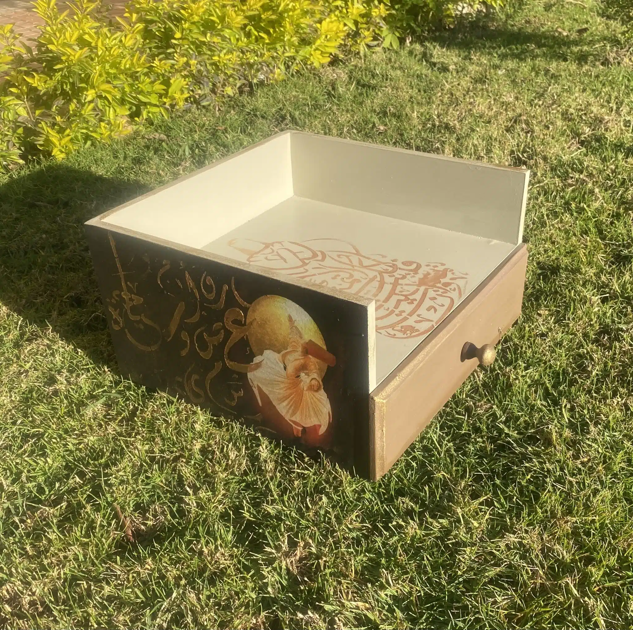 Wooden box for plates and cutlery organization in arabic calligraphy and dervish design