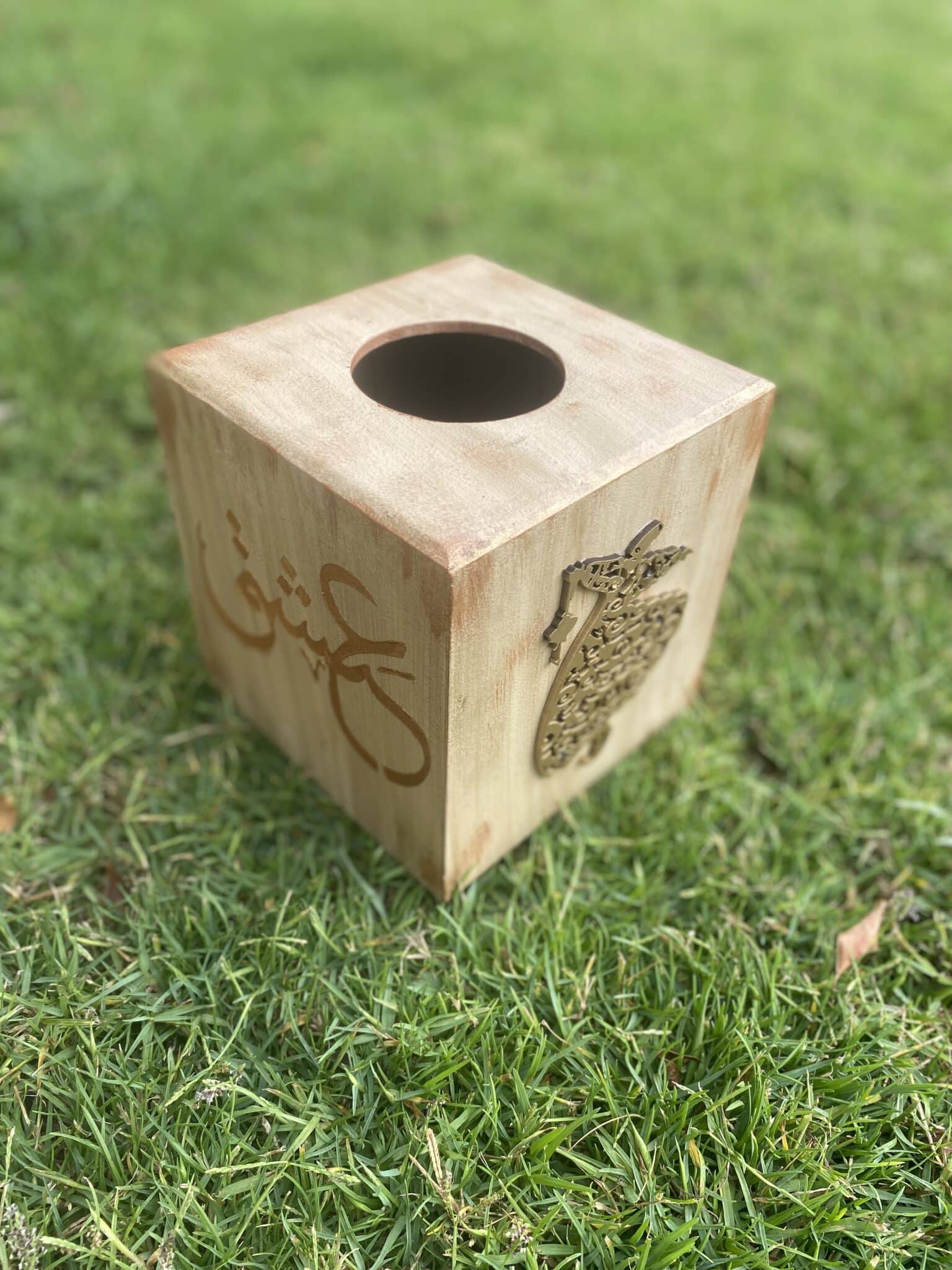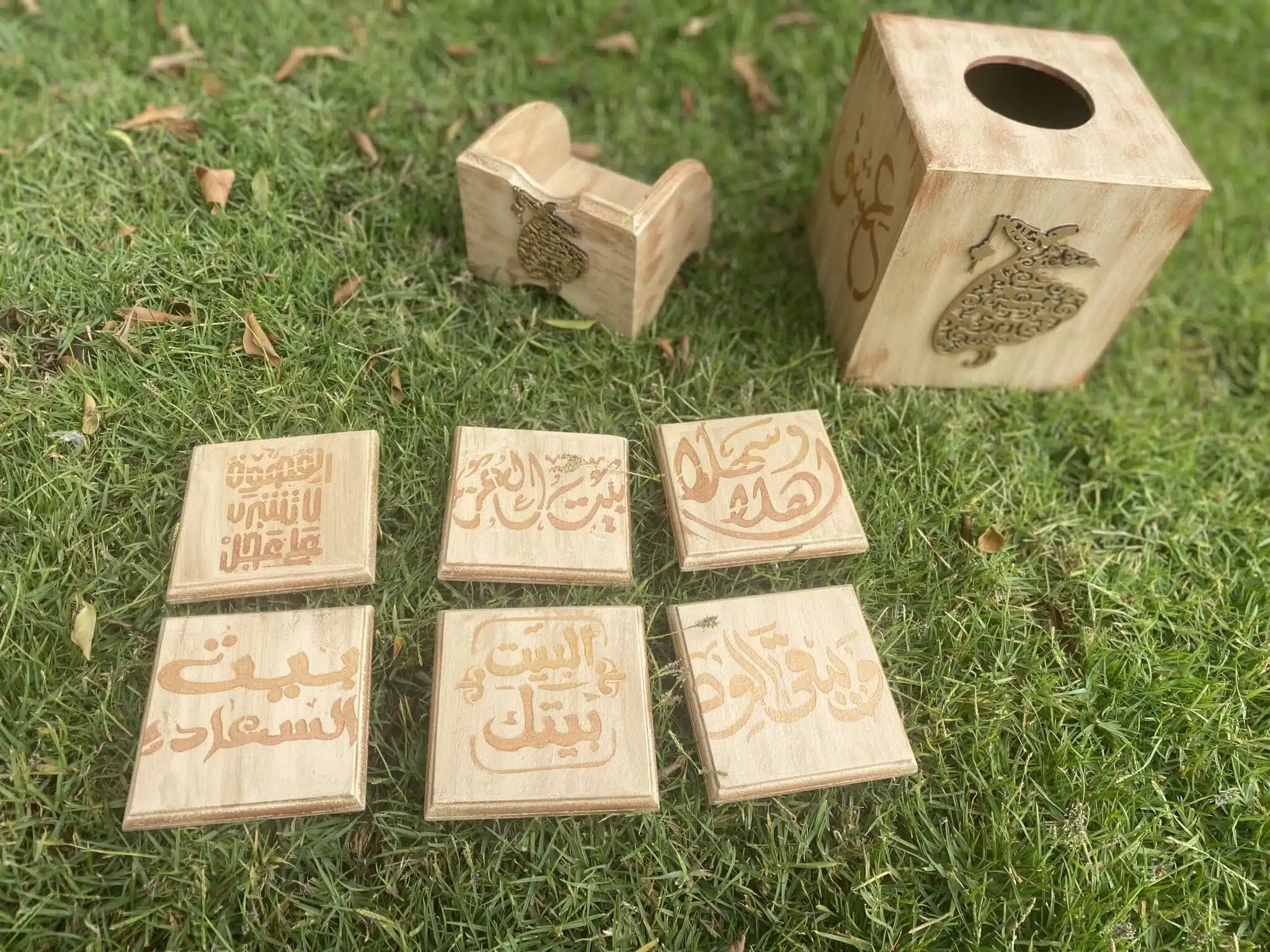 Wooden Set of tissue box and coasters in dervish design and arabic calligraphy