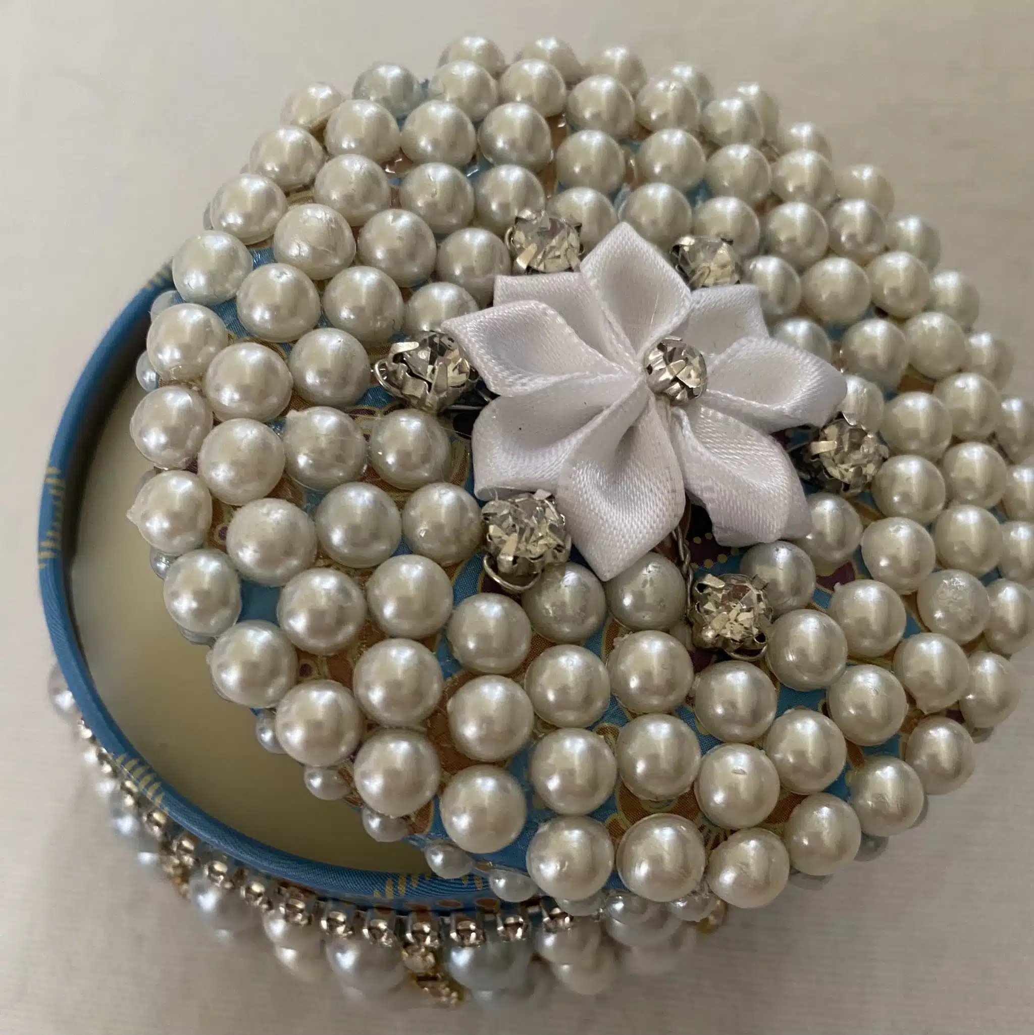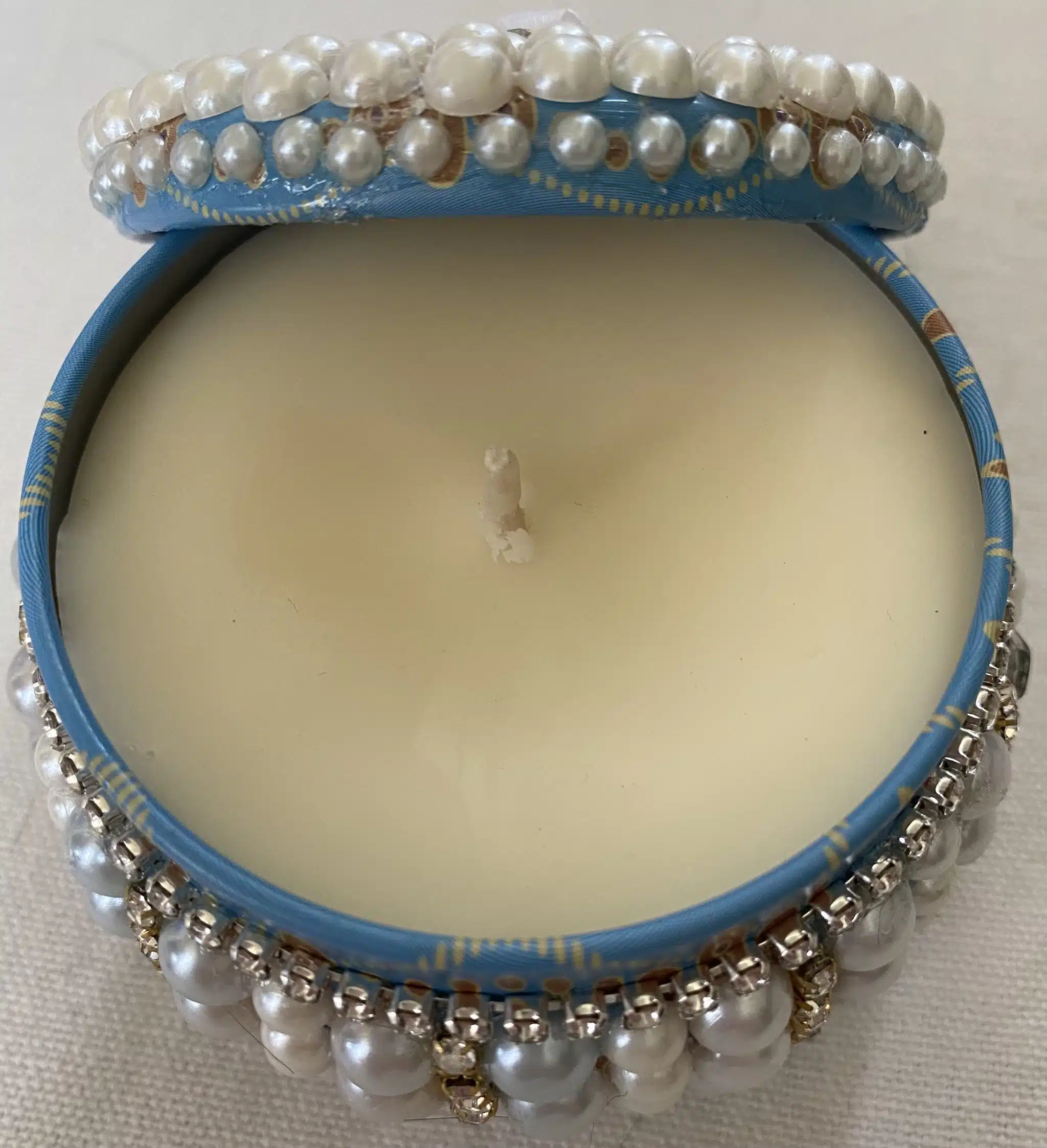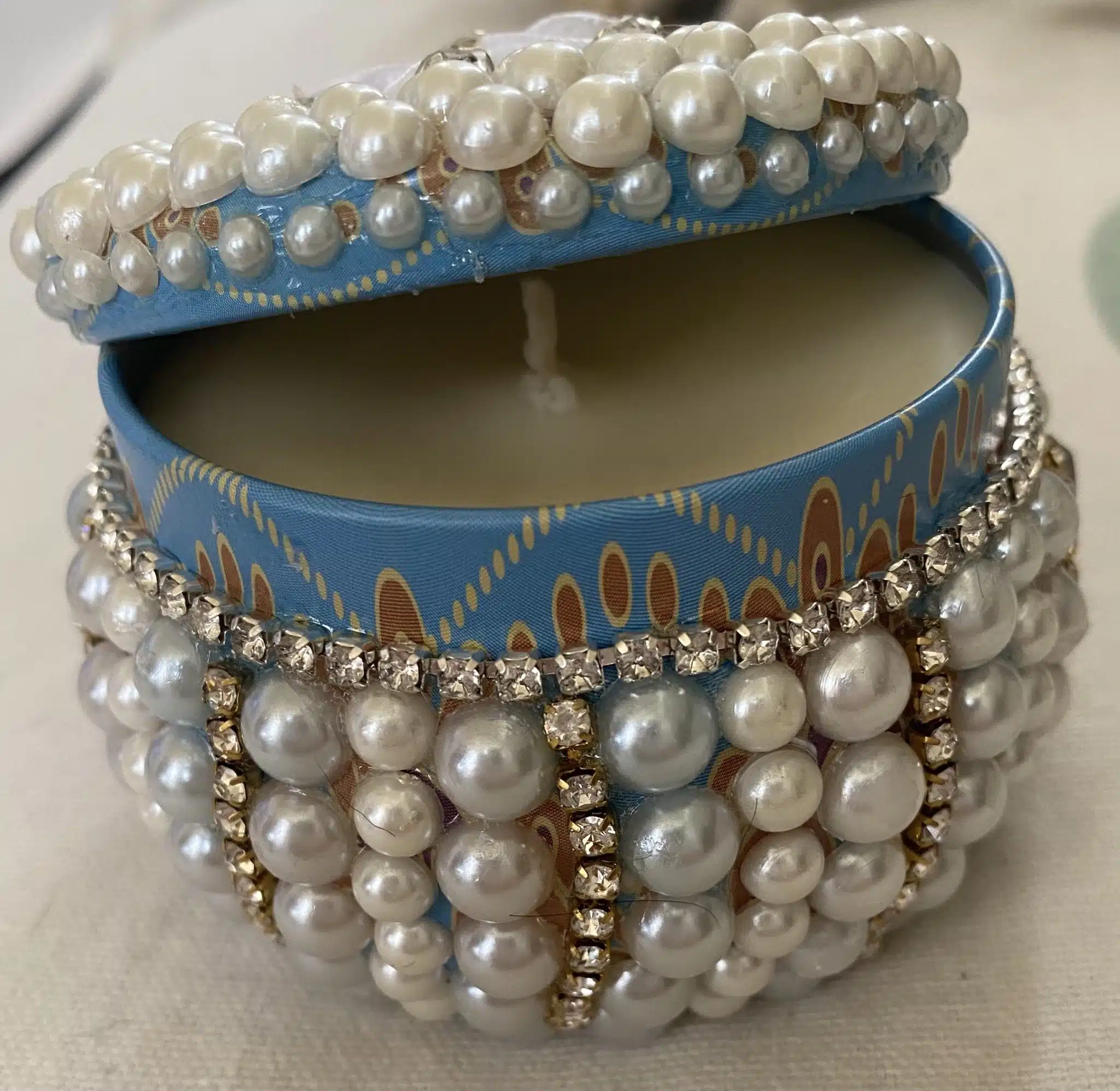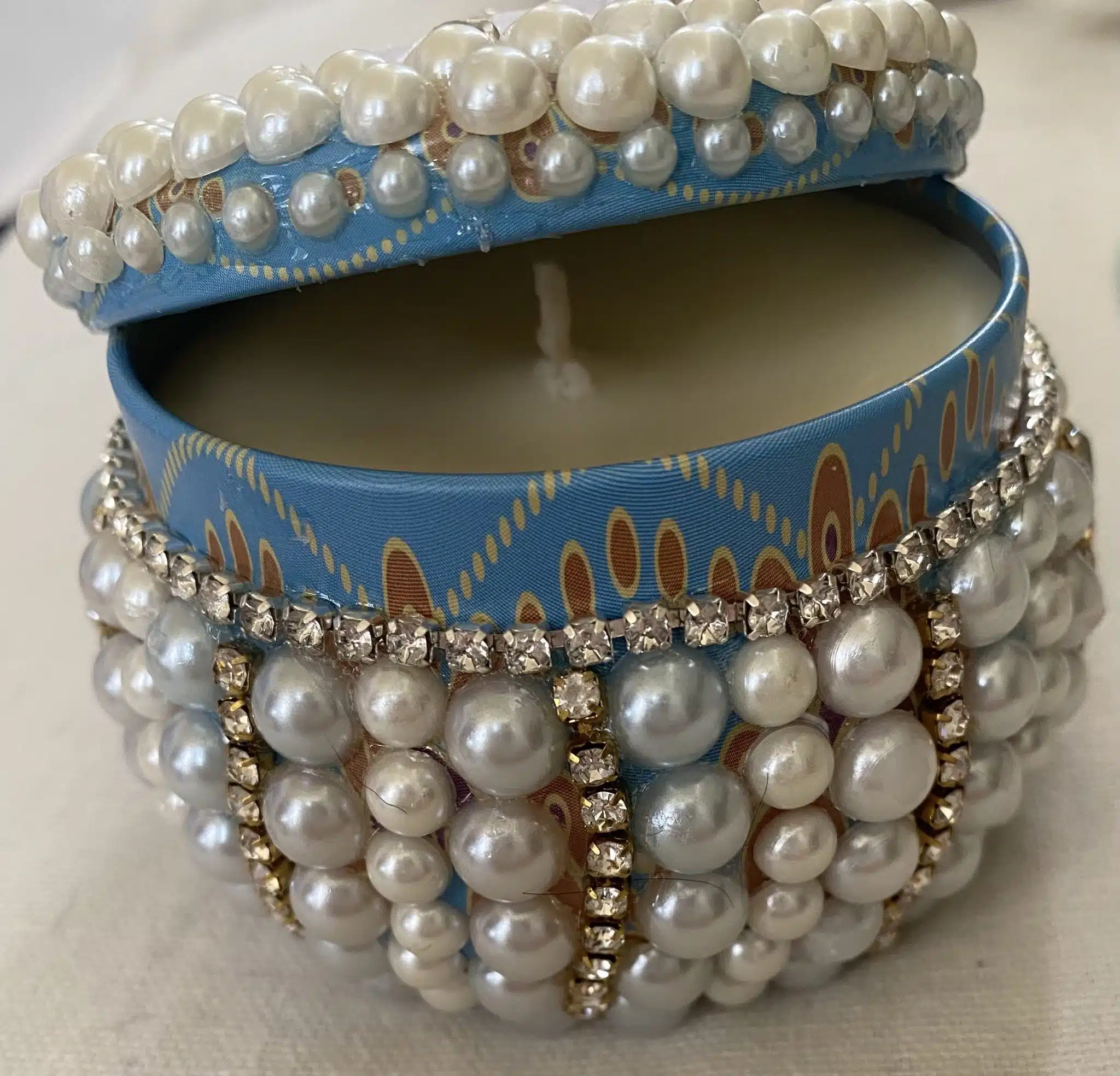 scented candle in a tin box decorated with pearls and diamonds