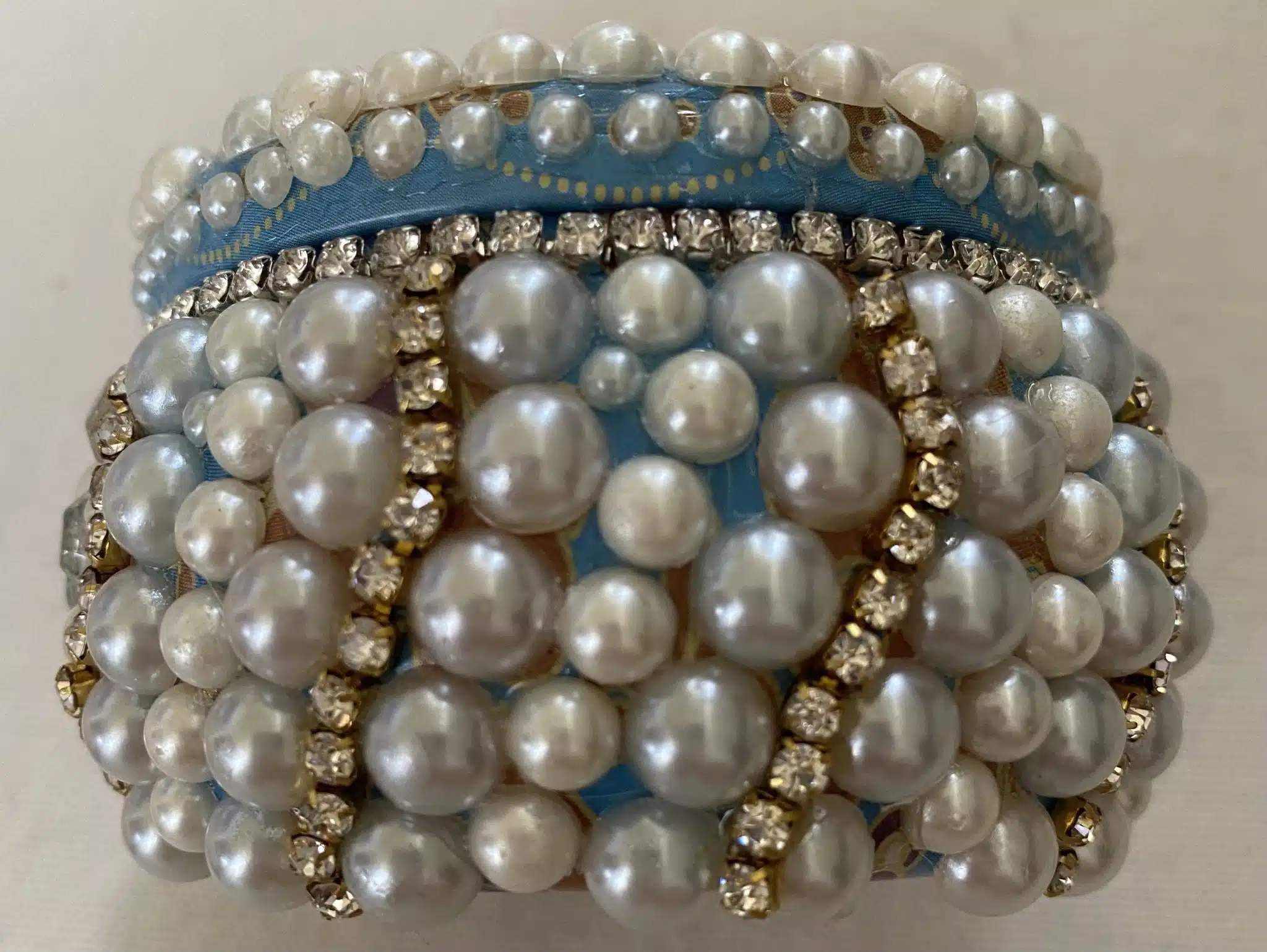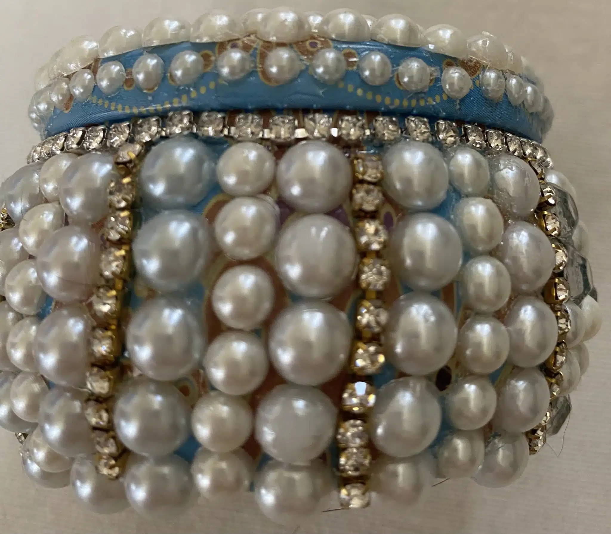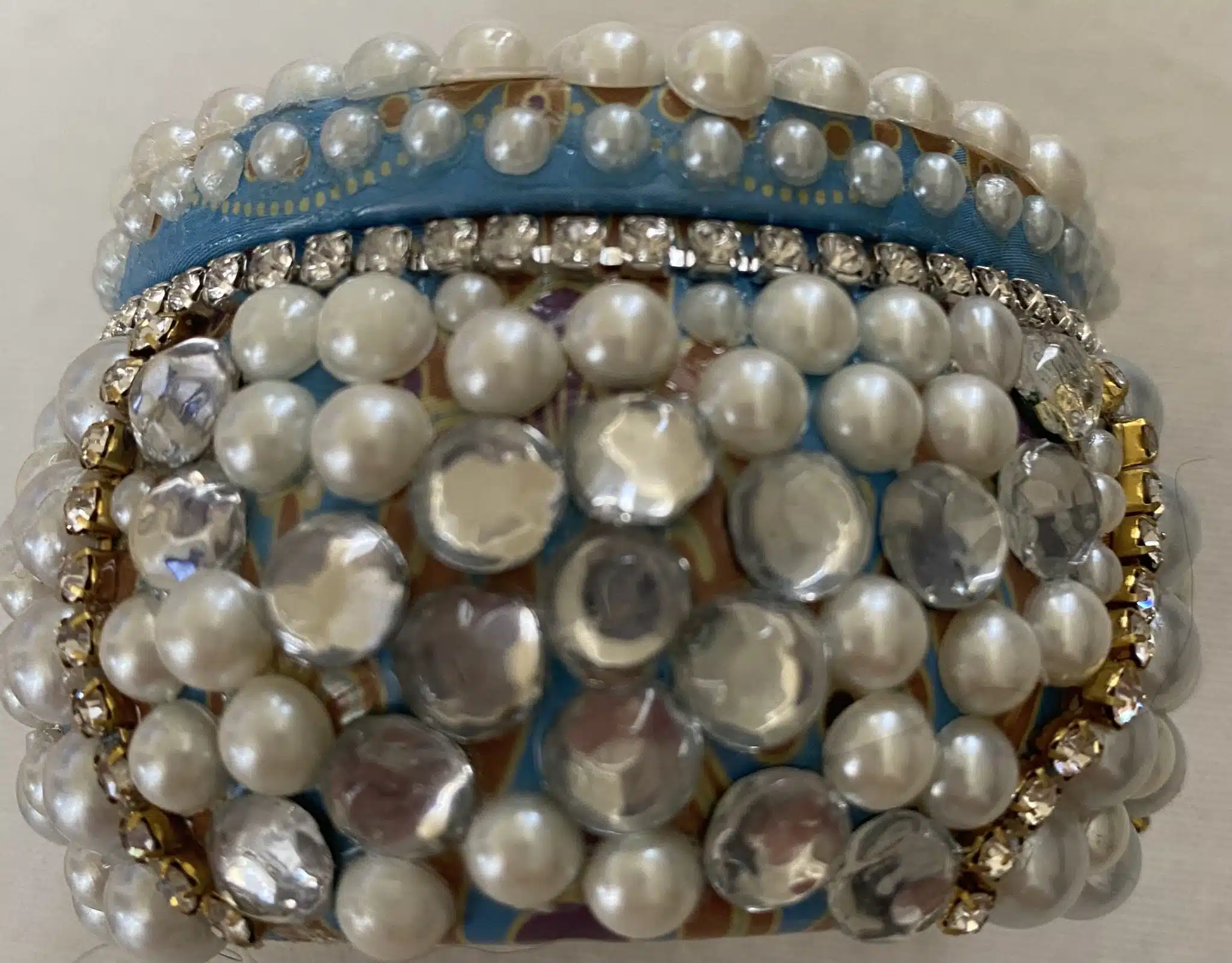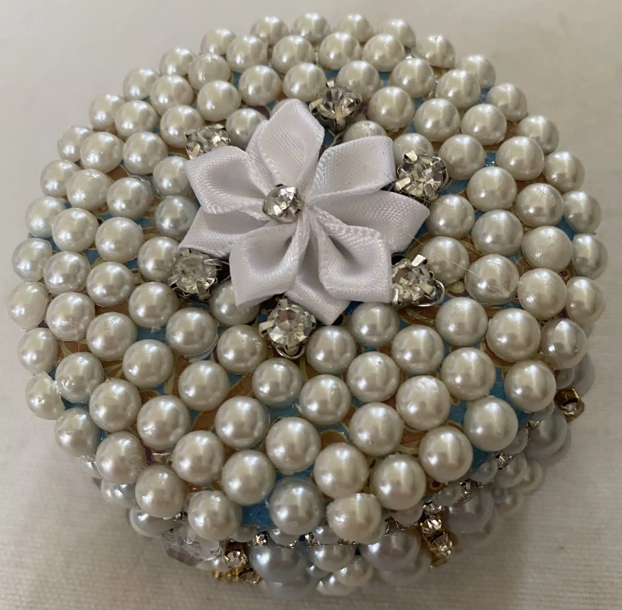 scented candle in a tin box decorated with pearls and diamonds