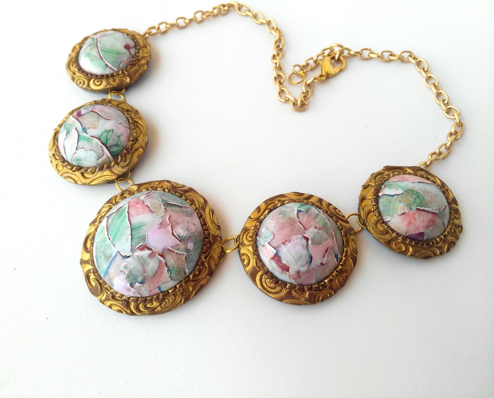 A delicate necklace featuring pastel pink and green polymer clay cabochons set in gold-tone bezels.
