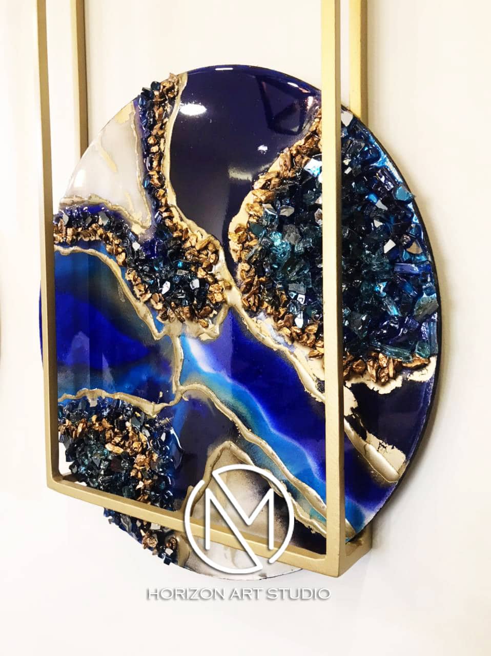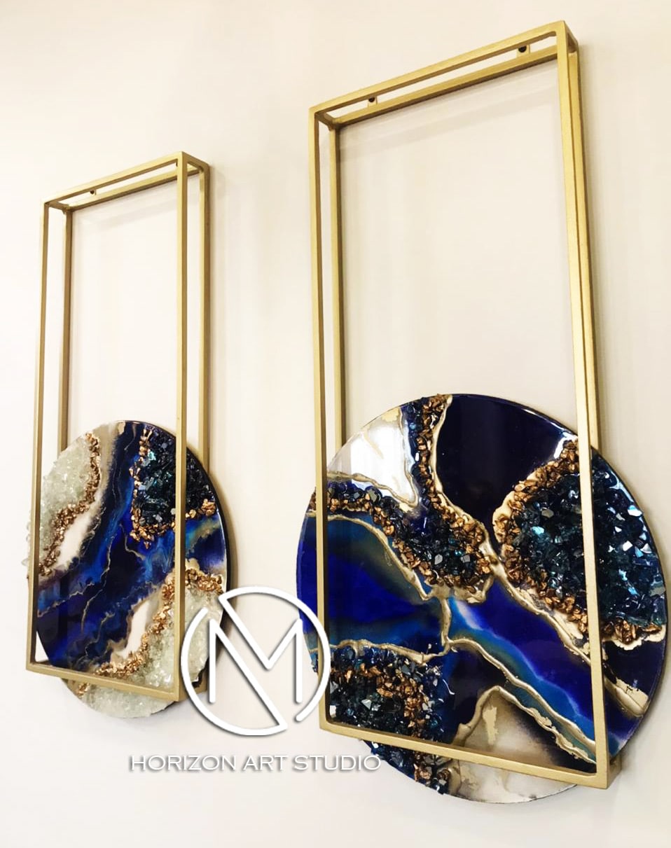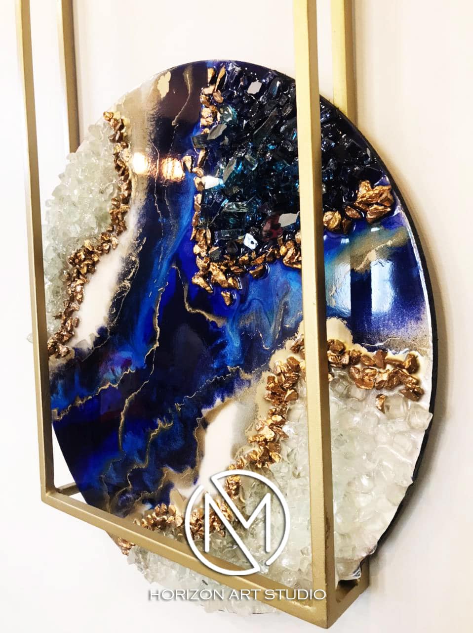 Resin on wood mixed with stones and crystals , Golden metal frame